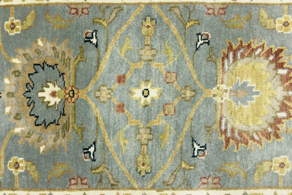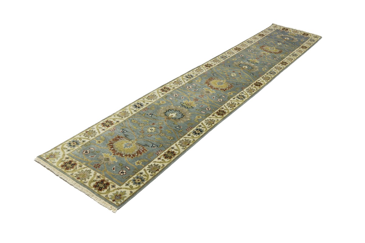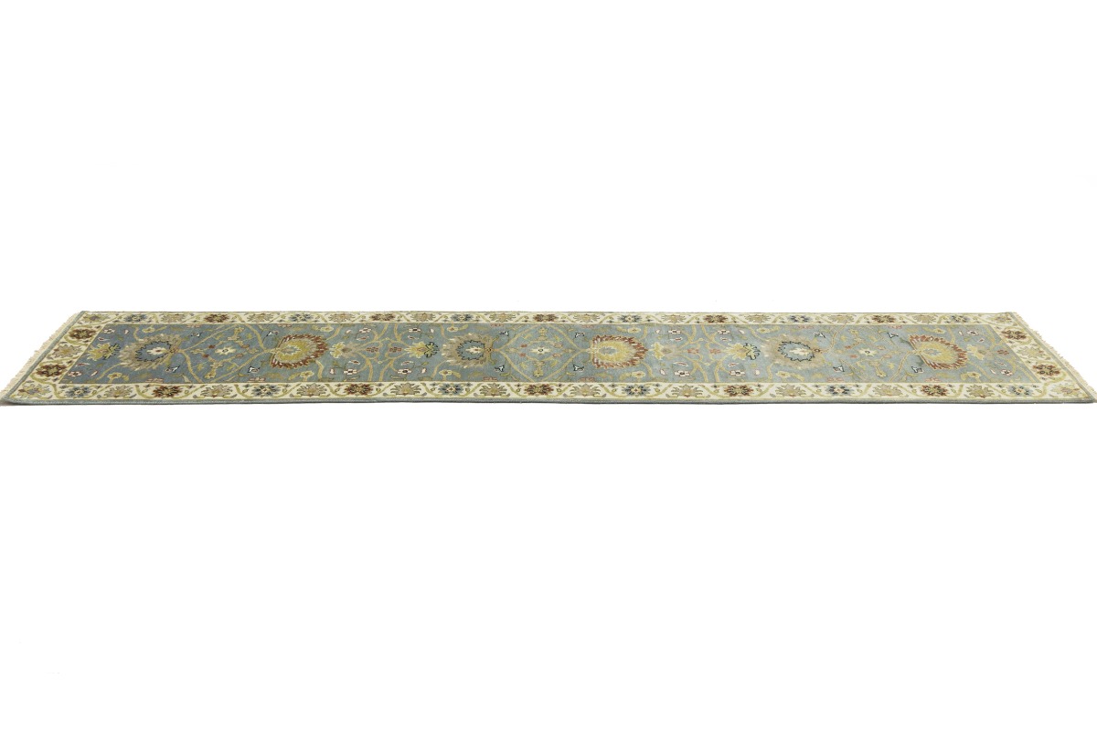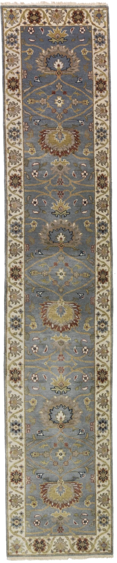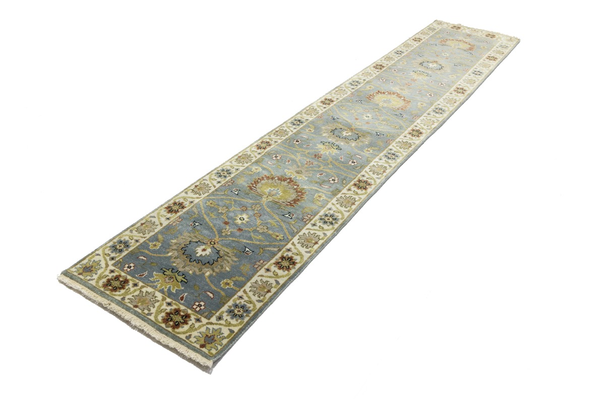 This authentic 2'5X12 blue-gray new Oriental runner was crafted by the hands of skilled weavers enthused by a variety of lovely artistic designs, to recreate the aged look of the unique piece with a richness of color and beautifully elaborated background field. What set this vintage style Oriental area runner from the others are the material and dye used (wool pile and cotton foundation), knot count, ancient designs, fantastic grades, and its regional historical connection: it has deep roots, from the story of the people who produced it to the meaning of the symbols and colors displayed across its canvas that have been praised for centuries. This Indian home décor carpet will be completely cozy and inviting that never will go out of style! Also, this Oriental rug would be among your most valuable treasures, it is a great investment that increase in value over time, and it will last for generations because was woven with high-quality, all-natural wool. Environmentally friendly, opulent yet affordable; this runner will give you a thorough amount of character to help define your living space with sophistication and warmth that will capture the eyes and attention of your audience (homeowners, designers, decorators, family and friends). OT-8338