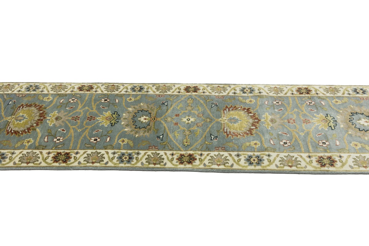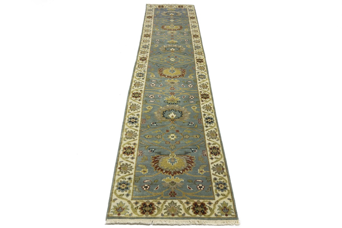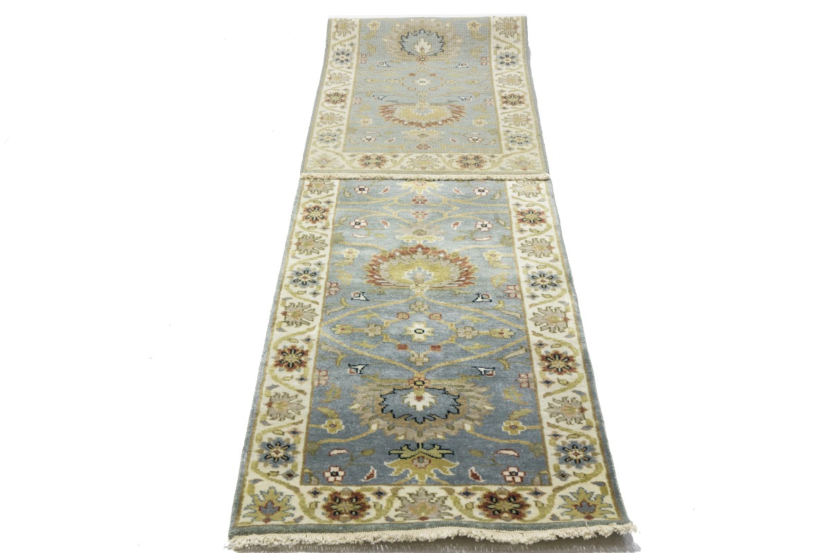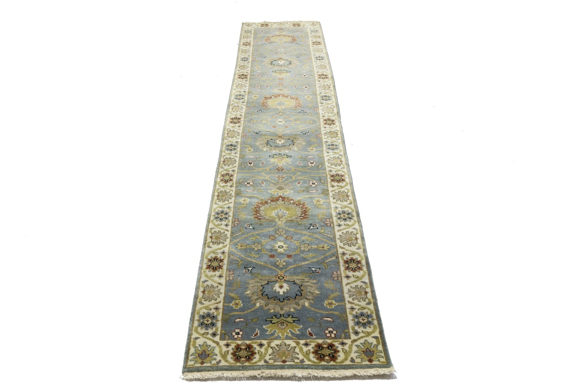 Hand Knotted 2'5X12 blue-gray oriental runner made with natural dyes (fine wool pile and cotton foundation), superior knot count, and appealing ancient designs. This Oriental runner never will go out of style and would be among your most valuable treasures.