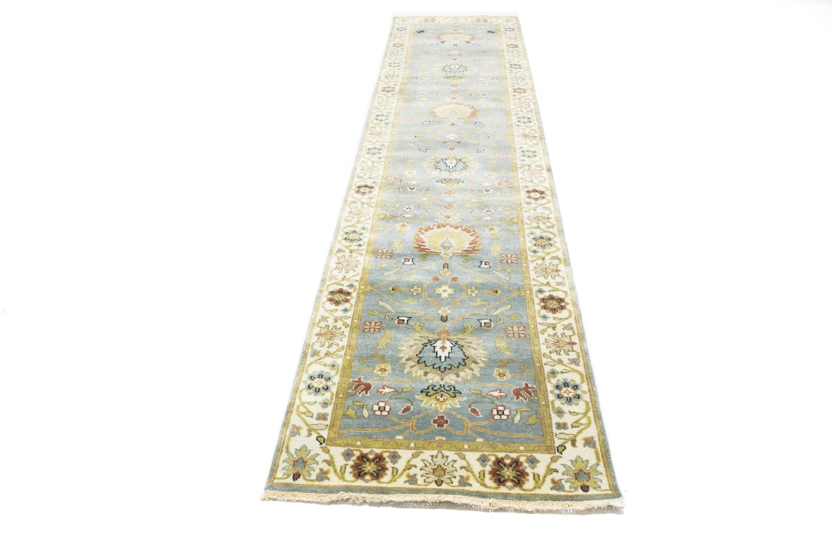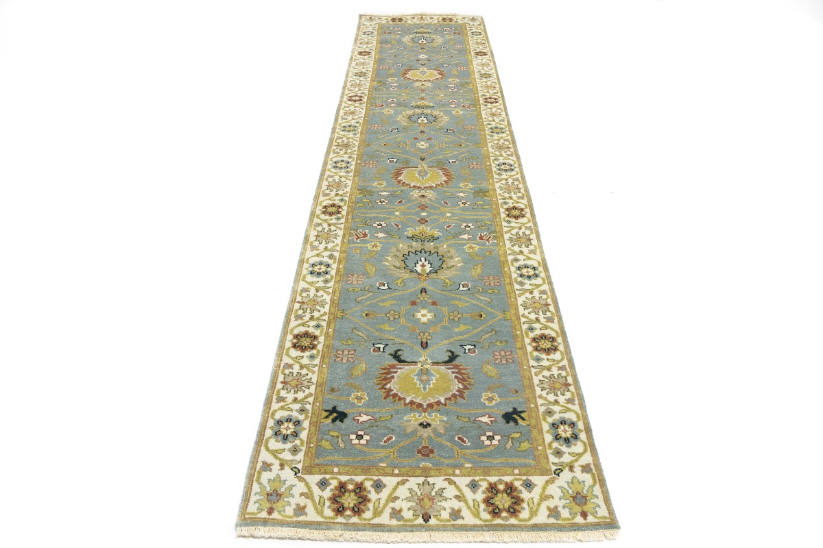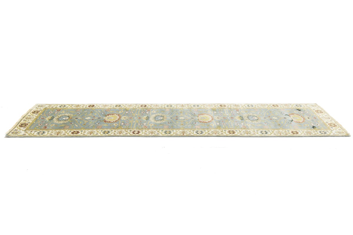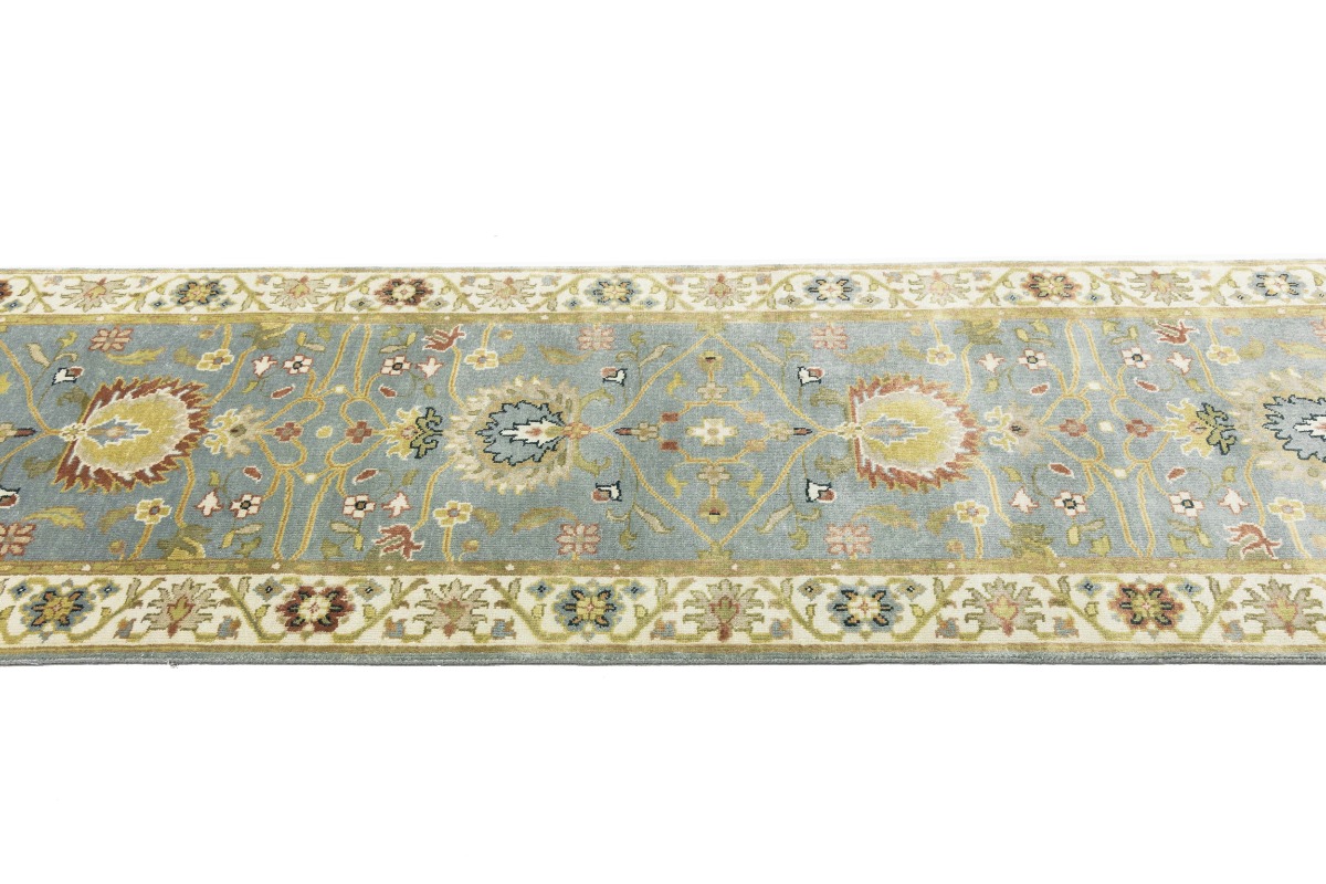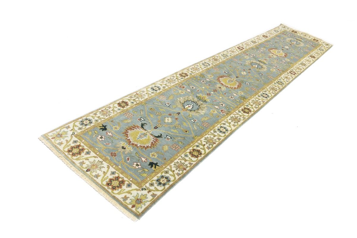 This authentic 3X13 blue-gray new Oriental runner was crafted by the hands of skilled weavers enthused by a variety of lovely artistic designs, to recreate the aged look of the unique piece with a richness of color and beautifully elaborated background field. What set this vintage style Oriental area runner from the others are the material and dye used (wool pile and cotton foundation), knot count, ancient designs, fantastic grades, and its regional historical connection: it has deep roots, from the story of the people who produced it to the meaning of the symbols and colors displayed across its canvas that have been praised for centuries. This Indian home décor carpet will be completely cozy and inviting that never will go out of style! Also, this Oriental rug would be among your most valuable treasures, it is a great investment that increase in value over time, and it will last for generations because was woven with high-quality, all-natural wool. Environmentally friendly, opulent yet affordable; this runner will give you a thorough amount of character to help define your living space with sophistication and warmth that will capture the eyes and attention of your audience (homeowners, designers, decorators, family and friends). OT-8340