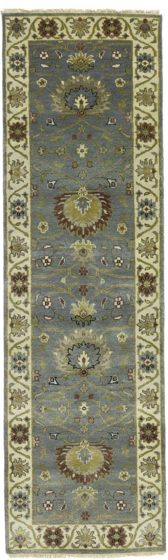 Handmade 3X8 blue-gray oriental runner made with vegetable dyes (fine wool pile and cotton foundation), superior knot count, and appealing ancient designs. This Oriental runner never will go out of style and would be among your most valuable treasures.