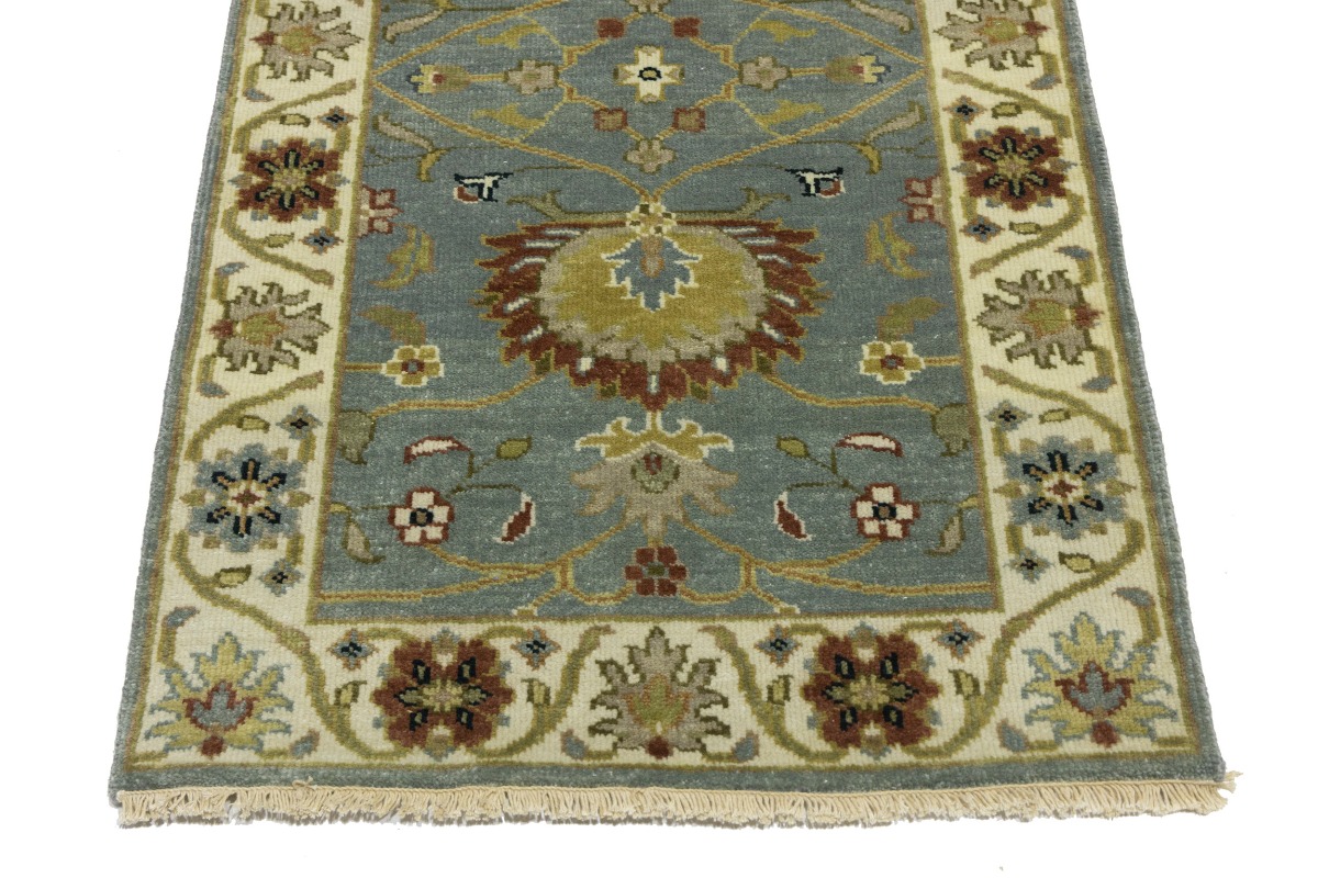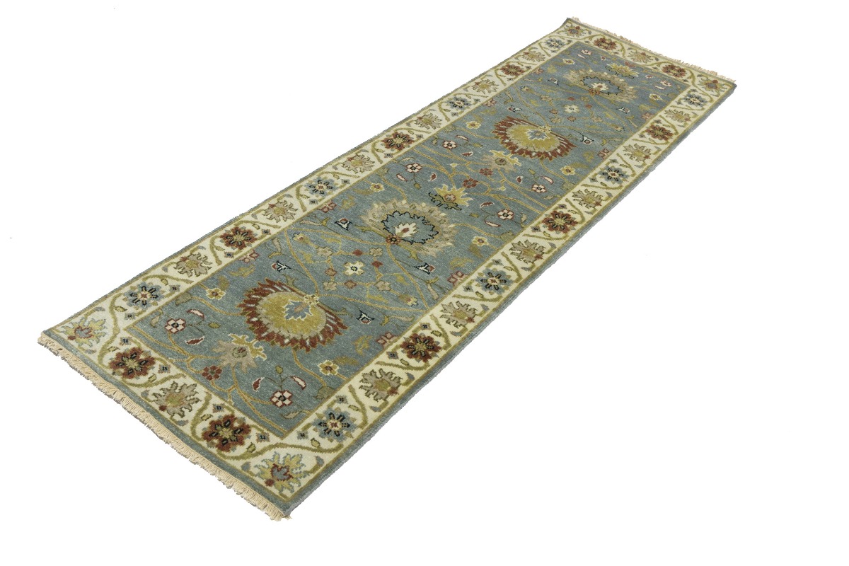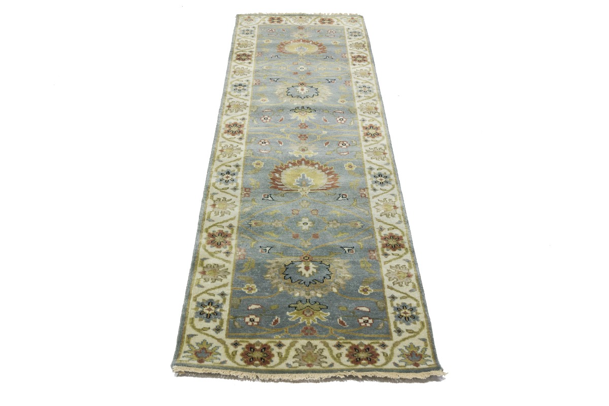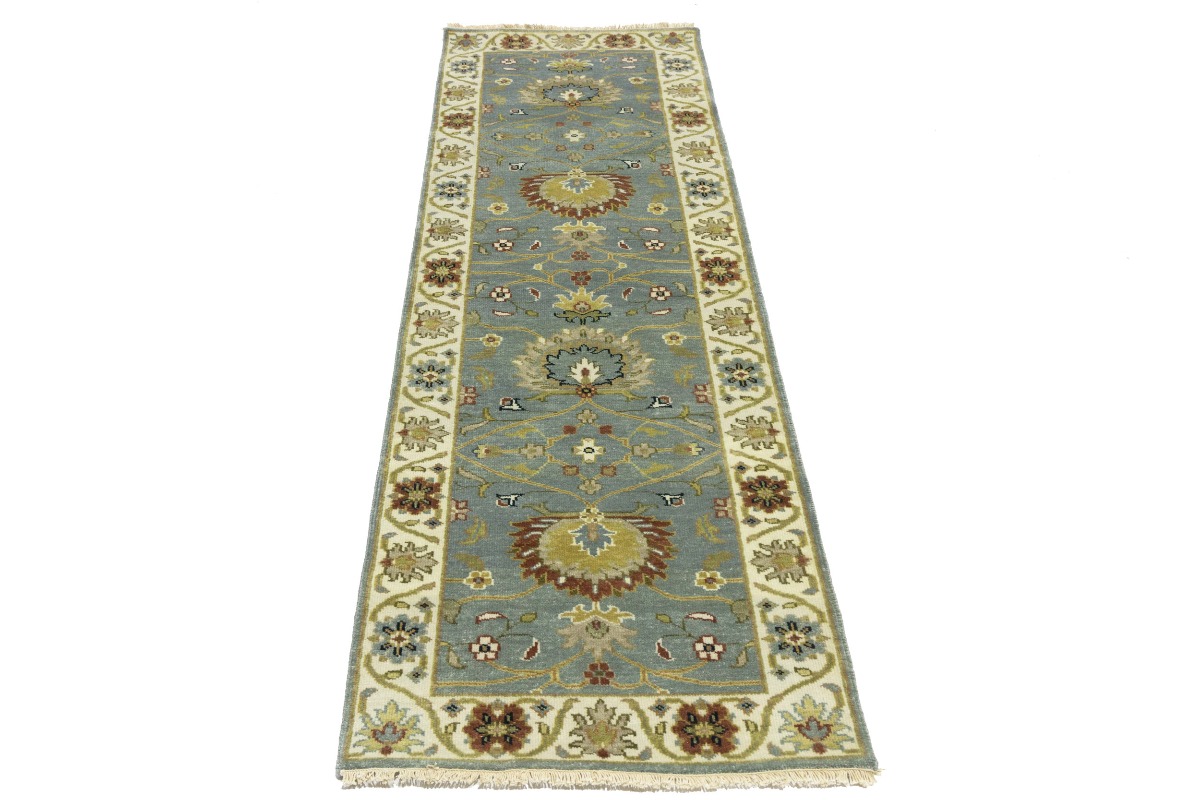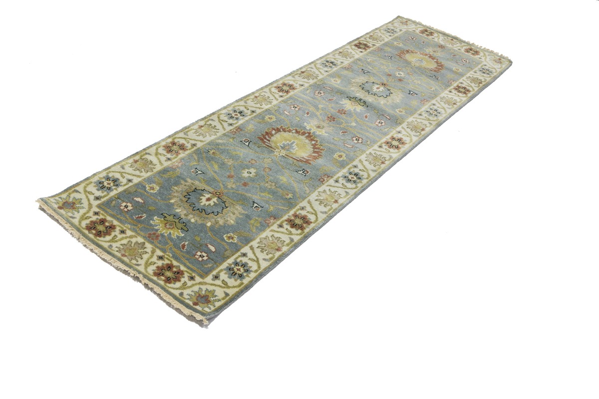 This authentic 3X8 blue-gray new Oriental runner was crafted by the hands of skilled weavers enthused by a variety of lovely artistic designs, to recreate the aged look of the unique piece with a richness of color and beautifully elaborated background field. What set this vintage style Oriental area runner from the others are the material and dye used (wool pile and cotton foundation), knot count, ancient designs, fantastic grades, and its regional historical connection: it has deep roots, from the story of the people who produced it to the meaning of the symbols and colors displayed across its canvas that have been praised for centuries. This Indian home décor carpet will be completely cozy and inviting that never will go out of style! Also, this Oriental rug would be among your most valuable treasures, it is a great investment that increase in value over time, and it will last for generations because was woven with high-quality, all-natural wool. Environmentally friendly, opulent yet affordable; this runner will give you a thorough amount of character to help define your living space with sophistication and warmth that will capture the eyes and attention of your audience (homeowners, designers, decorators, family and friends). OT-8697