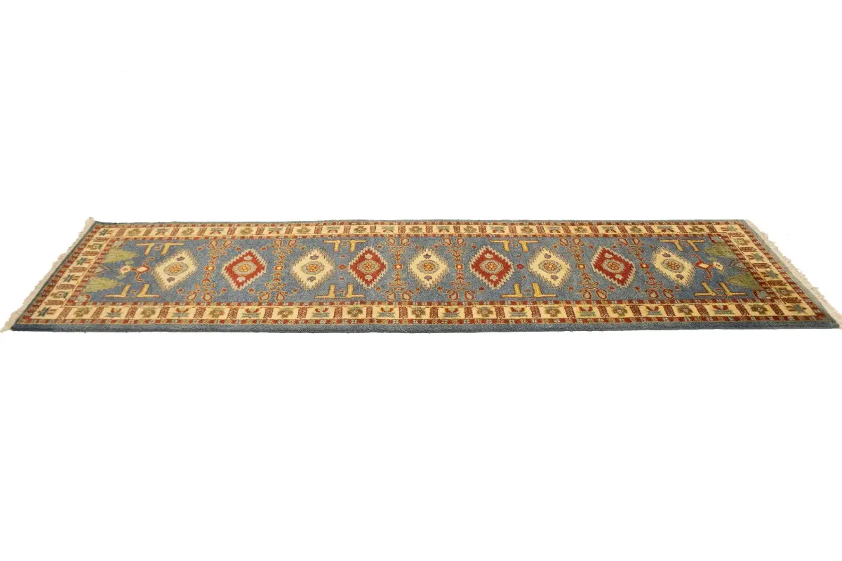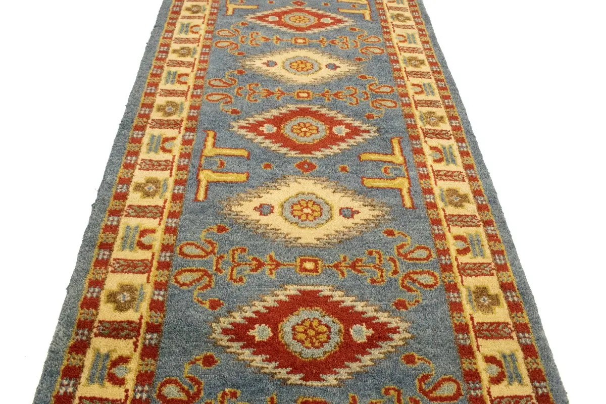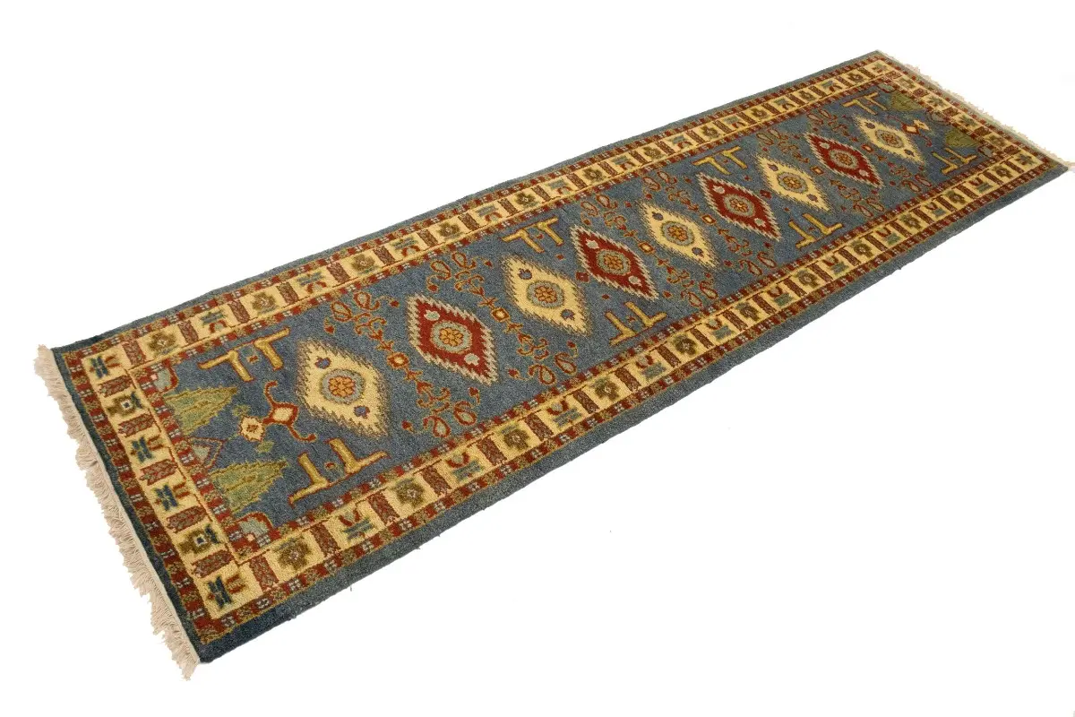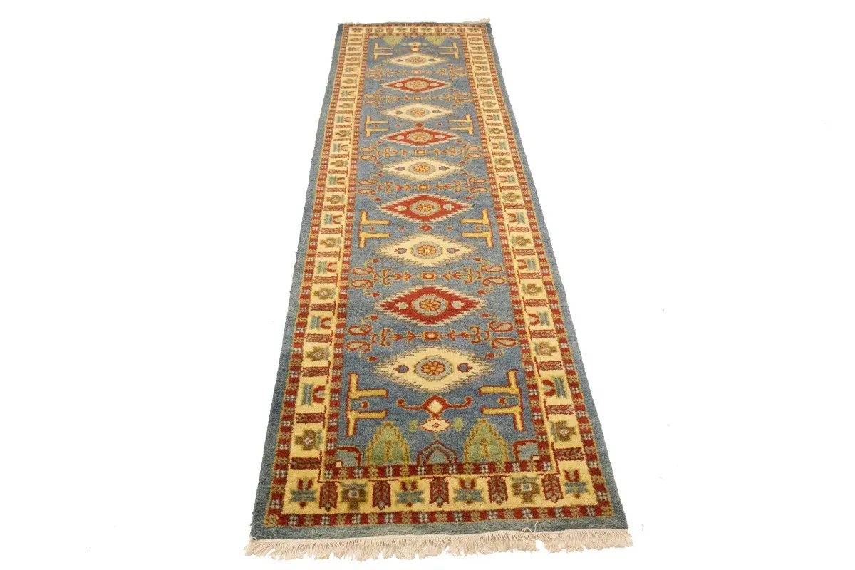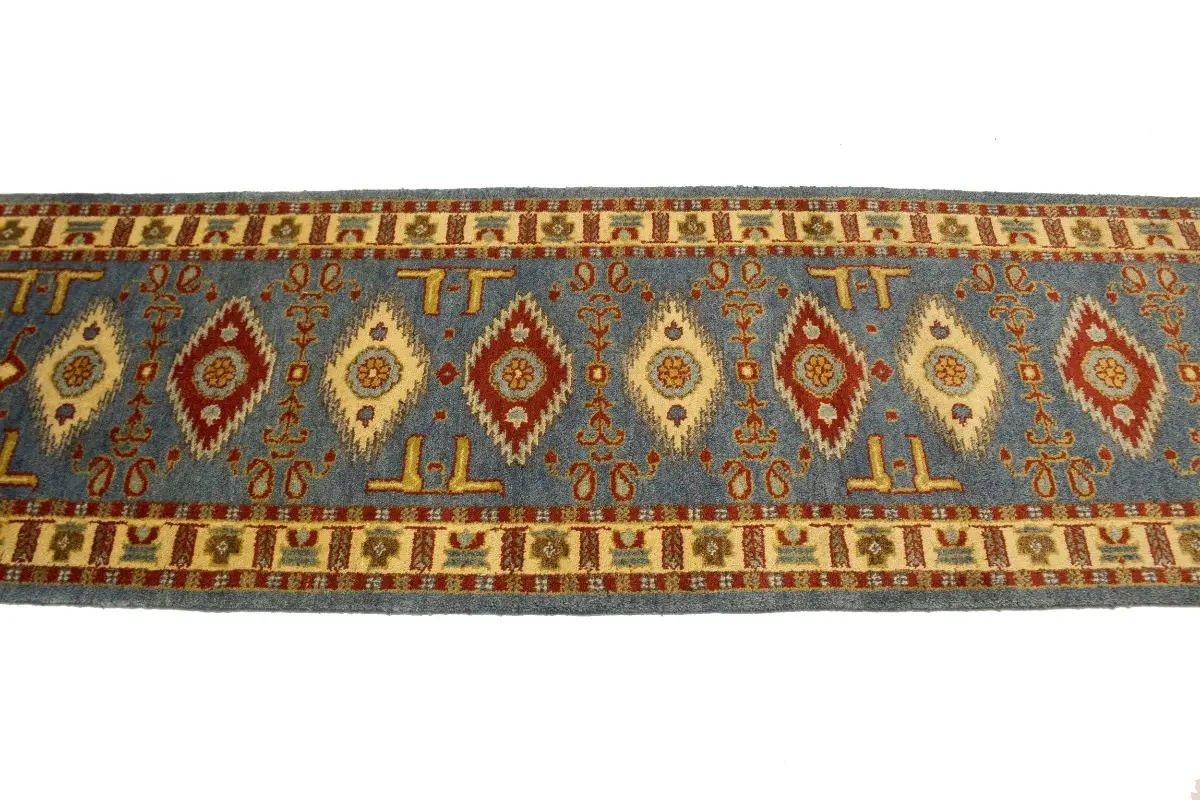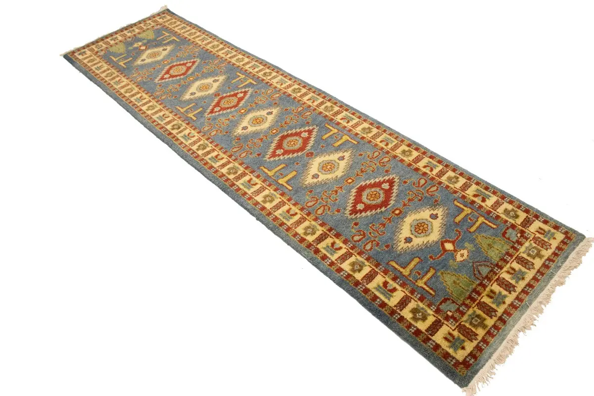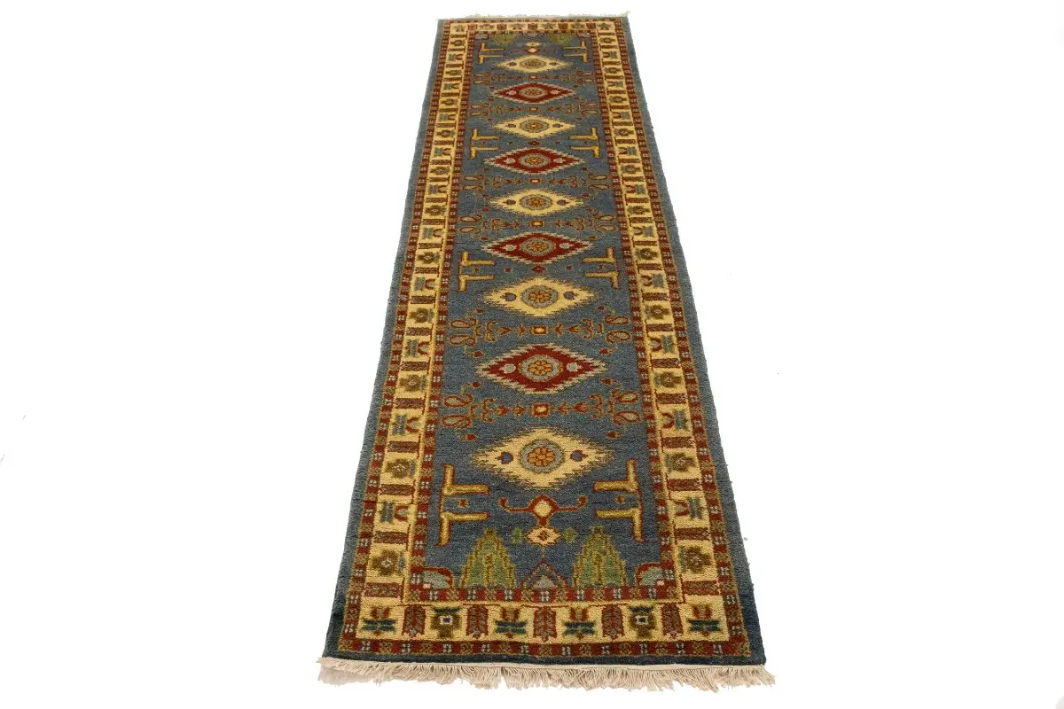 Blue-gray Geometric 3X10 Kazak Oriental Runner Rug