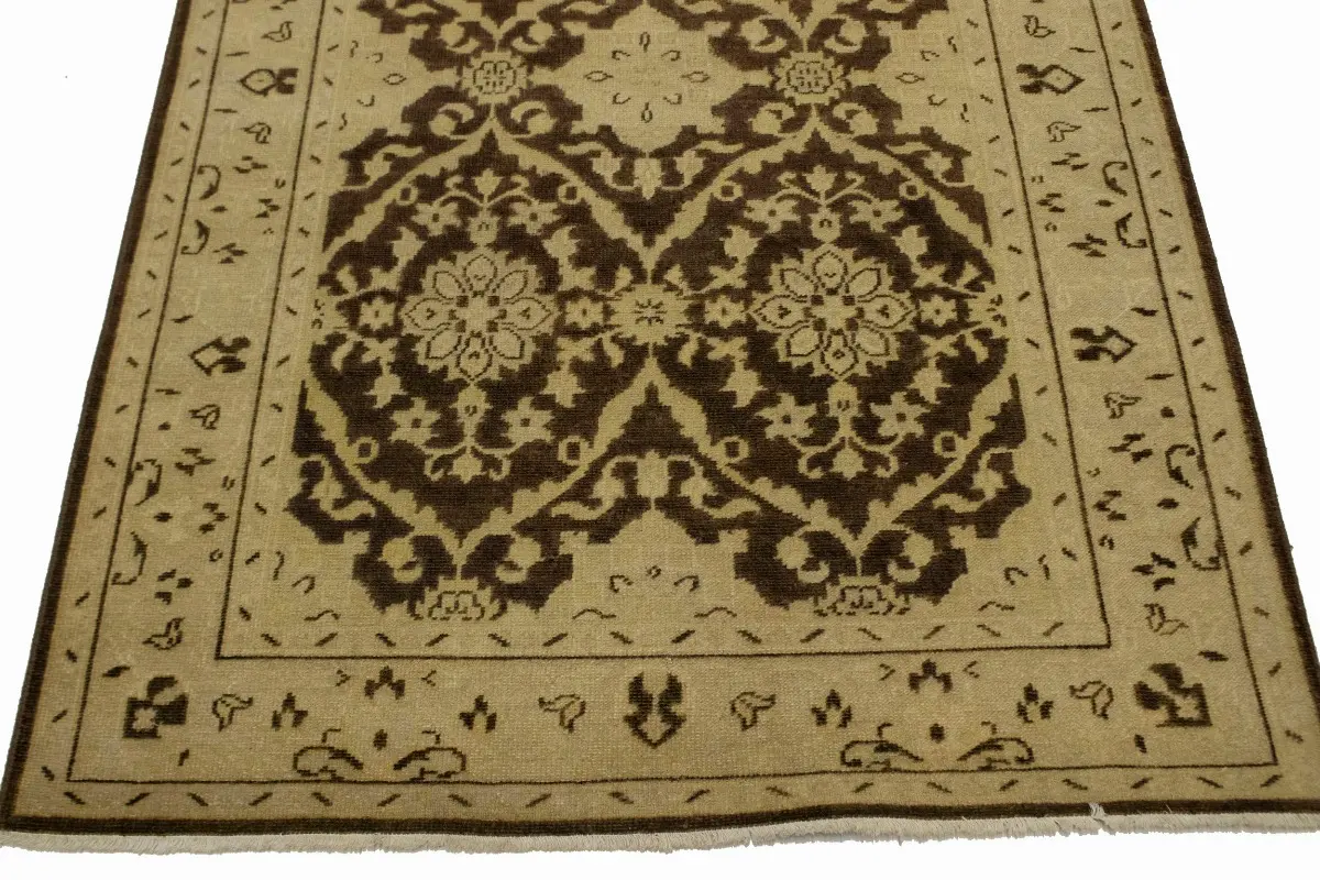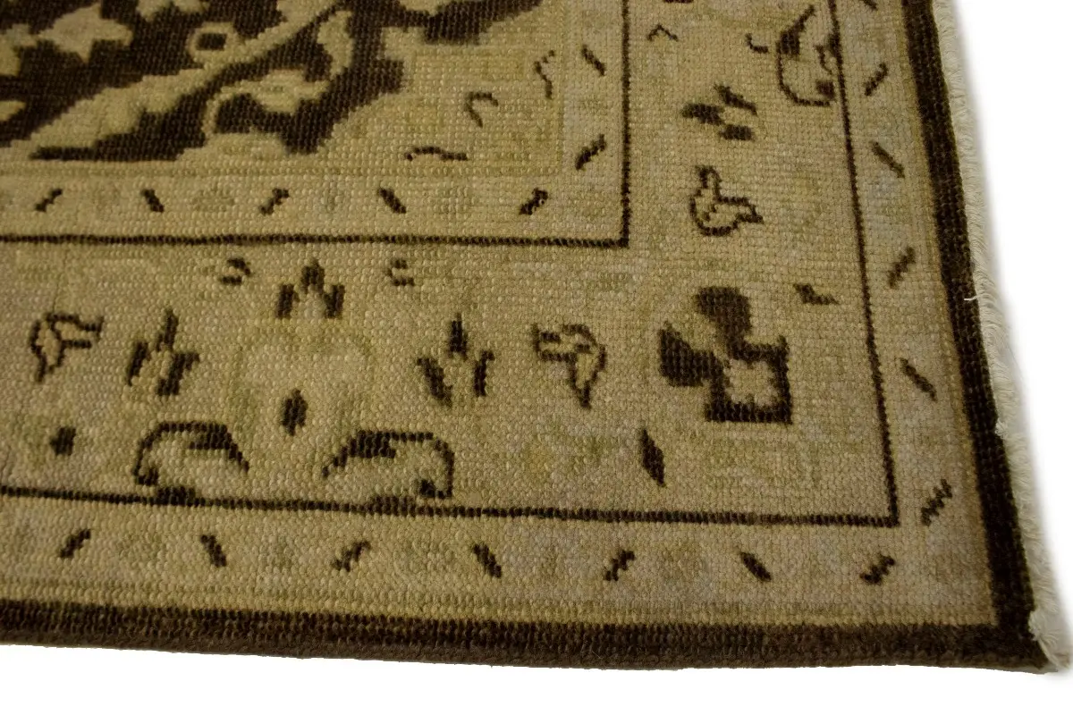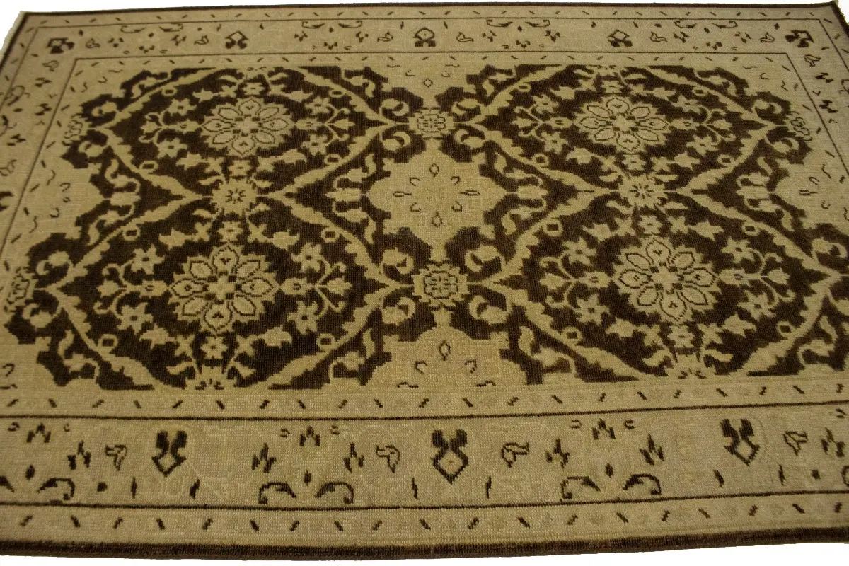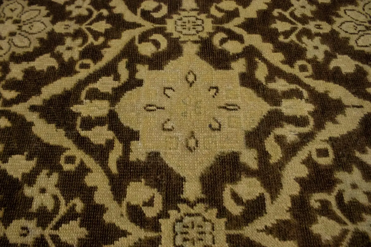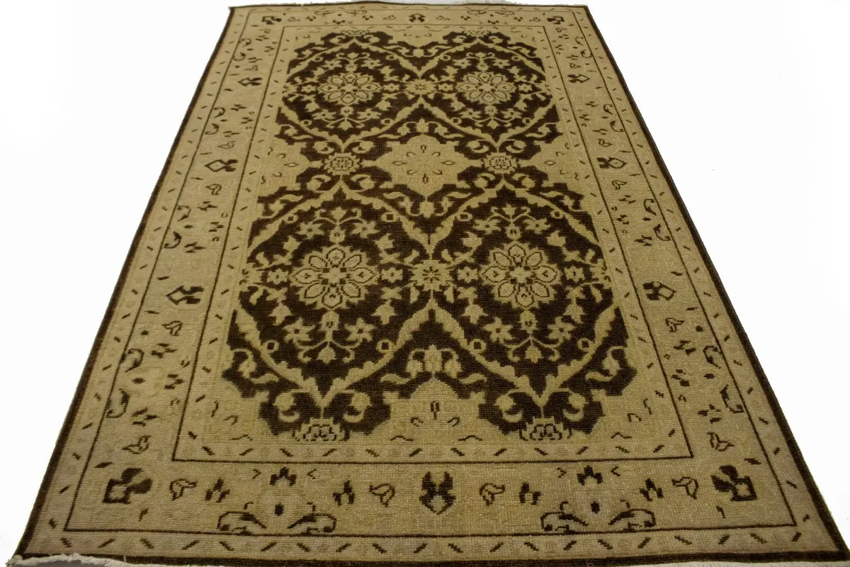 This authentic 5'5X8'7 brown new Oriental rug was masterly knotted by the hands of weavers inspired by a variety of wonderful artistic designs, to recreate the aged look of the original piece with a richness of color and intricate patterned background field. What set this vintage style Oriental area rug from the others are the material and dye used (wool pile and cotton foundation), knot count, antique designs, fantastic grades, and its regional historical connection: it has deep roots, from the story of the people who produced it to the meaning of the symbols and colors displayed across its canvas that have been praised for centuries. This Indian home décor carpet will be completely cozy and inviting that never will go out of style! Also, this Oriental rug would be among your most valuable treasures, it is a great investment that accrues value over time, and it will last for generations because was woven with high-quality, all-natural wool. Environmentally friendly, opulent yet affordable; this rug/runner will give you a thorough amount of character to help define your living space with luxury and warmth that will capture the eyes and attention of your audience (homeowners, designers, decorators, family and friends). OT-3443