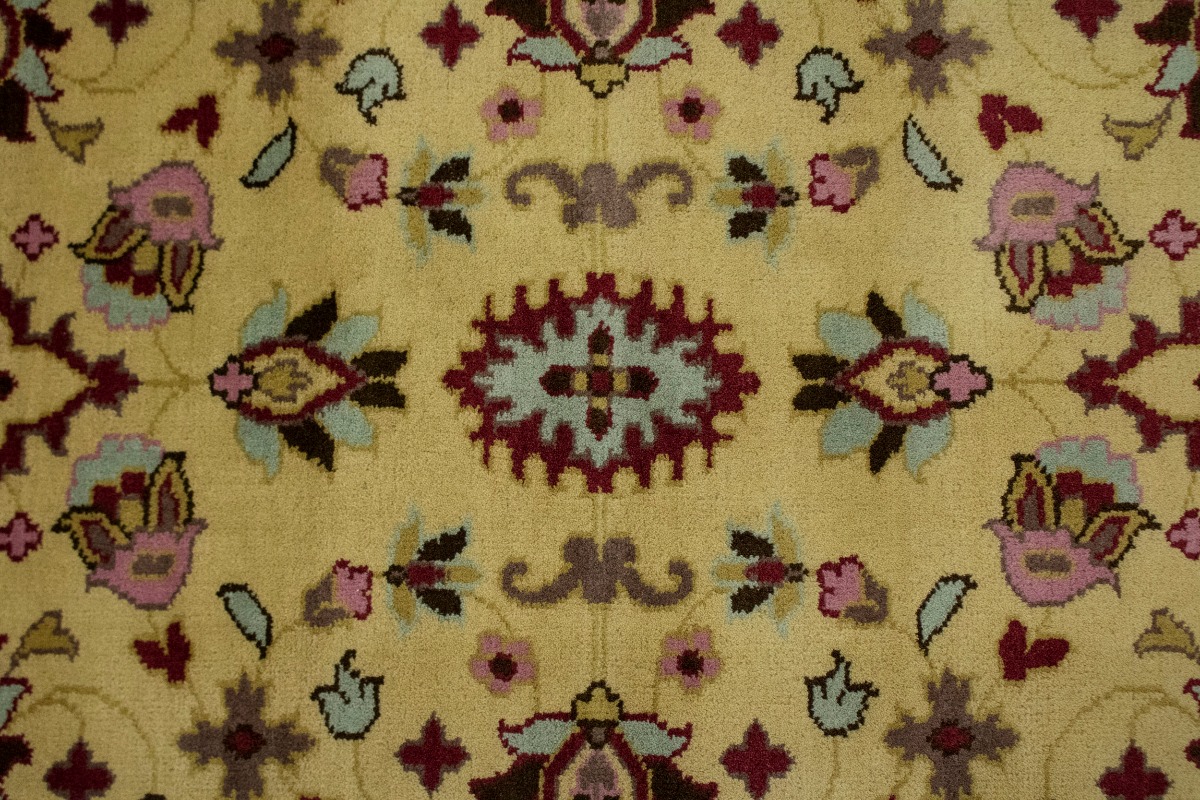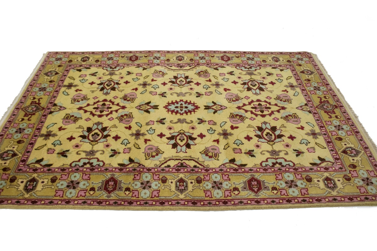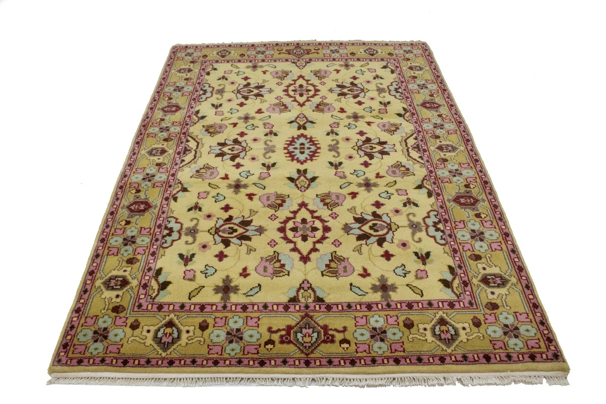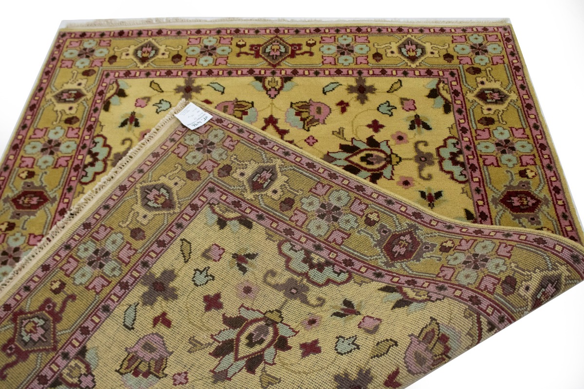 This genuine 5’5X7’6 beige new Oriental rug was finely knotted by the hands of weavers influenced by a variety of amazing artistic designs, to recreate the aged look of the exceptional piece with a richness of color and embellished background field. What set this vintage style Oriental area rug from the others are the material and dye used (wool pile and cotton foundation), knot count, antique designs, fantastic grades, and its regional historical connection: it has deep roots, from the story of the people who produced it to the meaning of the symbols and colors displayed across its canvas that have been praised for centuries. This Indian home décor carpet will be completely cozy and inviting that never will go out of style! Also, this Oriental rug would be among your most valuable treasures, it is a great investment that increase in value over time, and it will last a lifetime because was woven with high-quality, all-natural wool. Eco-friendly, opulent yet affordable; this rug/runner will give you an extra pop of character to help define your home environment with luxury and warmth that will capture the eyes and attention of your audience (homeowners, designers, decorators, family and friends). OT-1046