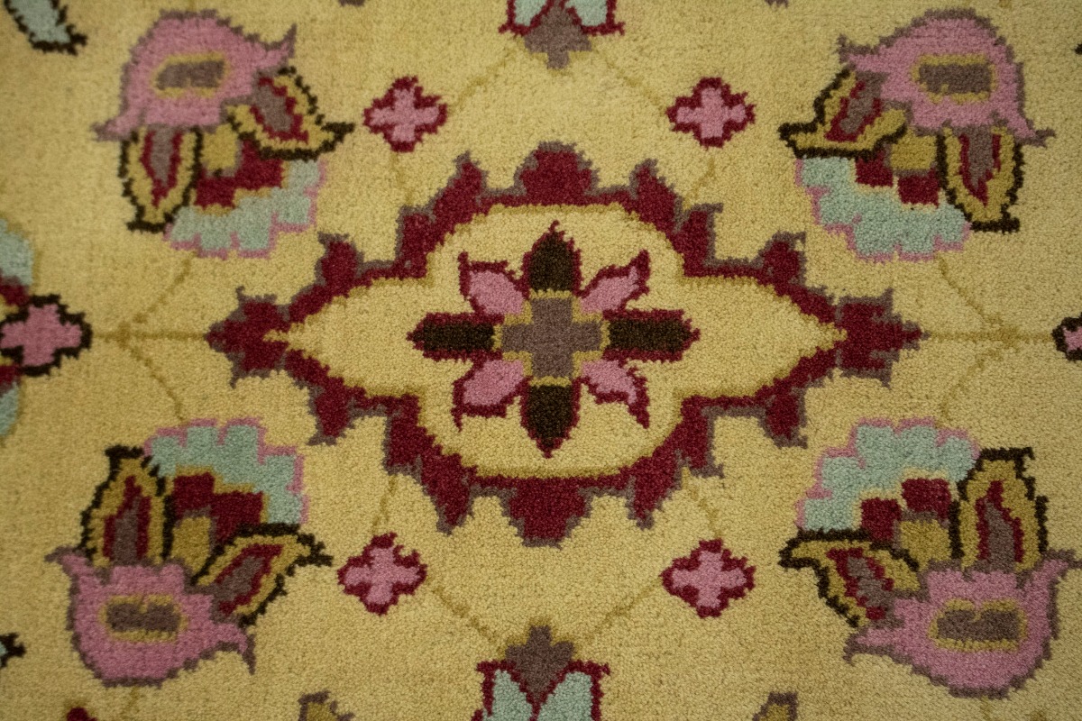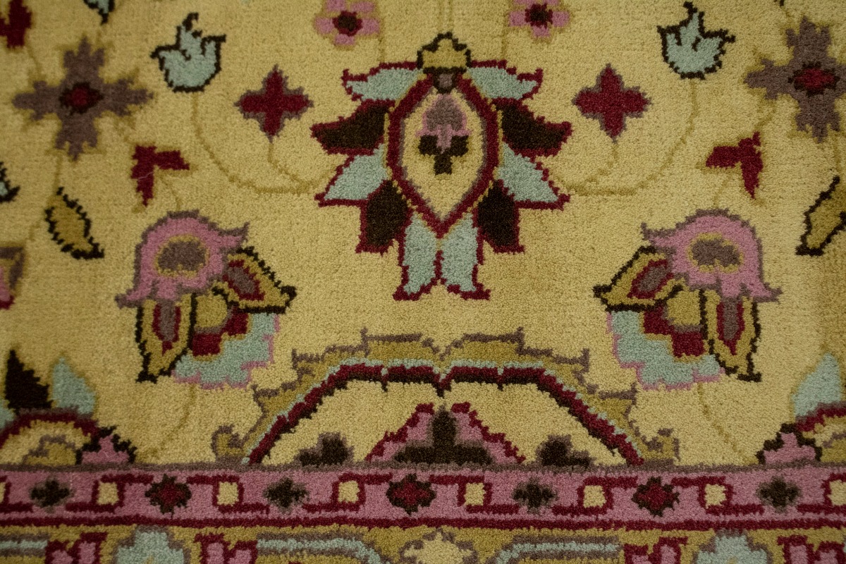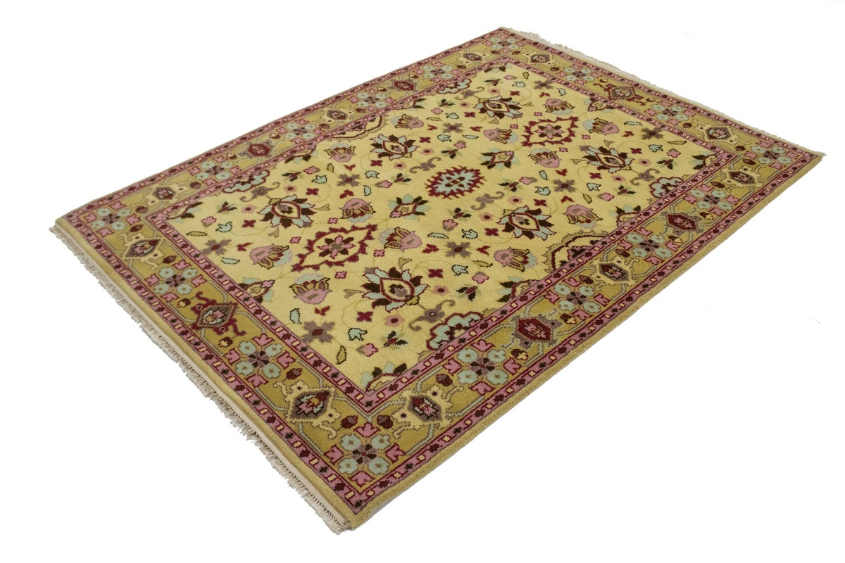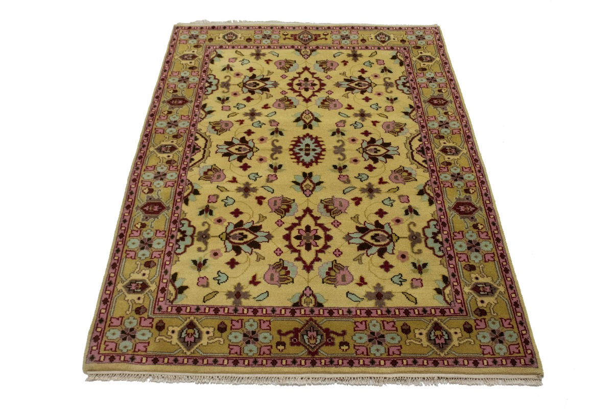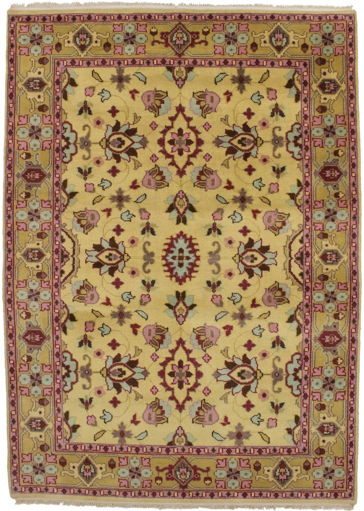 This genuine 5’5X7’6 beige new Oriental rug was finely knotted by the hands of weavers influenced by a variety of amazing artistic designs, to recreate the aged look of the exceptional piece with a richness of color and embellished background field. What set this vintage style Oriental area rug from the others are the material and dye used (wool pile and cotton foundation), knot count, antique designs, fantastic grades, and its regional historical connection: it has deep roots, from the story of the people who produced it to the meaning of the symbols and colors displayed across its canvas that have been praised for centuries. This Indian home décor carpet will be completely cozy and inviting that never will go out of style! Also, this Oriental rug would be among your most valuable treasures, it is a great investment that increase in value over time, and it will last a lifetime because was woven with high-quality, all-natural wool. Eco-friendly, opulent yet affordable; this rug/runner will give you an extra pop of character to help define your home environment with luxury and warmth that will capture the eyes and attention of your audience (homeowners, designers, decorators, family and friends). OT-1046