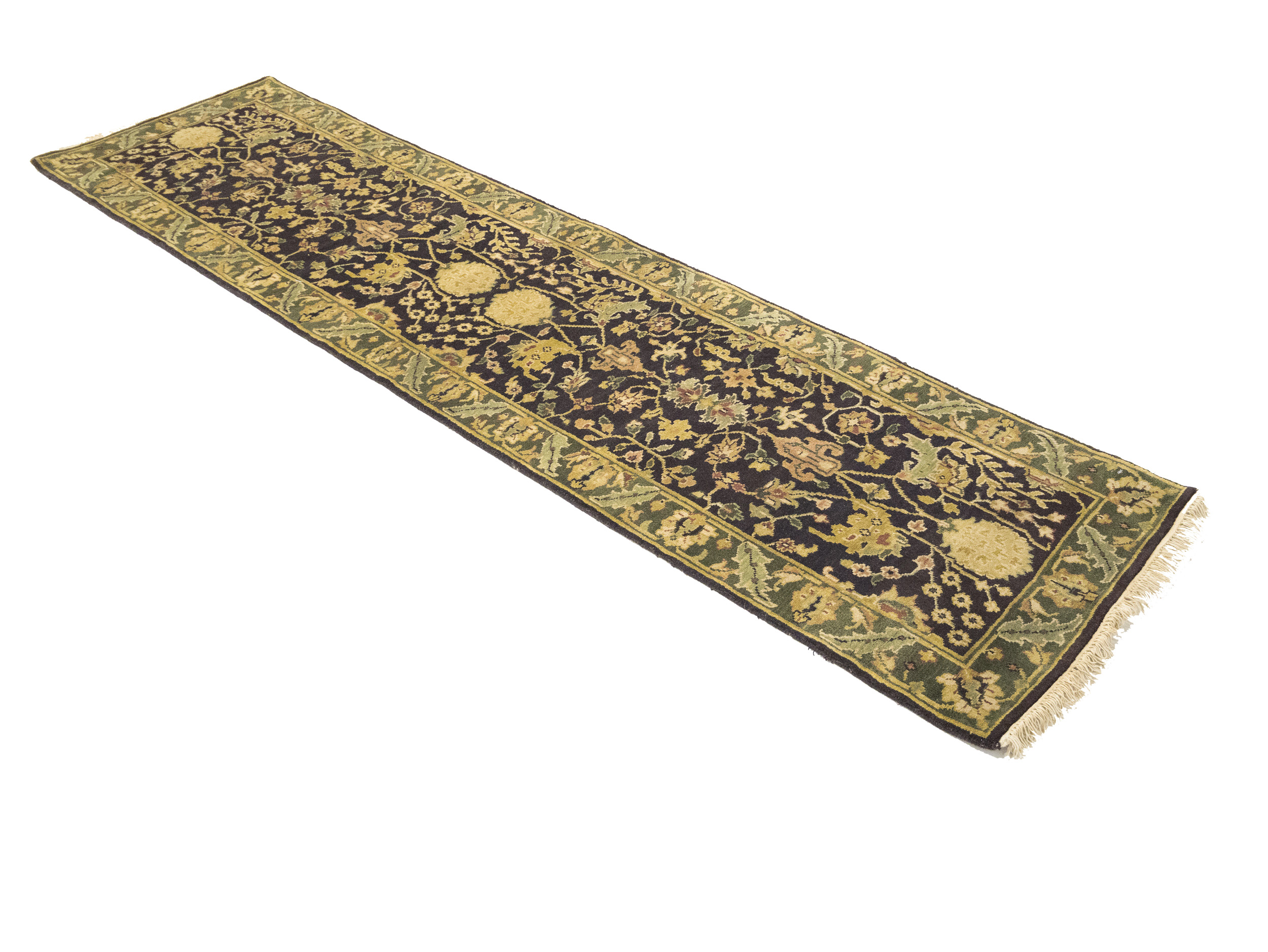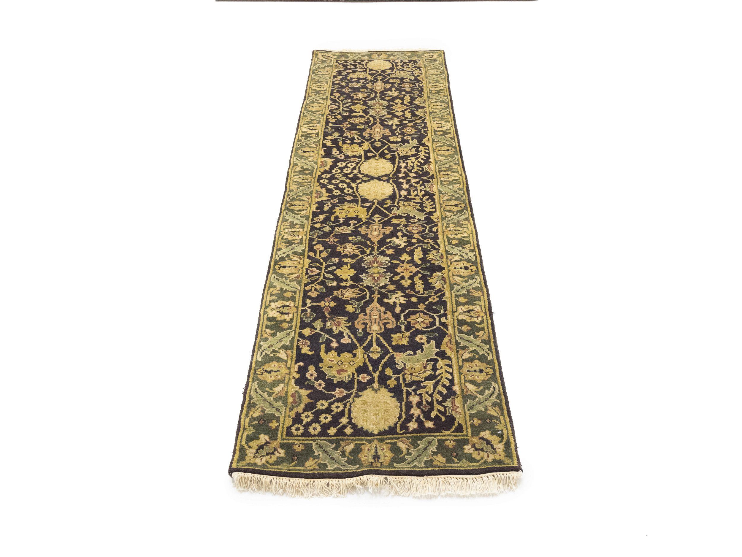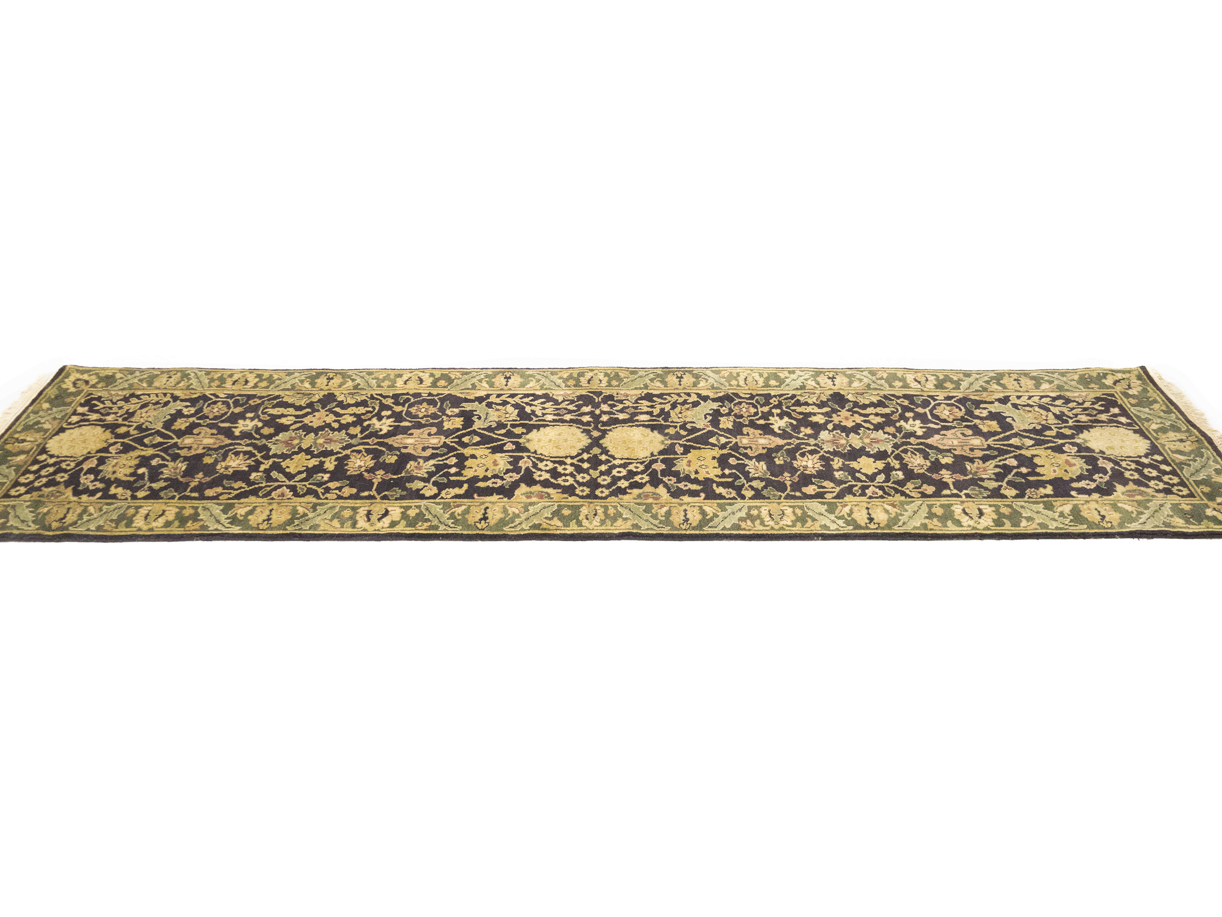 Handmade 2'7X10 charcoal oriental Runner rug made with vegetable dyes (fine wool pile and cotton foundation), exceptional knot count, and appealing ancient designs. This Oriental runner never will go out of style and would be among your most valuable treasures.