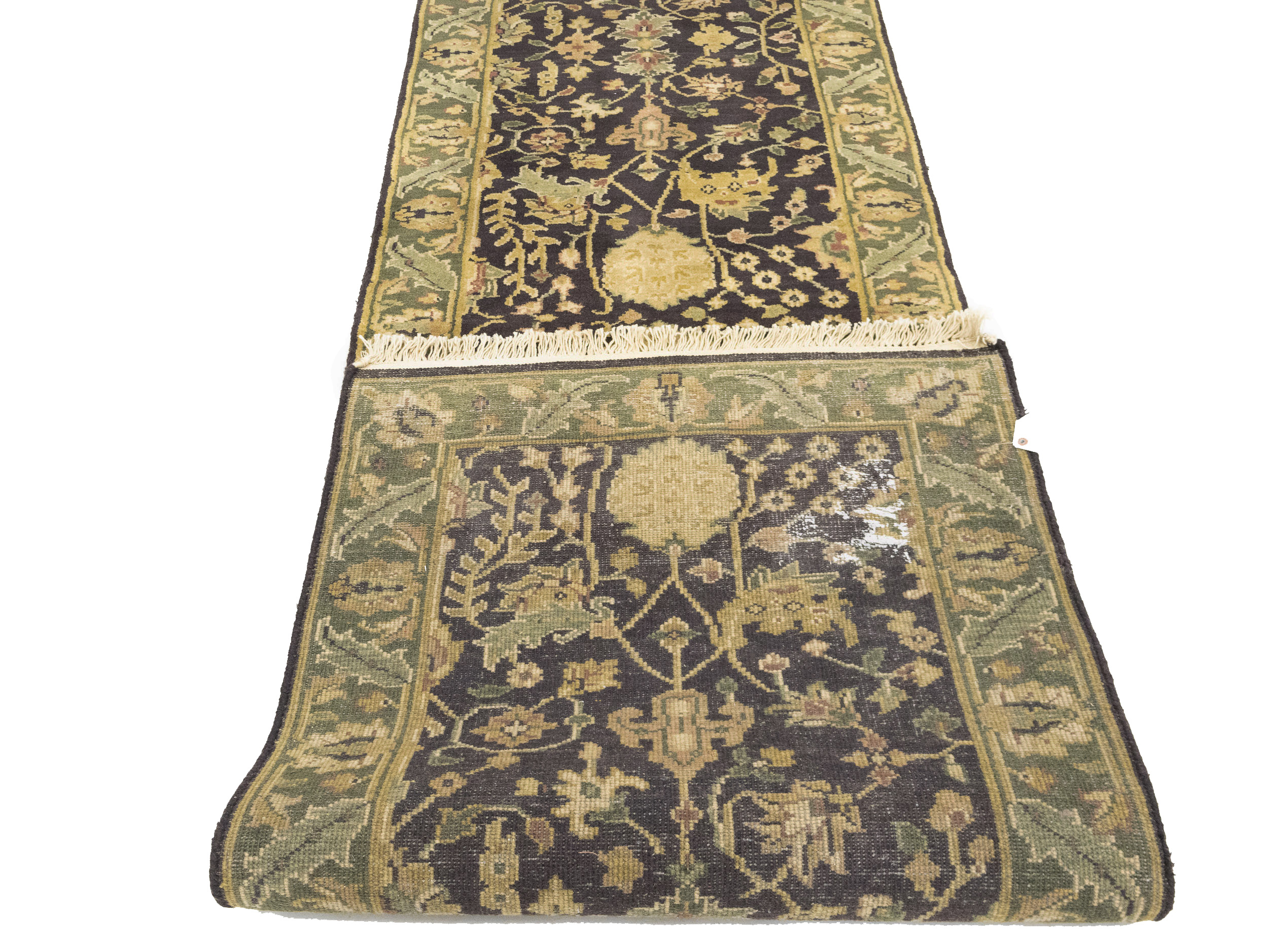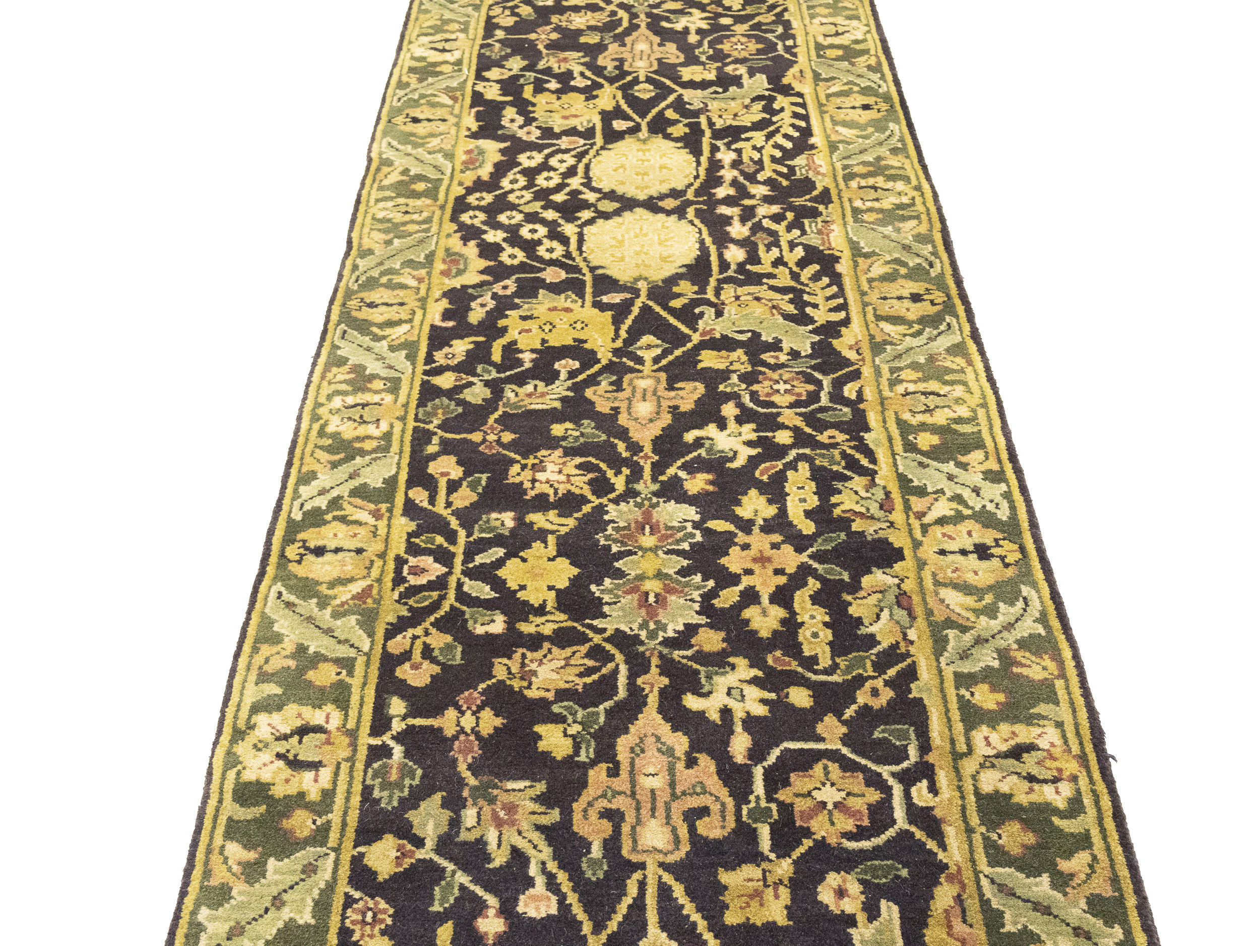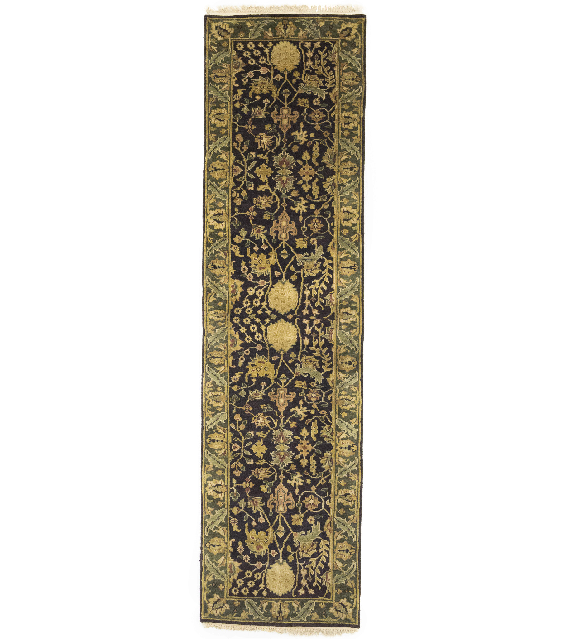 Handmade 2'7X10 charcoal oriental Runner rug made with vegetable dyes (fine wool pile and cotton foundation), exceptional knot count, and appealing ancient designs. This Oriental runner never will go out of style and would be among your most valuable treasures.