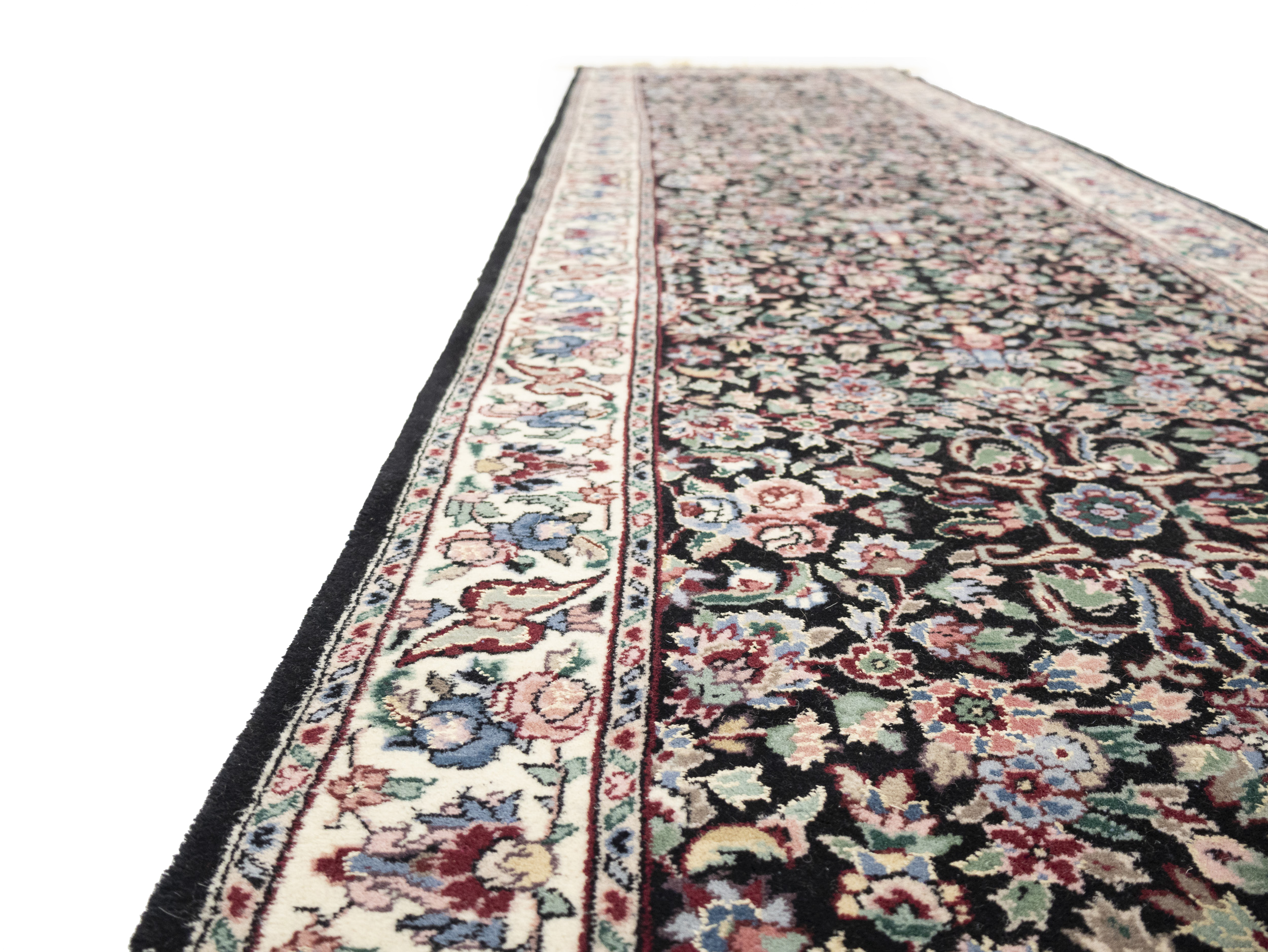 This authentic 2'6X9'9 charcoal new Oriental Runner rug was crafted by the hands of skilled weavers enthused by a variety of lovely artistic designs, to recreate the aged look of the unique piece with a richness of color and beautifully elaborated background field. What set this vintage style Oriental area runner from the others are the material and dye used (wool pile and cotton foundation), knot count, ancient designs, fantastic grades, and its regional historical connection: it has deep roots, from the story of the people who produced it to the meaning of the symbols and colors displayed across its canvas that have been praised for centuries. This Indian home décor carpet will be completely cozy and inviting that never will go out of style! Also, this Oriental runner would be among your most valuable treasures, it is a great investment that increase in value over time, and it will last for generations because was woven with high-quality, all-natural wool. Environmentally friendly, opulent yet affordable; this rug will give you a thorough amount of character to help define your living space with sophistication and warmth that will capture the eyes and attention of your audience (homeowners, designers, decorators, family and friends).