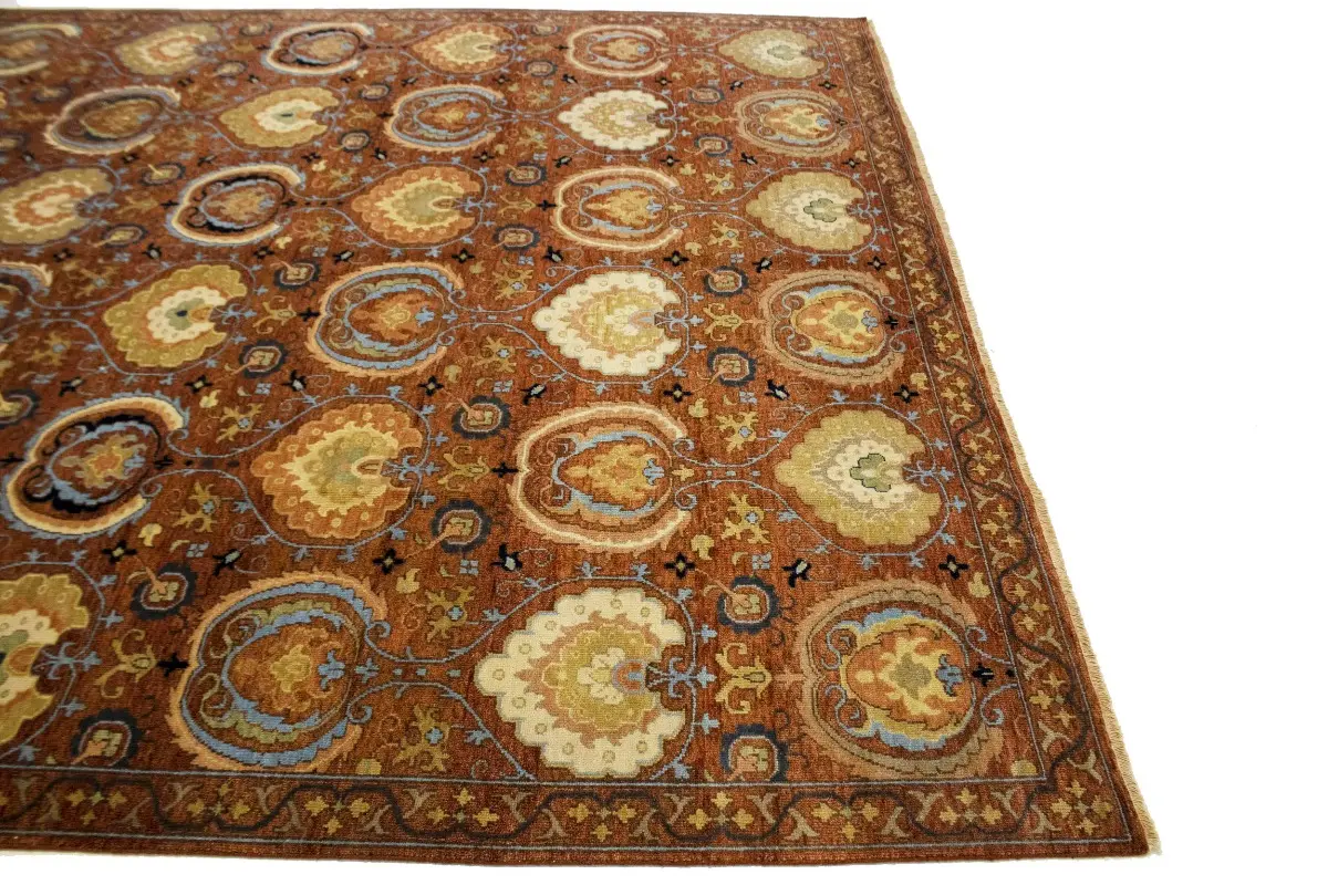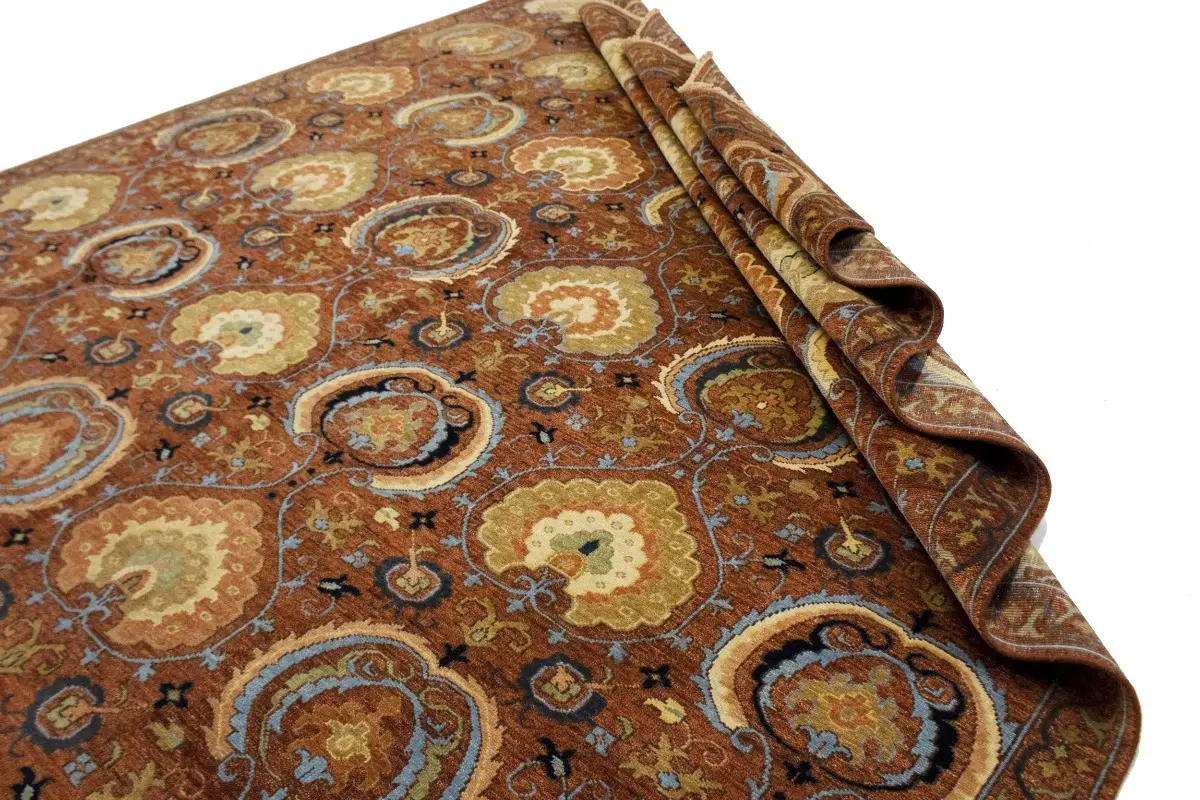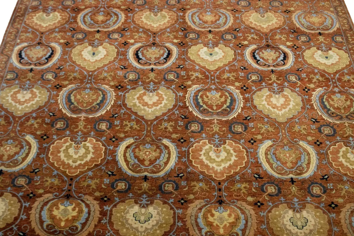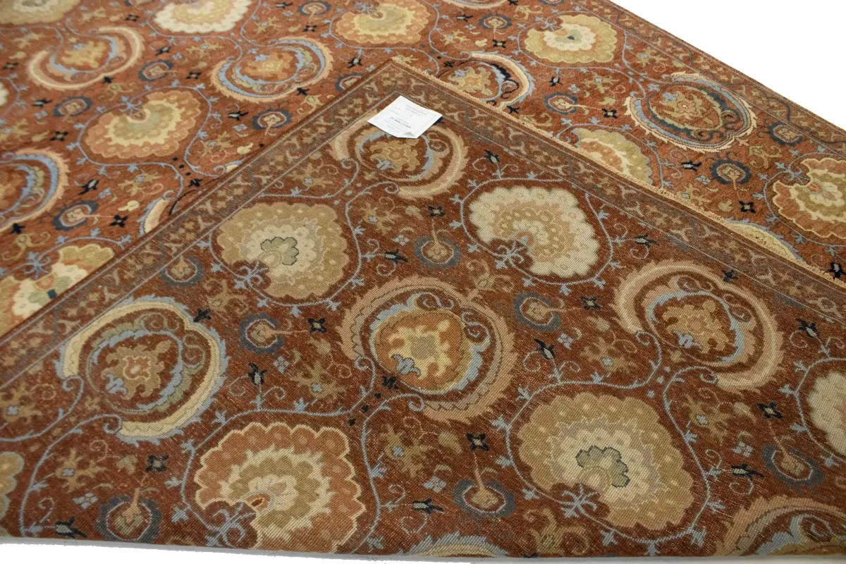 This genuine 9X12'6 brown new Oriental rug was made by the hands of gifted weavers inspired by a variety of spectacular artistic designs, to recreate the aged look of the original piece with a richness of color and ornately patterned background field. What set this vintage style Oriental area rug from the others are the material and dye used (wool pile and cotton foundation), knot count, ancient designs, fantastic grades, and its regional historical connection: it has deep roots, from the story of the people who produced it to the meaning of the symbols and colors displayed across its canvas that have been praised for centuries. This Indian home décor carpet will be completely cozy and inviting that never will go out of style! Also, this Oriental rug would be among your most valuable treasures, it is a great investment that accrues value over time, and it will last for generations because was woven with high-quality, all-natural wool. Environmentally friendly, opulent yet affordable; this rug/runner will give you a thorough amount of character to help define your living space with elegance and warmth that will capture the eyes and attention of your audience (homeowners, designers, decorators, family and friends). OT-3406