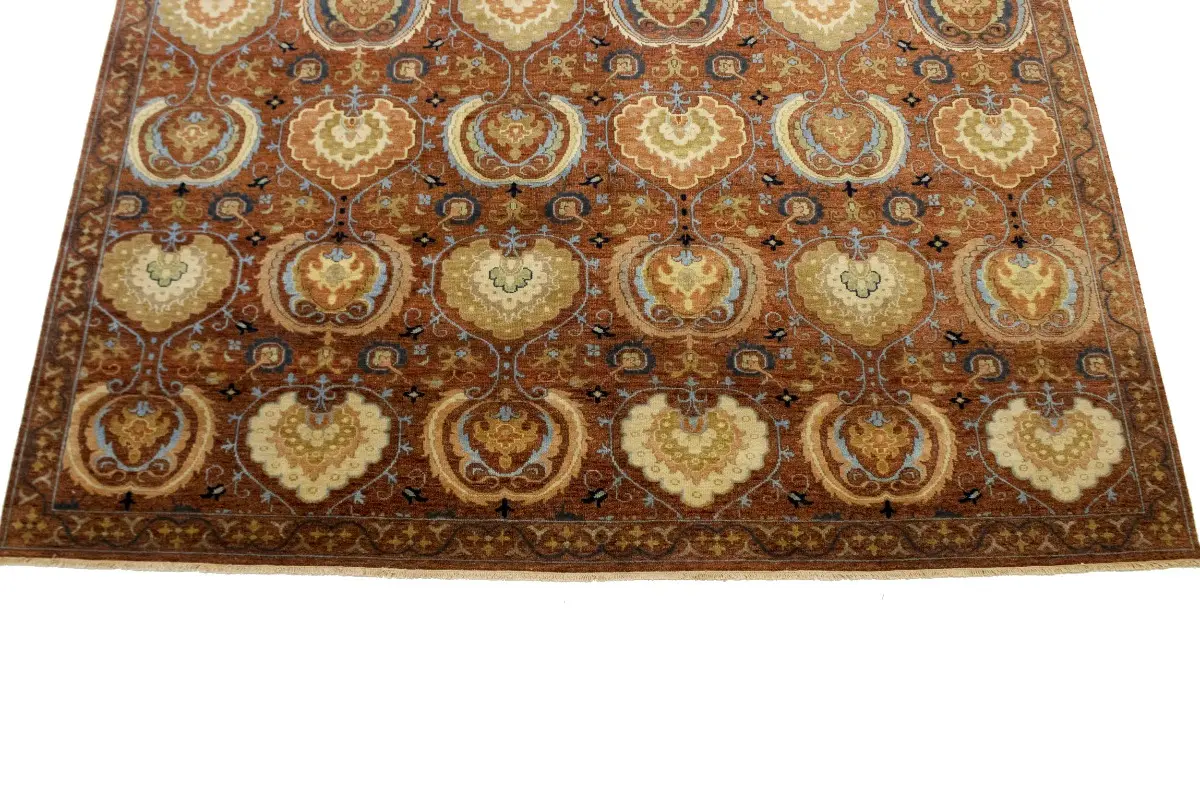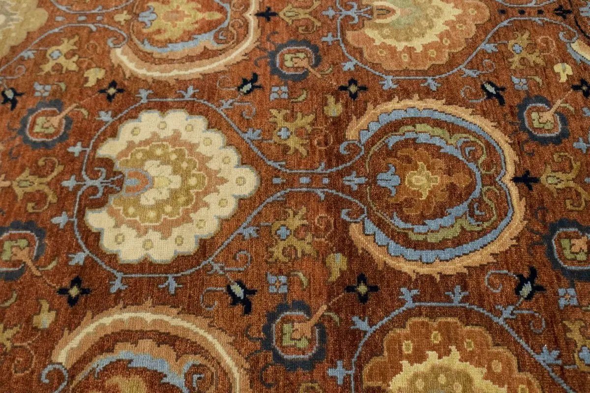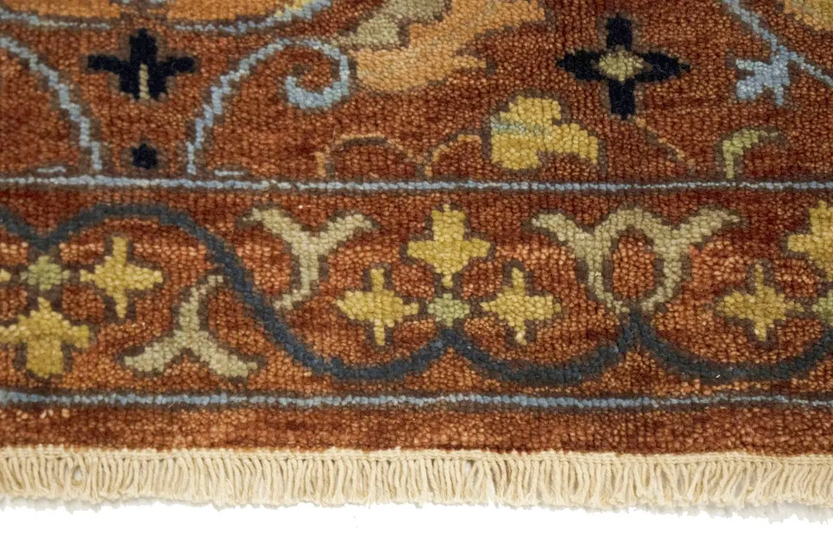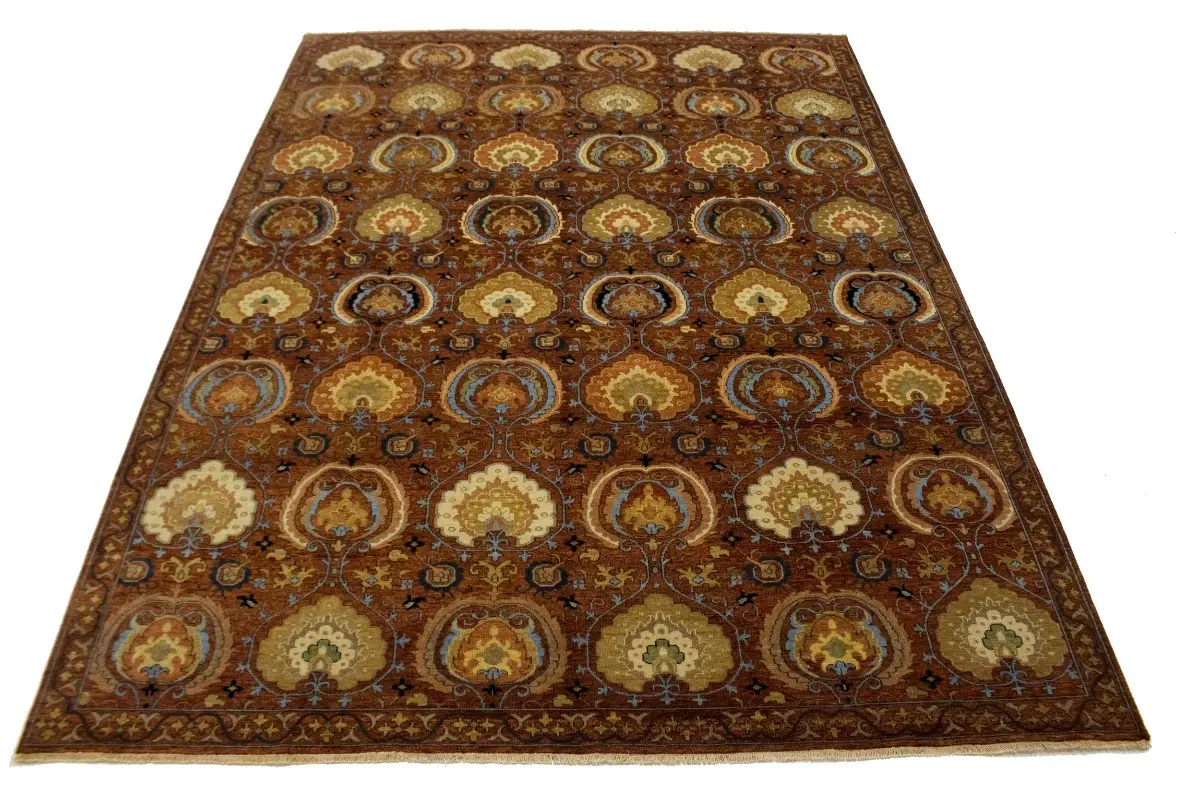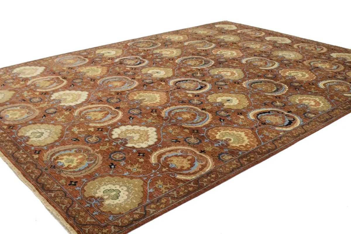 This genuine 9X12'6 brown new Oriental rug was made by the hands of gifted weavers inspired by a variety of spectacular artistic designs, to recreate the aged look of the original piece with a richness of color and ornately patterned background field. What set this vintage style Oriental area rug from the others are the material and dye used (wool pile and cotton foundation), knot count, ancient designs, fantastic grades, and its regional historical connection: it has deep roots, from the story of the people who produced it to the meaning of the symbols and colors displayed across its canvas that have been praised for centuries. This Indian home décor carpet will be completely cozy and inviting that never will go out of style! Also, this Oriental rug would be among your most valuable treasures, it is a great investment that accrues value over time, and it will last for generations because was woven with high-quality, all-natural wool. Environmentally friendly, opulent yet affordable; this rug/runner will give you a thorough amount of character to help define your living space with elegance and warmth that will capture the eyes and attention of your audience (homeowners, designers, decorators, family and friends). OT-3406