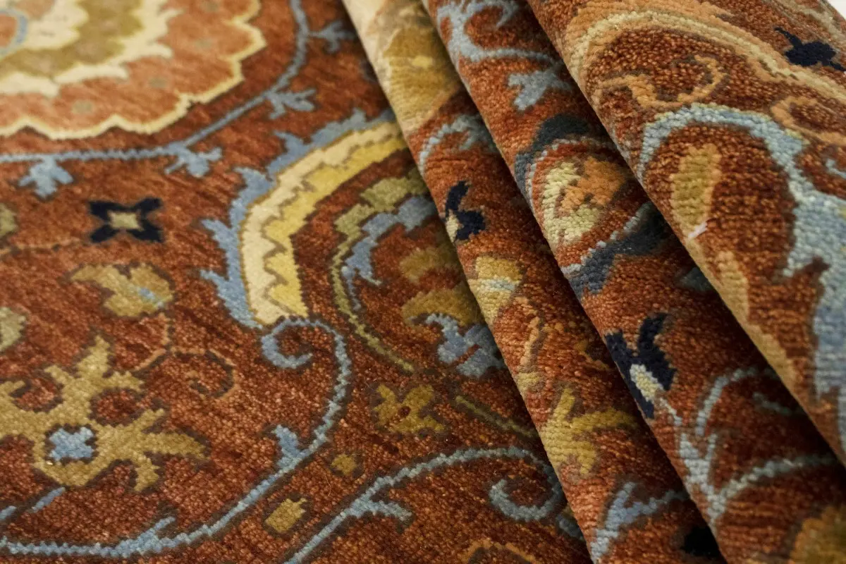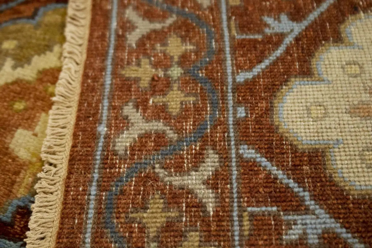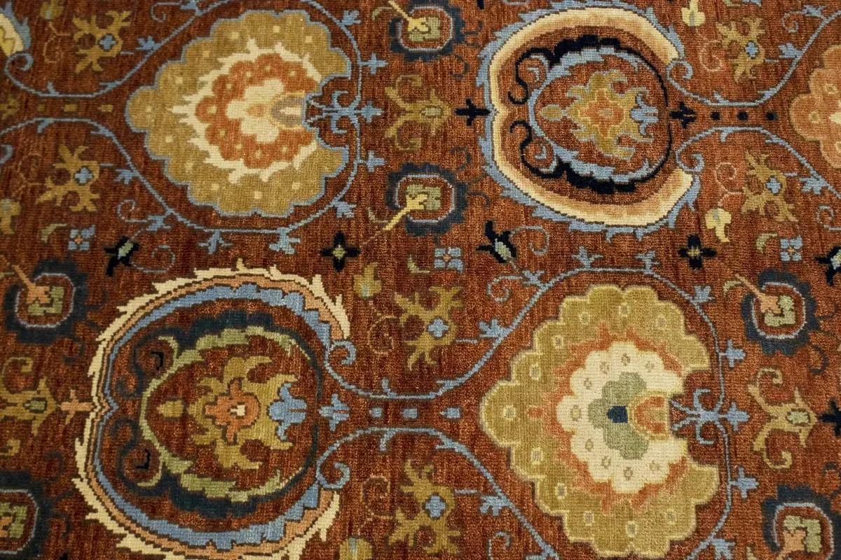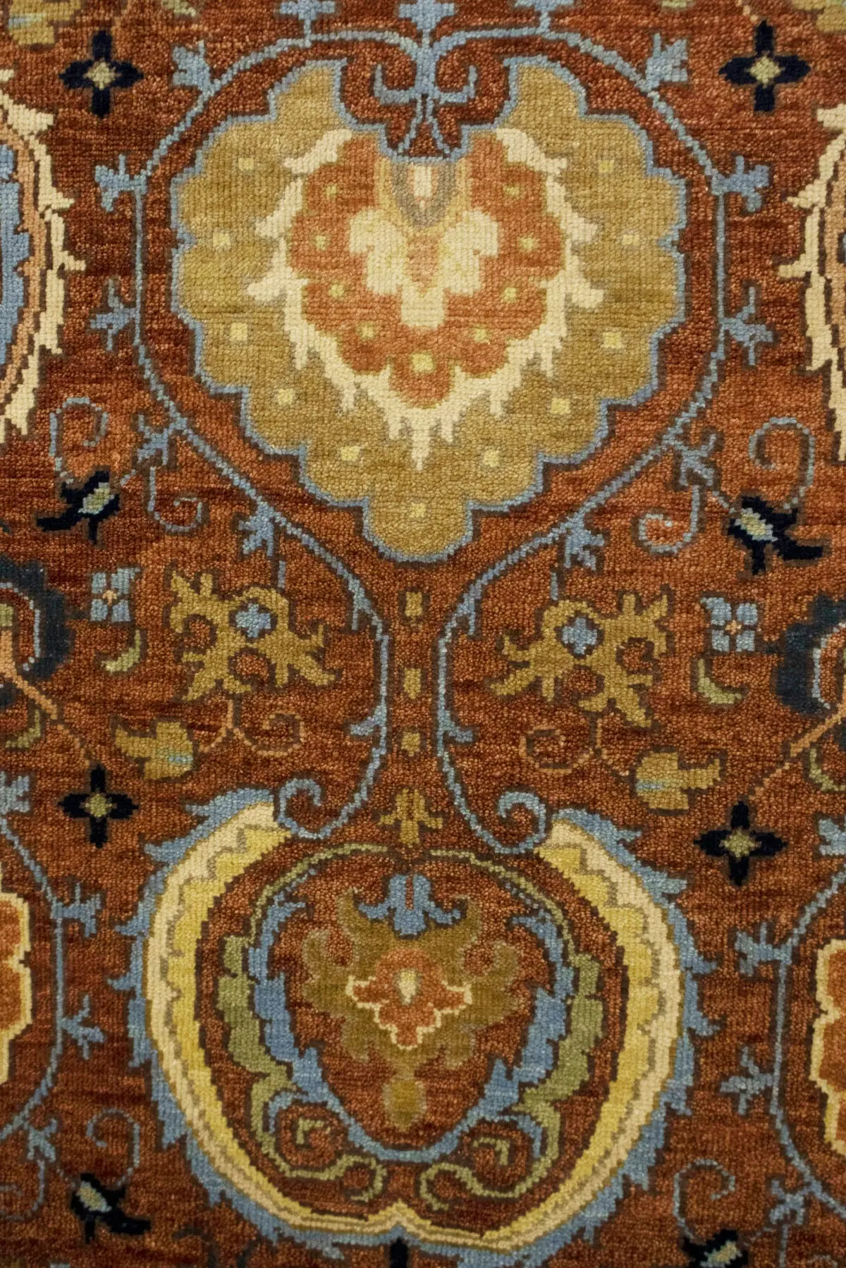 This genuine 9X12'6 brown new Oriental rug was made by the hands of gifted weavers inspired by a variety of spectacular artistic designs, to recreate the aged look of the original piece with a richness of color and ornately patterned background field. What set this vintage style Oriental area rug from the others are the material and dye used (wool pile and cotton foundation), knot count, ancient designs, fantastic grades, and its regional historical connection: it has deep roots, from the story of the people who produced it to the meaning of the symbols and colors displayed across its canvas that have been praised for centuries. This Indian home décor carpet will be completely cozy and inviting that never will go out of style! Also, this Oriental rug would be among your most valuable treasures, it is a great investment that accrues value over time, and it will last for generations because was woven with high-quality, all-natural wool. Environmentally friendly, opulent yet affordable; this rug/runner will give you a thorough amount of character to help define your living space with elegance and warmth that will capture the eyes and attention of your audience (homeowners, designers, decorators, family and friends). OT-3406
