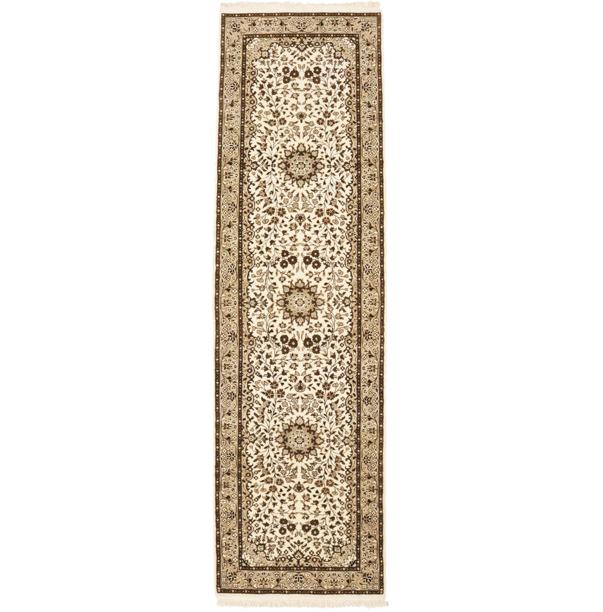 Handmade 2'7X9'3 cream oriental runner made with vegetable dyes (fine wool pile and cotton foundation), exceptional knot count, and appealing ancient designs. This Oriental runner never will go out of style and would be among your most valuable treasures.