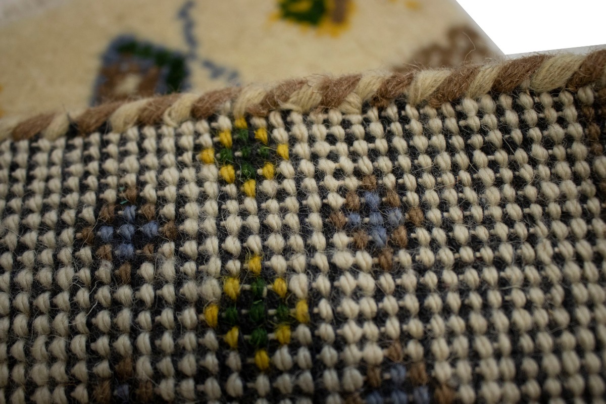 Handmade 1'4X1'4 cream oriental rug made with vegetable dyes (fine wool pile and cotton foundation), exceptional knot count, and appealing ancient designs. This Oriental rug never will go out of style and would be among your most valuable treasures.