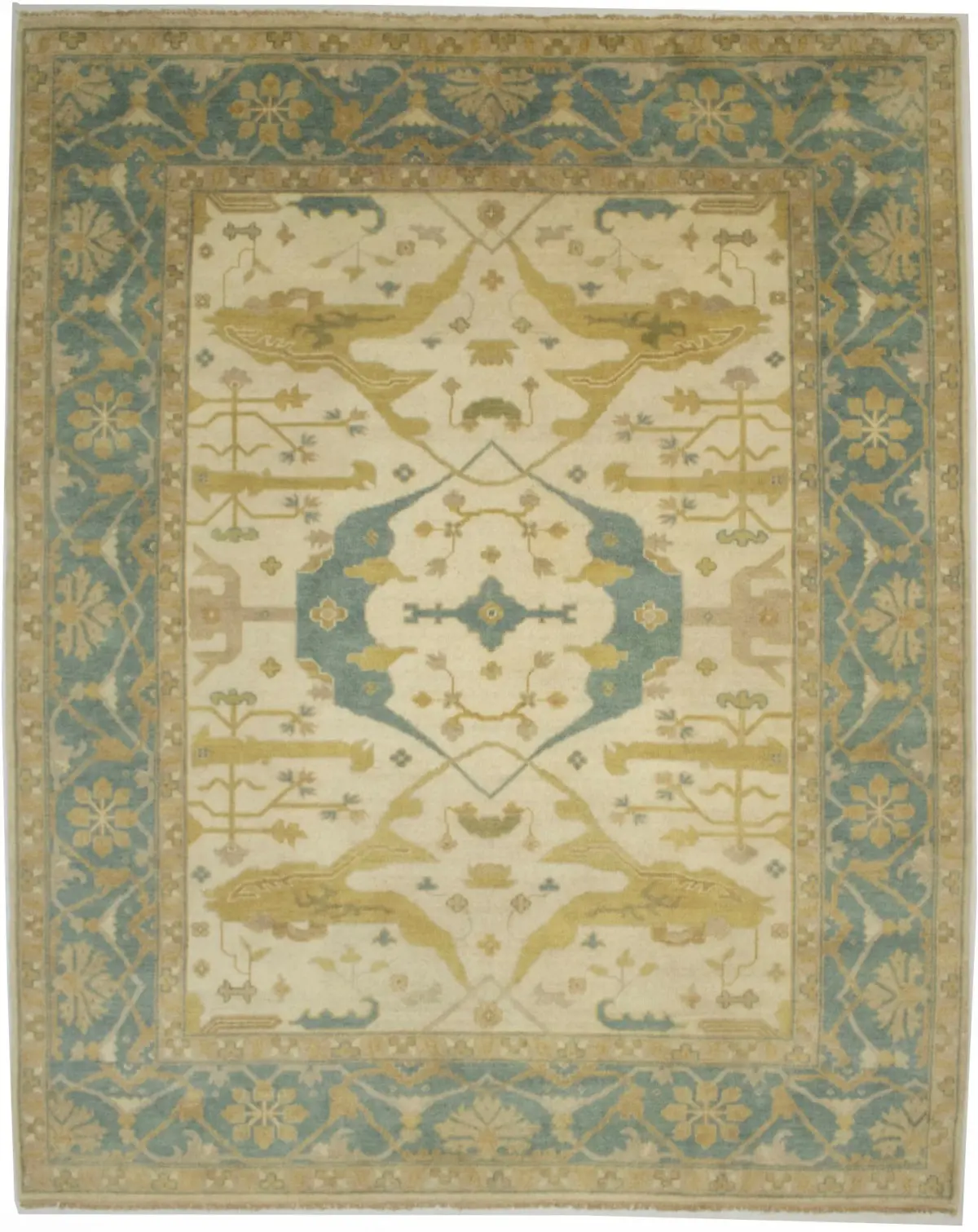 This genuine 8X10 cream new Oriental rug was well-constructed by the hands of master weavers motivated by a variety of stunning artistic designs, to recreate the aged look of the exceptional piece with a richness of color and developed decorative background field. What set this vintage style Oriental area rug from the others are the material and dye used (wool pile and cotton foundation), knot count, ancient designs, fantastic grades, and its regional historical connection: it has deep roots, from the story of the people who produced it to the meaning of the symbols and colors displayed across its canvas that have been praised for centuries. This Indian home décor carpet will be completely cozy and inviting that never will go out of style! Also, this Oriental rug would be among your most valuable treasures, it is a great investment that increase in value over time, and it will last a lifetime because was woven with high-quality, all-natural wool. Eco-friendly, opulent yet affordable; this rug give you an extra pop of character to help define your home environment with elegance and warmth that will capture the eyes and attention of your audience (homeowners, designers, decorators, family and friends). OT-4266