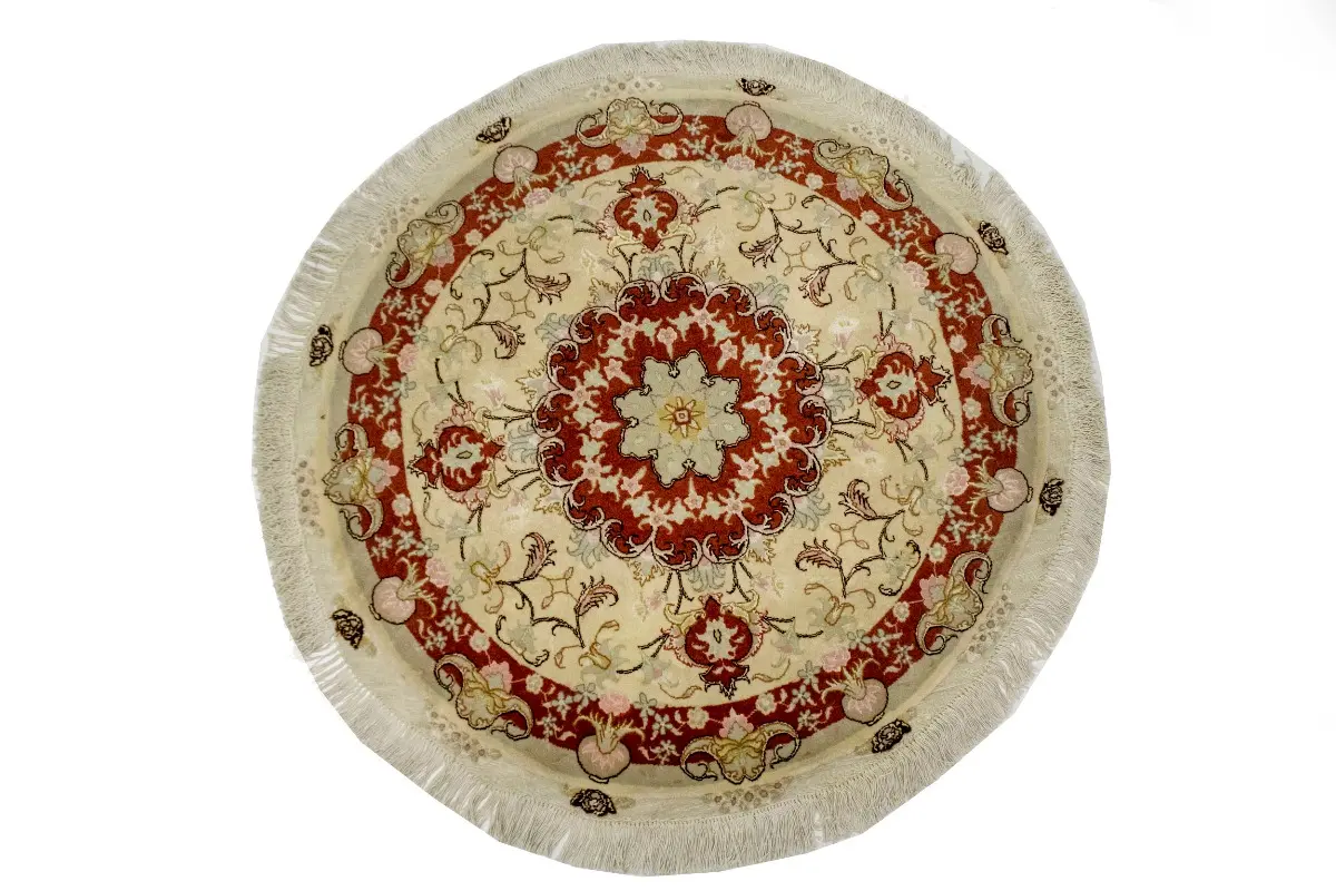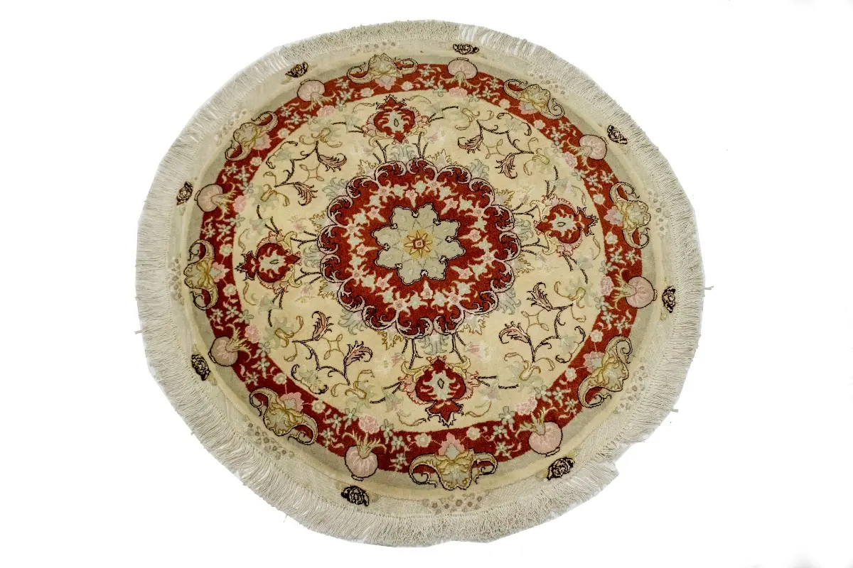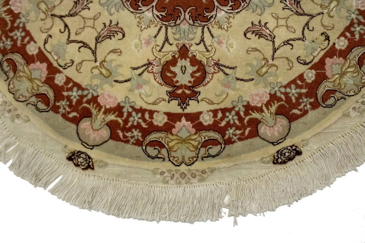 Handmade 4X4 round extra fine Persian classicrug made with vegetable dyes (fine wool pile and cotton foundation), superior knot count, and appealing ancient floral design. This Oriental rug never will go out of style and would be among your most valuable treasures.