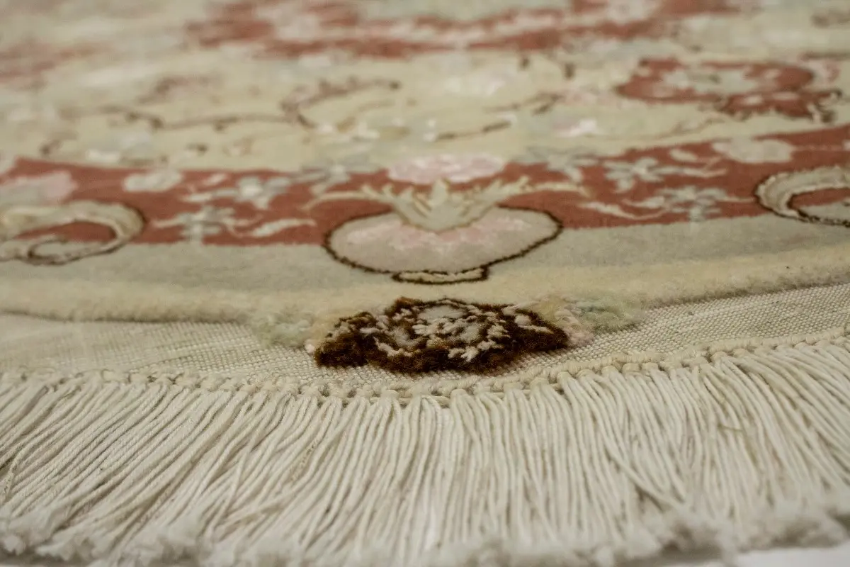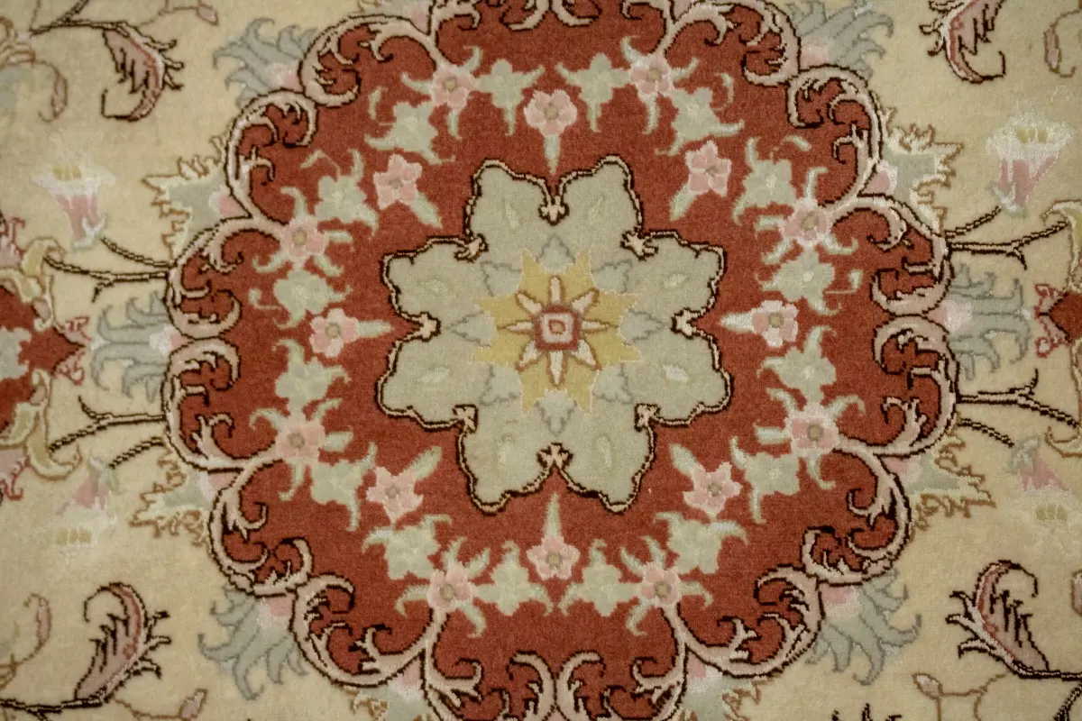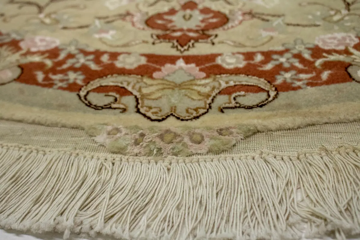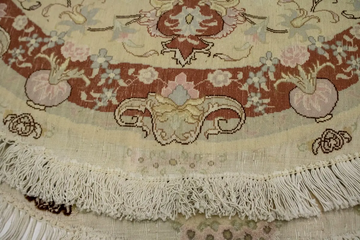 Handmade 4X4 round extra fine Persian classicrug made with vegetable dyes (fine wool pile and cotton foundation), superior knot count, and appealing ancient floral design. This Oriental rug never will go out of style and would be among your most valuable treasures.