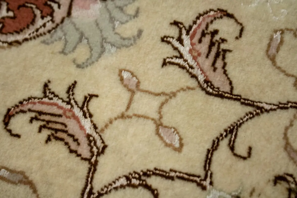 This authentic 4X4 Cream 100% Kork Wool pile & pure Silk Persian rug was finely knotted by the hands of weavers influenced by a variety of amazing artistic designs, to recreate the aged look of the exceptional piece with a richness of color and embellished floral background field. What set this traditional Oriental area rug from the others are the material and dye used (wool pile and cotton foundation), knot count, antique designs, fantastic grades, and its regional historical connection: it has deep roots, from the story of the people who produced it to the meaning of the symbols and colors displayed across its canvas that have been praised for centuries. This classic home décor carpet will be completely cozy and inviting that never will go out of style! Also, this Oriental rug would be among your most valuable treasures, it is a great investment that increase in value over time, and it will last a lifetime because was woven with high-quality, all-natural wool; it won’t rip, tear, or shed. Eco-friendly, opulent yet affordable; this Persian rug will give you an extra pop of character to help define your home environment with luxury and warmth that will capture the eyes and attention of your audience (homeowners, designers, decorators, family and friends). Rt-3156