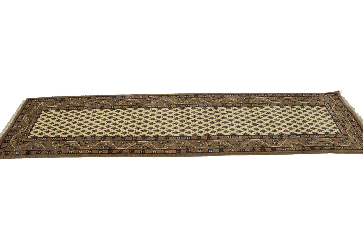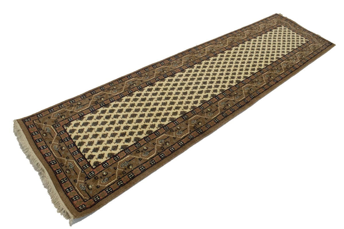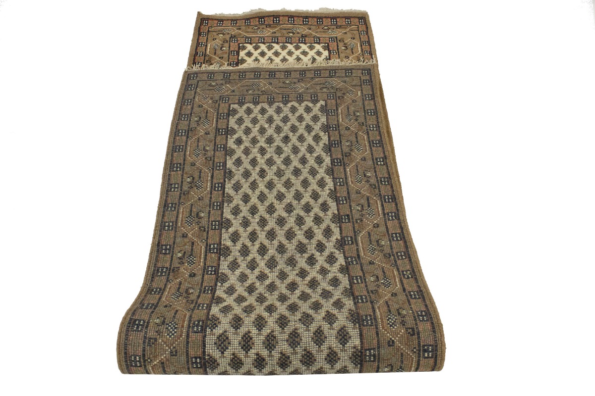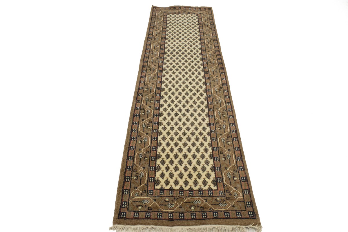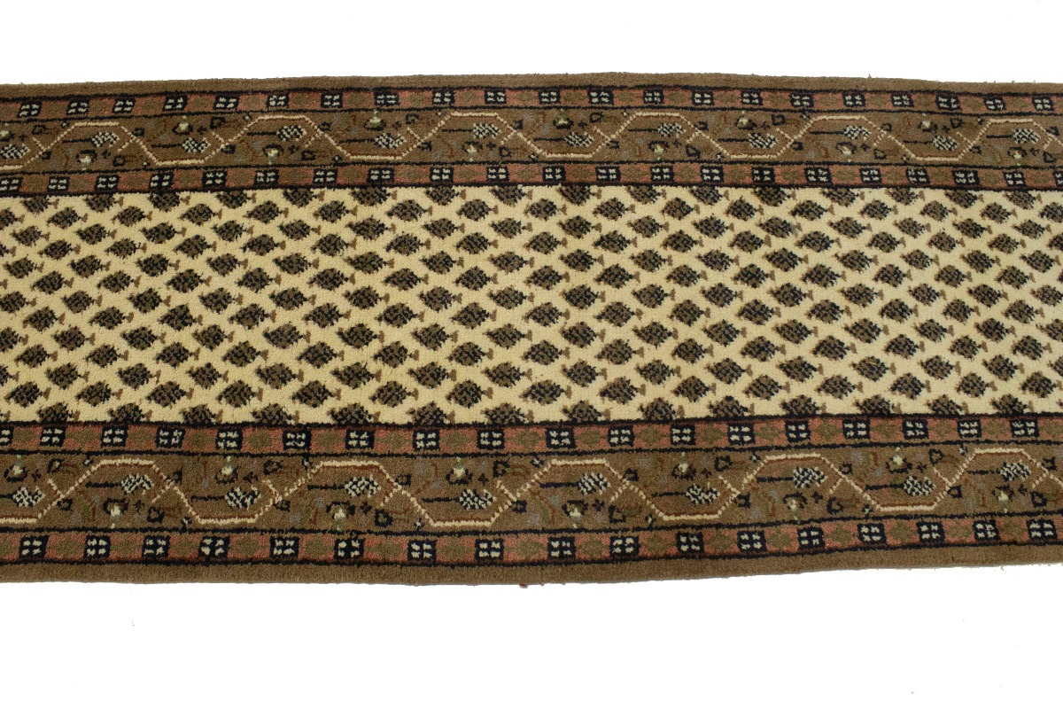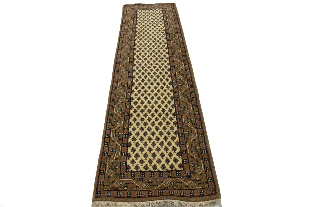 Handmade 2'4X9 cream Oriental runner made with natural dyes (fine wool pile and cotton foundation), superior knot count, and appealing ancient designs. This Oriental runner never will go out of style and would be among your most valuable treasures.