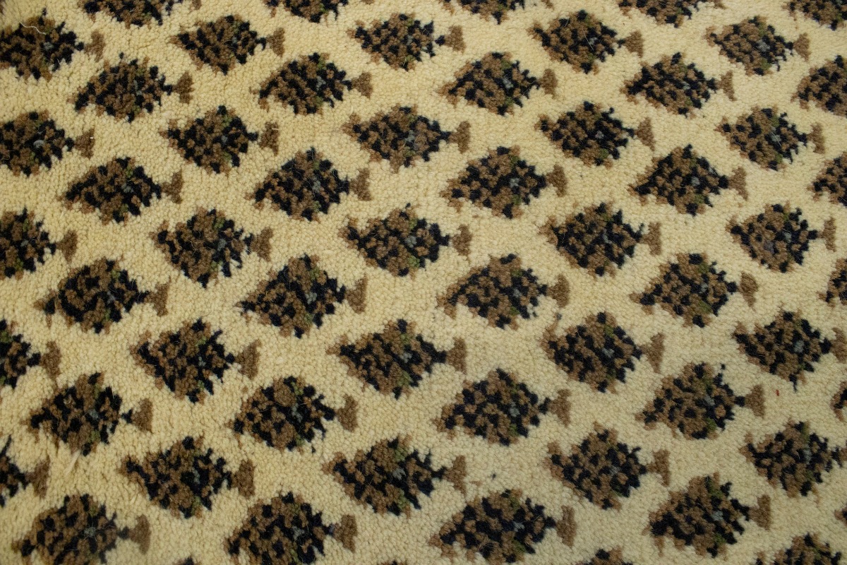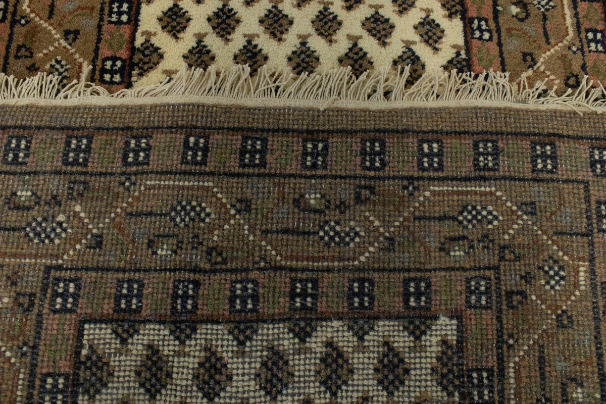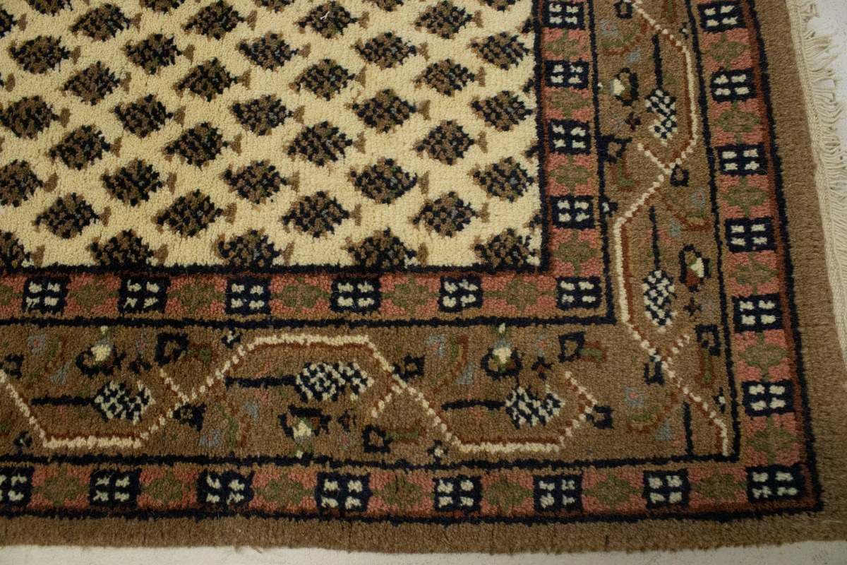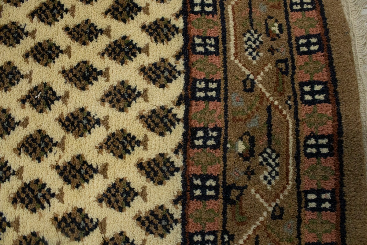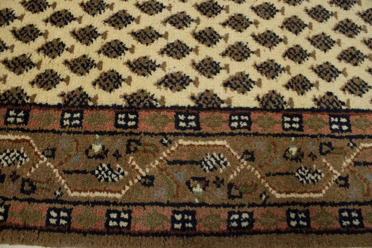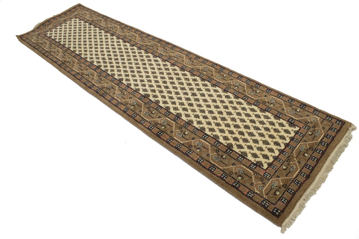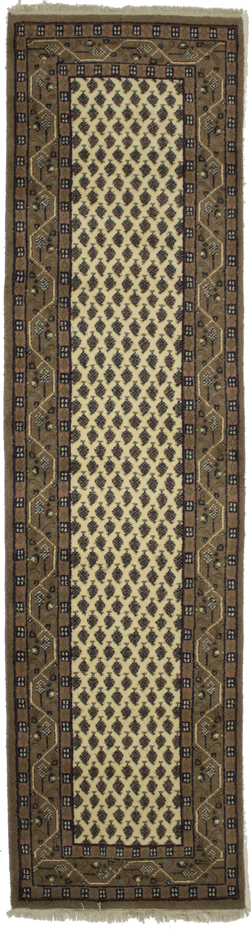 Handmade 2'4X9 cream Oriental runner made with natural dyes (fine wool pile and cotton foundation), superior knot count, and appealing ancient designs. This Oriental runner never will go out of style and would be among your most valuable treasures.