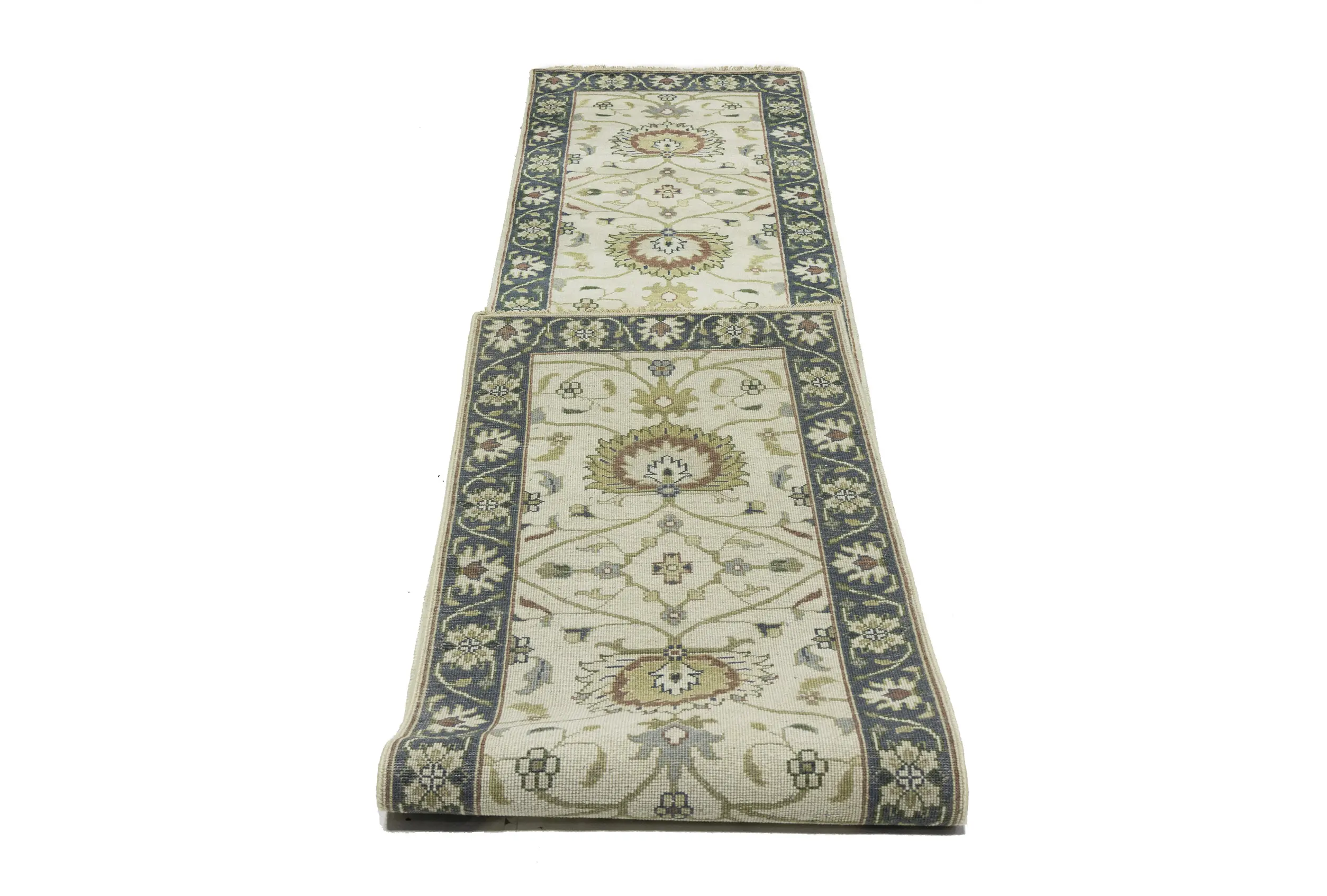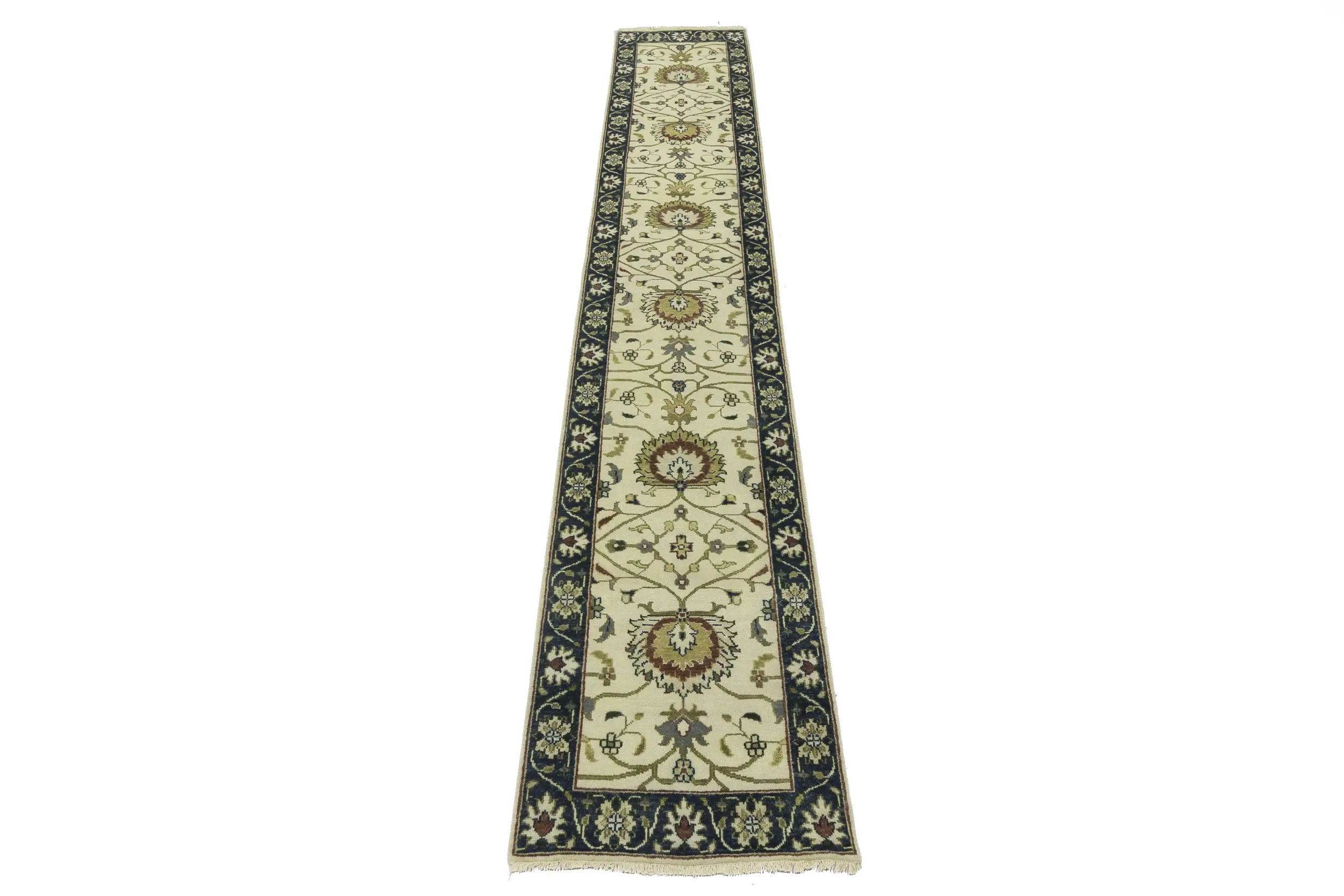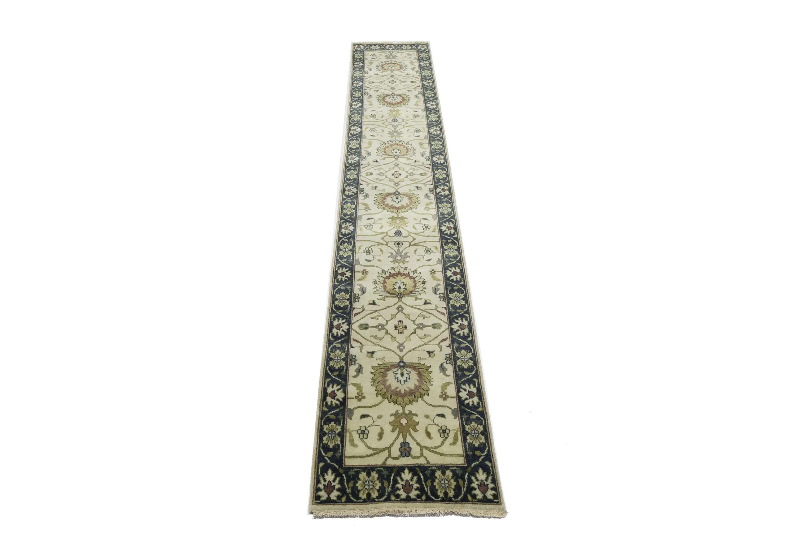 This authentic 2'5X13'4 cream new Oriental runner was crafted by the hands of skilled weavers enthused by a variety of lovely artistic designs, to recreate the aged look of the unique piece with a richness of color and beautifully elaborated background field. What set this vintage style Oriental area runner from the others are the material and dye used (wool pile and cotton foundation), knot count, ancient designs, fantastic grades, and its regional historical connection: it has deep roots, from the story of the people who produced it to the meaning of the symbols and colors displayed across its canvas that have been praised for centuries. This Indian home décor carpet will be completely cozy and inviting that never will go out of style! Also, this Oriental rug would be among your most valuable treasures, it is a great investment that increase in value over time, and it will last for generations because was woven with high-quality, all-natural wool. Environmentally friendly, opulent yet affordable; this runner will give you a thorough amount of character to help define your living space with sophistication and warmth that will capture the eyes and attention of your audience (homeowners, designers, decorators, family and friends).