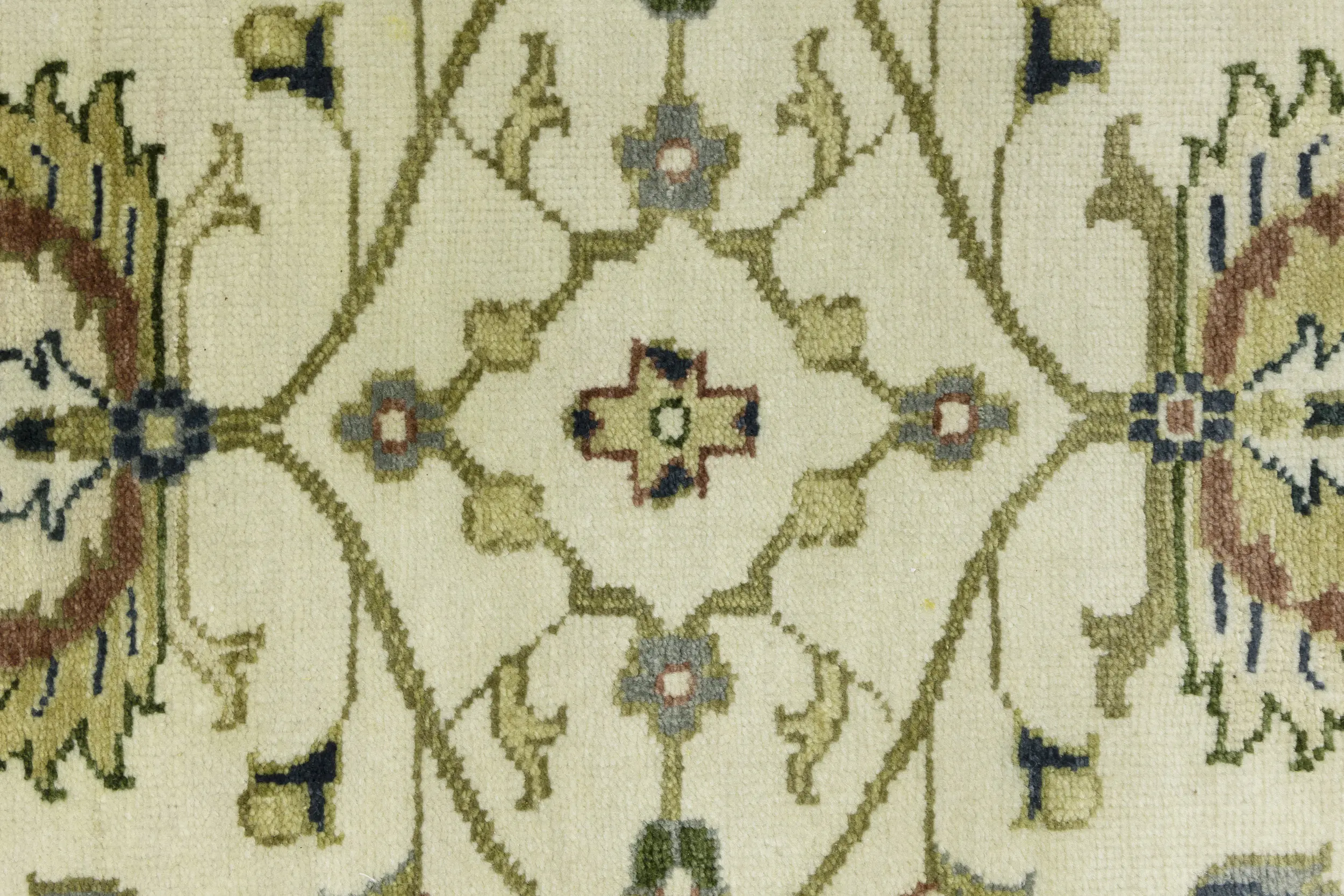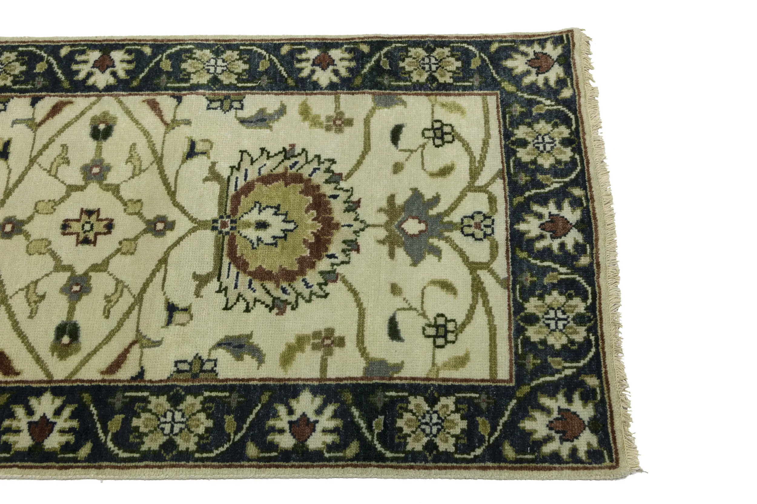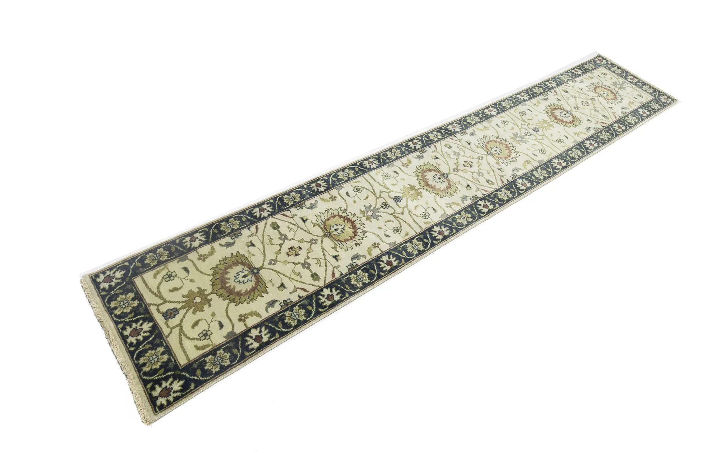 This authentic 2'5X13'4 cream new Oriental runner was crafted by the hands of skilled weavers enthused by a variety of lovely artistic designs, to recreate the aged look of the unique piece with a richness of color and beautifully elaborated background field. What set this vintage style Oriental area runner from the others are the material and dye used (wool pile and cotton foundation), knot count, ancient designs, fantastic grades, and its regional historical connection: it has deep roots, from the story of the people who produced it to the meaning of the symbols and colors displayed across its canvas that have been praised for centuries. This Indian home décor carpet will be completely cozy and inviting that never will go out of style! Also, this Oriental rug would be among your most valuable treasures, it is a great investment that increase in value over time, and it will last for generations because was woven with high-quality, all-natural wool. Environmentally friendly, opulent yet affordable; this runner will give you a thorough amount of character to help define your living space with sophistication and warmth that will capture the eyes and attention of your audience (homeowners, designers, decorators, family and friends).