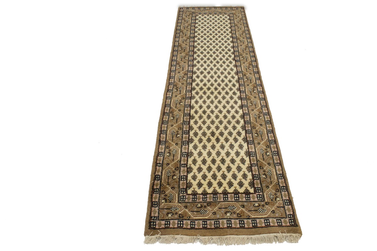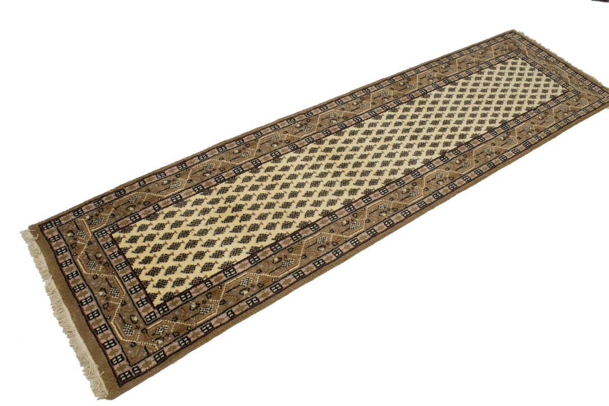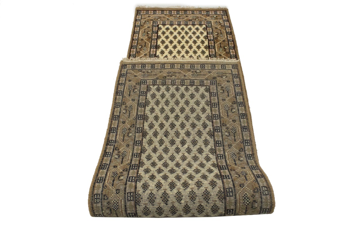 Hand Knotted 2'5X8'9 cream Oriental runner made with vegetable dyes (fine wool pile and cotton foundation), exceptional knot count, and alluring ancient designs. This Oriental runner never will go out of style and would be among your most valuable treasures.