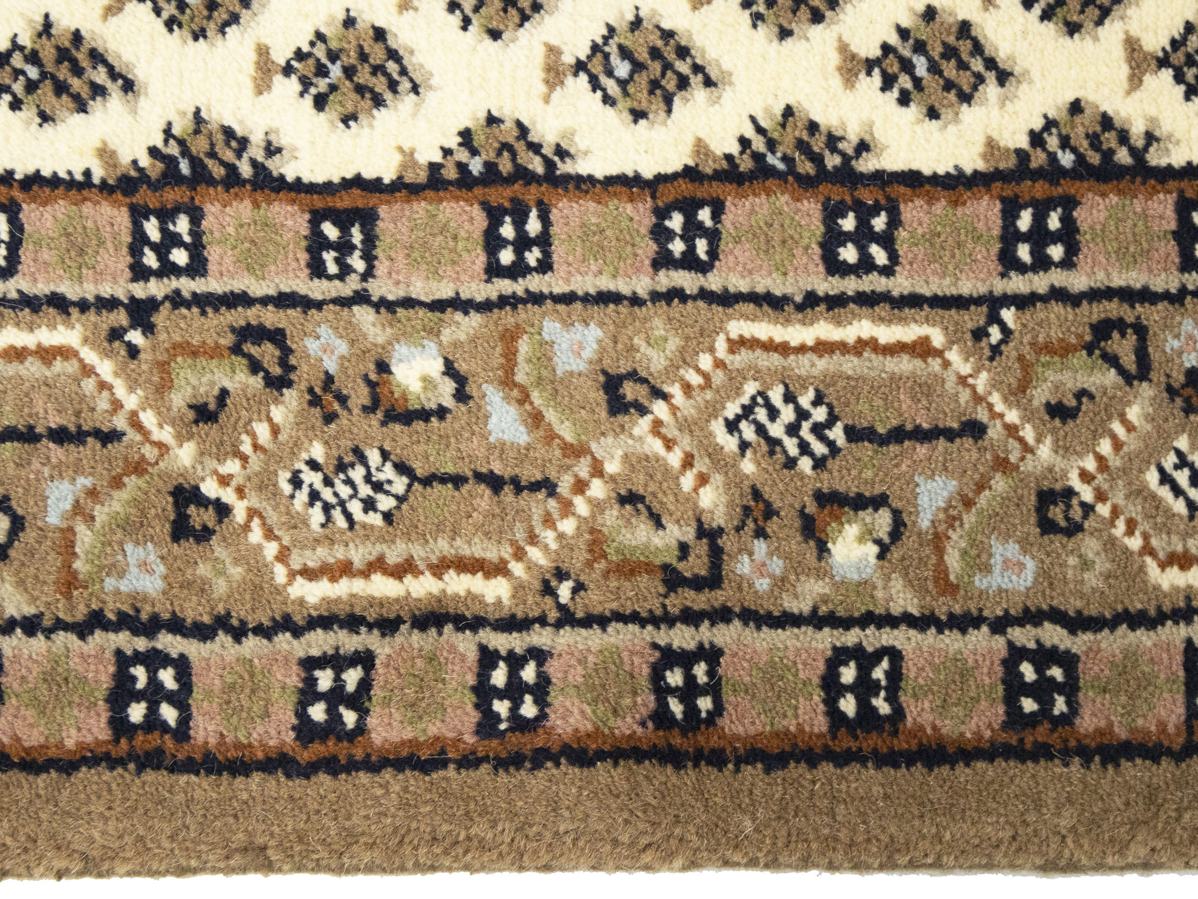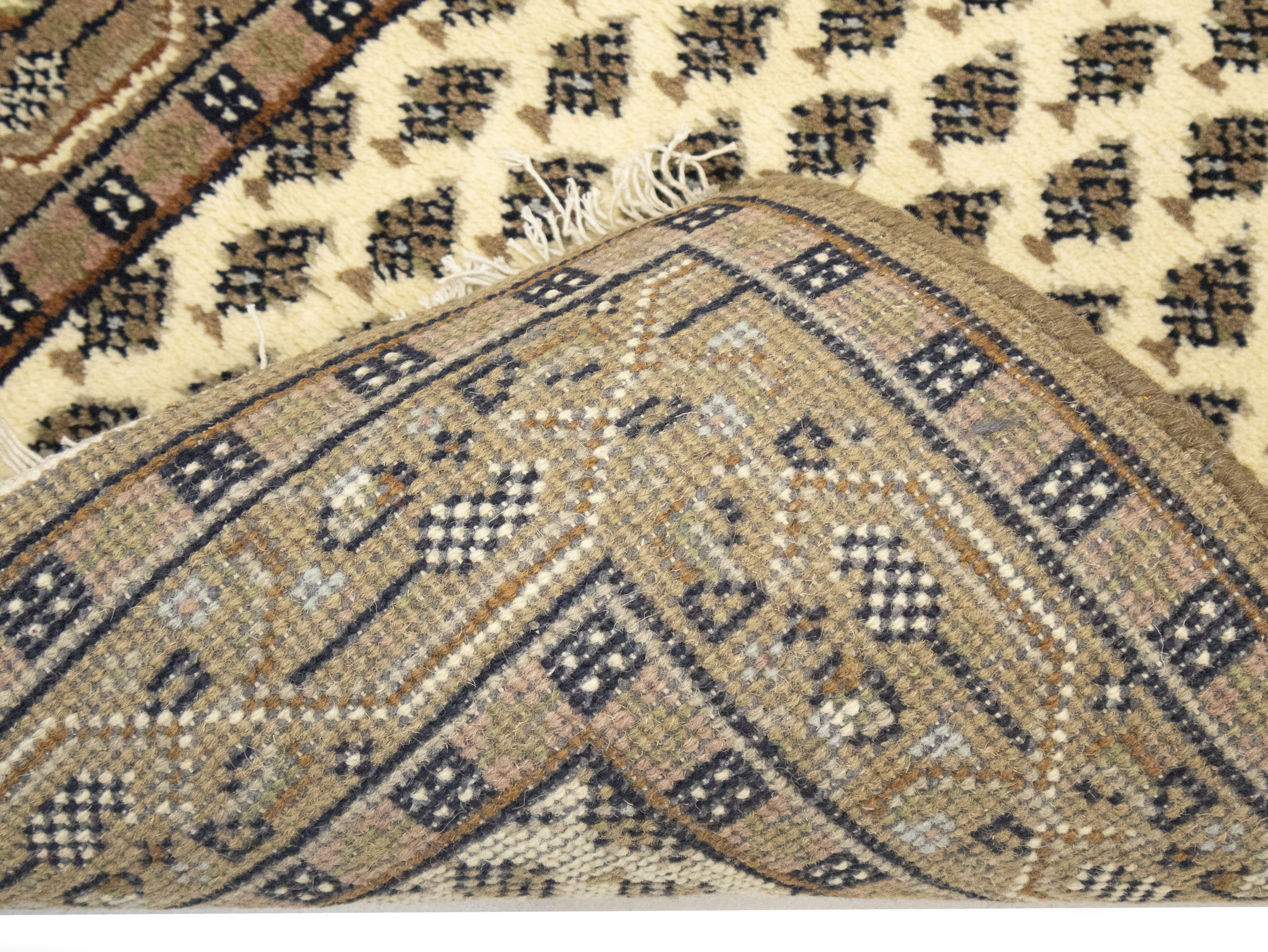 This authentic 2'5X9 cream new Oriental runner was crafted by the hands of skilled weavers enthused by a variety of lovely artistic designs, to recreate the aged look of the unique piece with a richness of color and beautifully elaborated background field. What set this vintage style Oriental area runner from the others are the material and dye used (wool pile and cotton foundation), knot count, ancient designs, fantastic grades, and its regional historical connection: it has deep roots, from the story of the people who produced it to the meaning of the symbols and colors displayed across its canvas that have been praised for centuries. This Indian home décor carpet will be completely cozy and inviting that never will go out of style! Also, this Oriental rug would be among your most valuable treasures, it is a great investment that increase in value over time, and it will last for generations because was woven with high-quality, all-natural wool. Environmentally friendly, opulent yet affordable; this runner will give you a thorough amount of character to help define your living space with sophistication and warmth that will capture the eyes and attention of your audience (homeowners, designers, decorators, family and friends). OT-6529