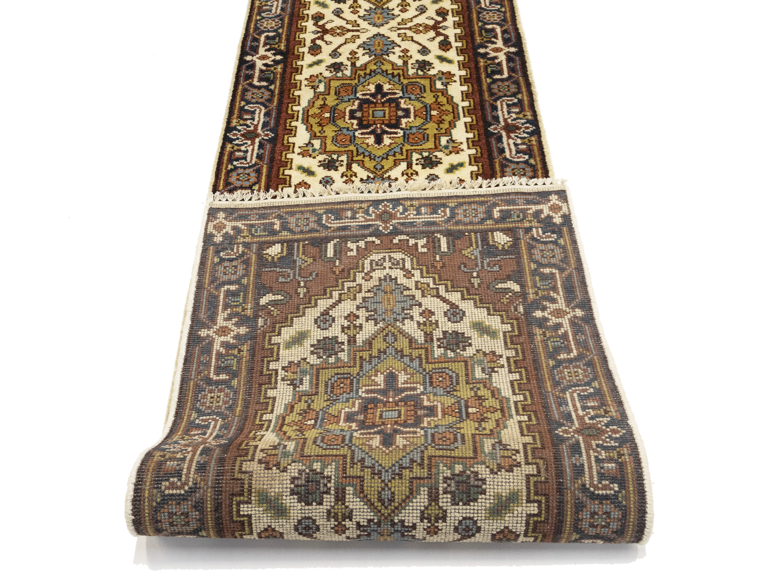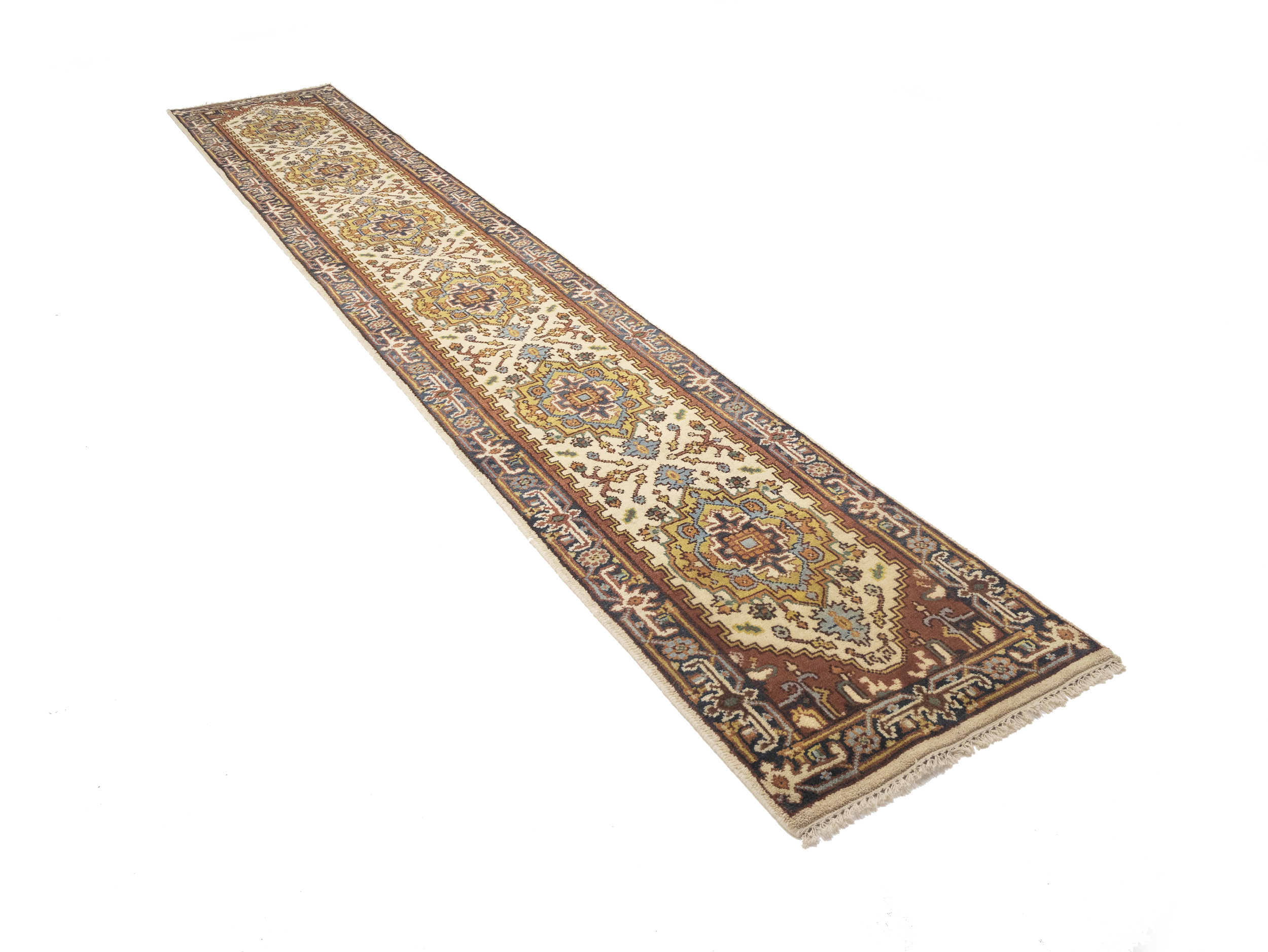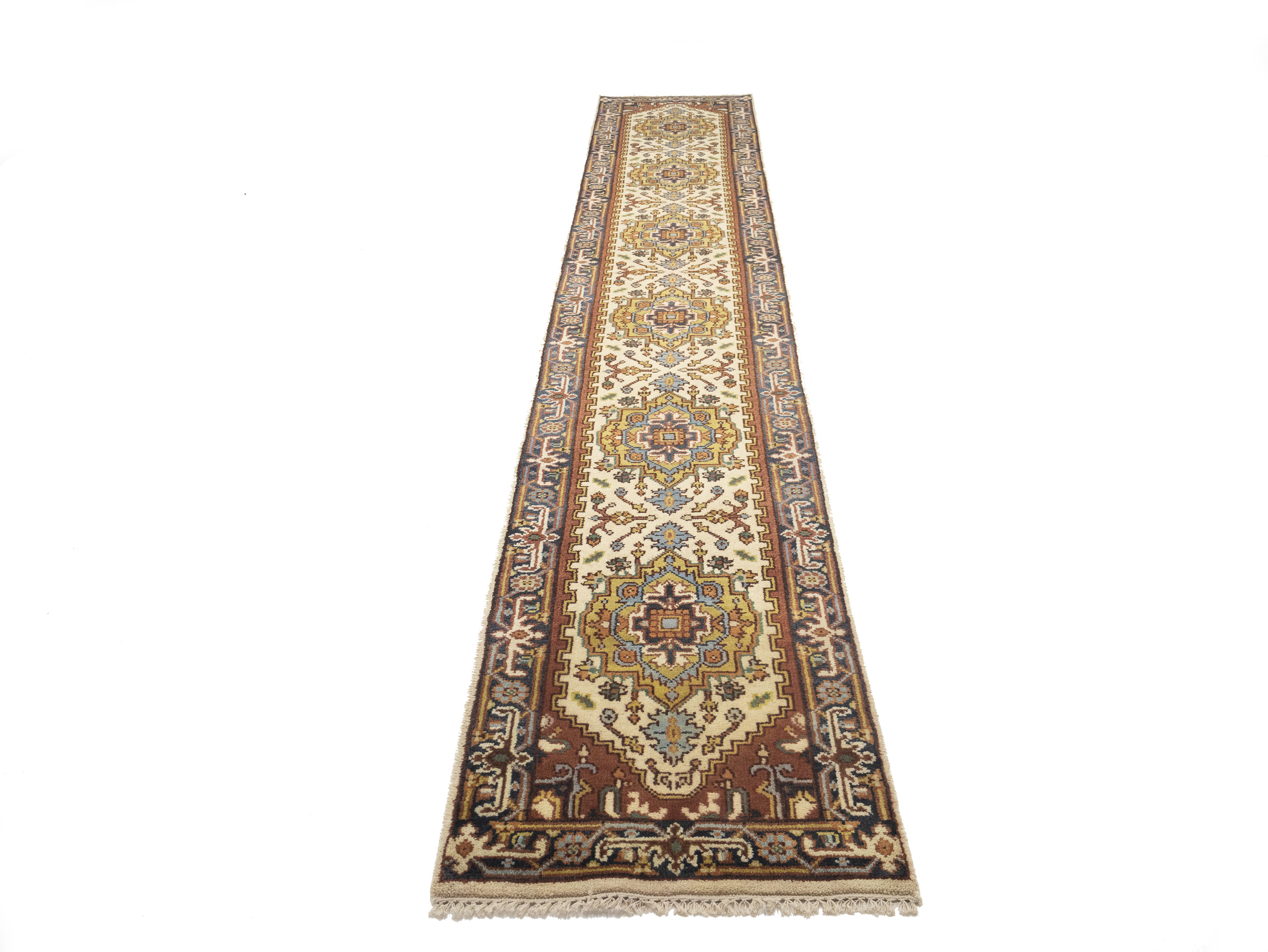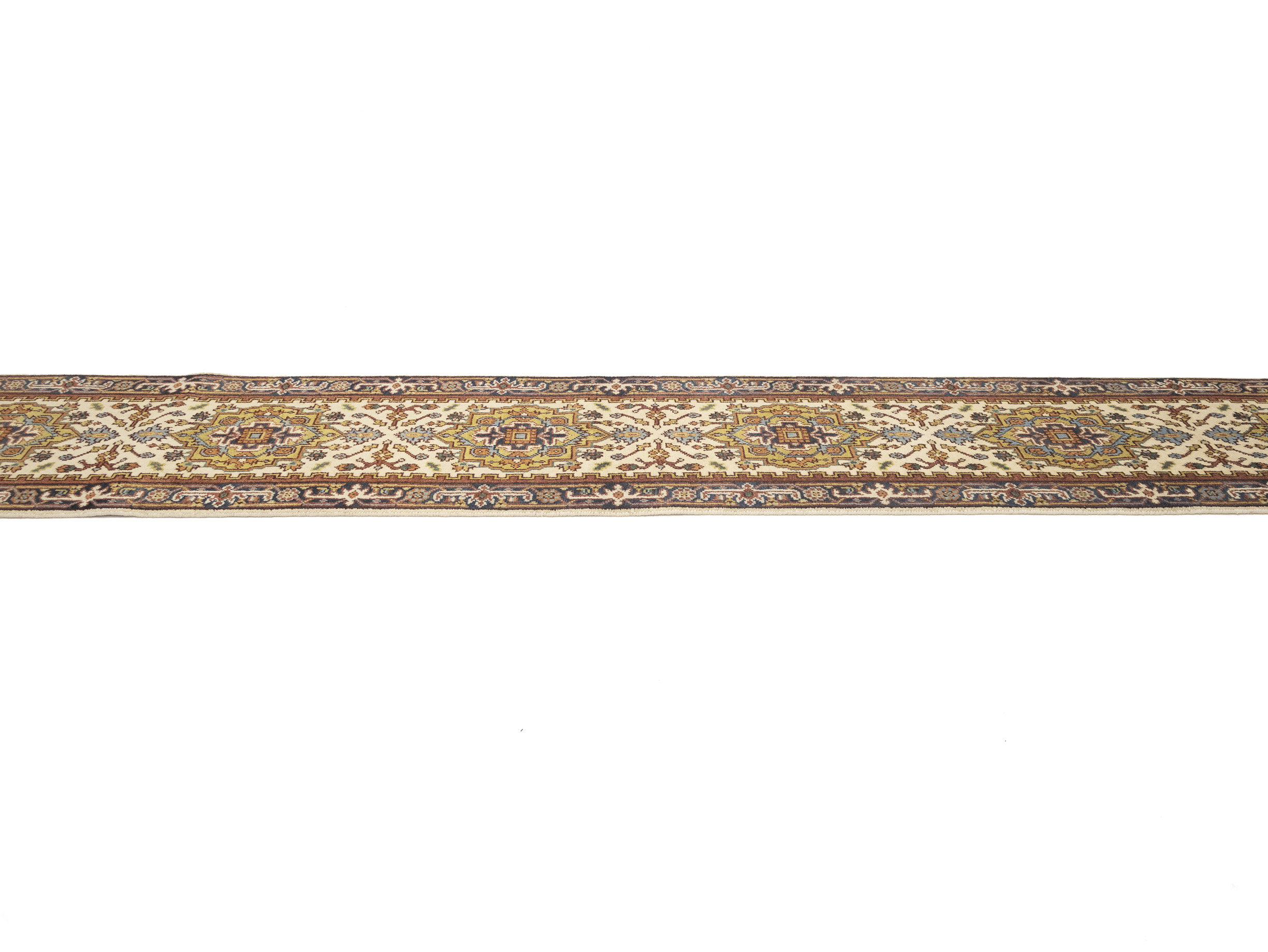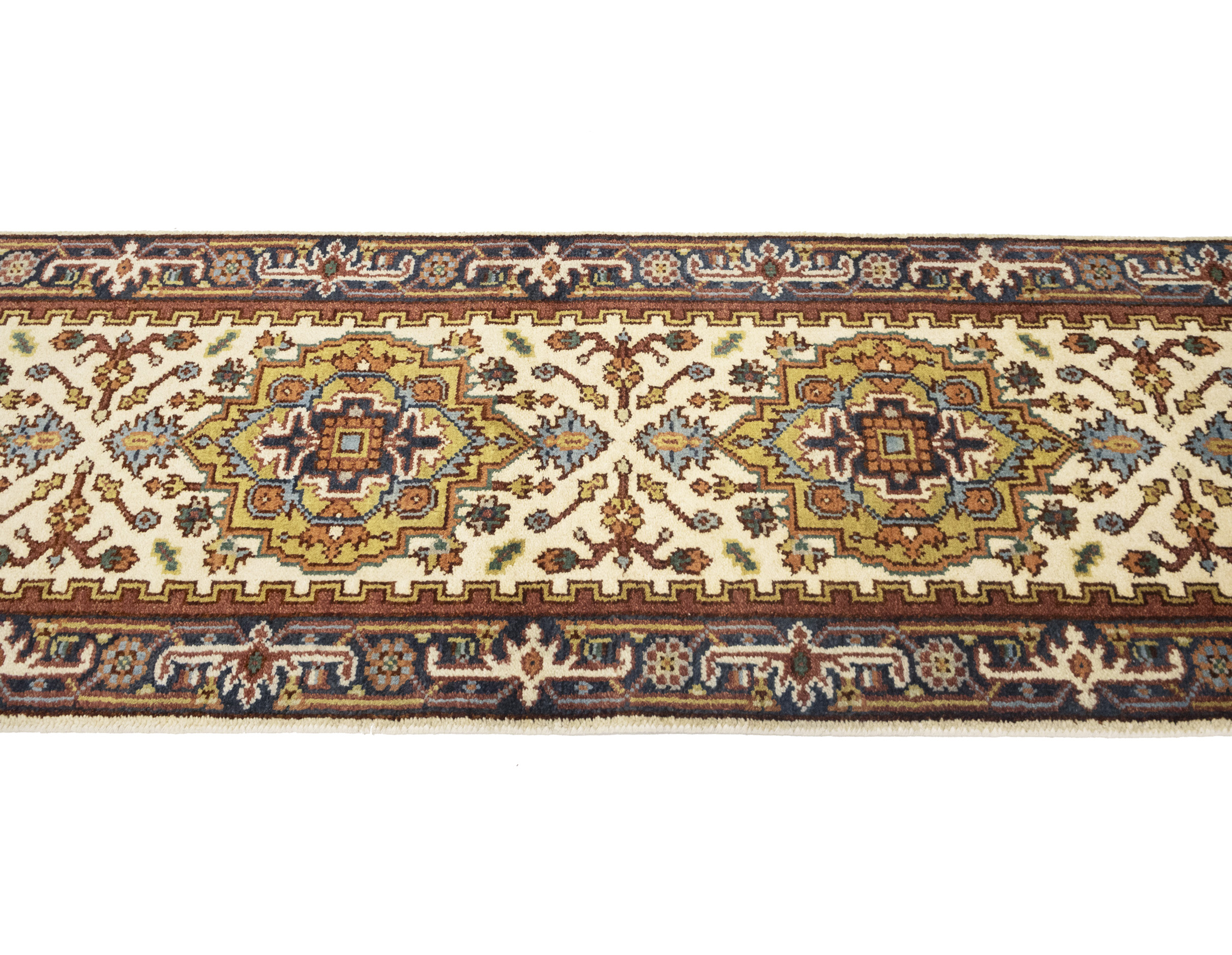 Handmade 2'6X15'5 cream Oriental runner made with vegetable dyes (fine wool pile and cotton foundation), superior knot count, and alluring ancient designs. This Oriental runner never will go out of style and would be among your most valuable treasures.