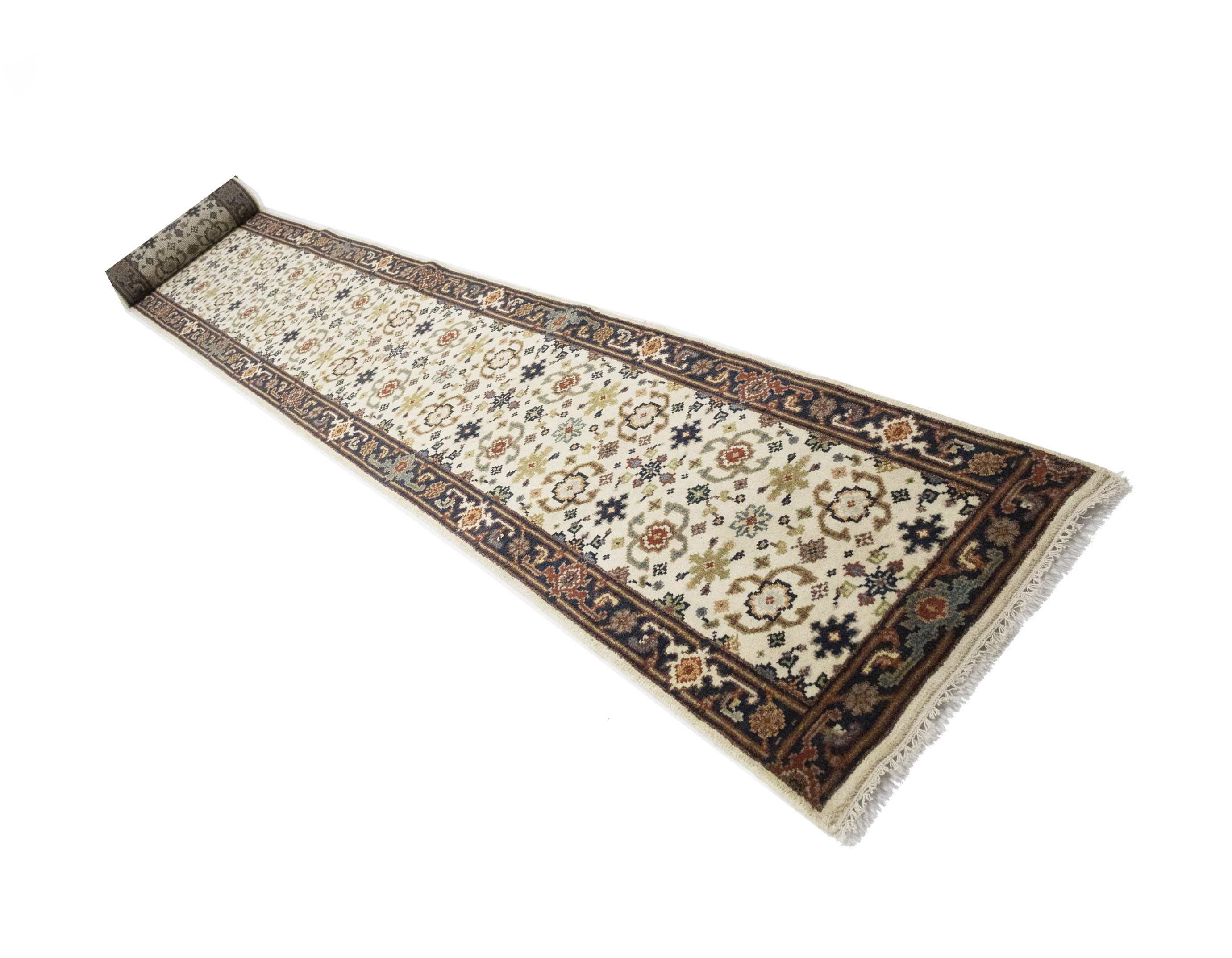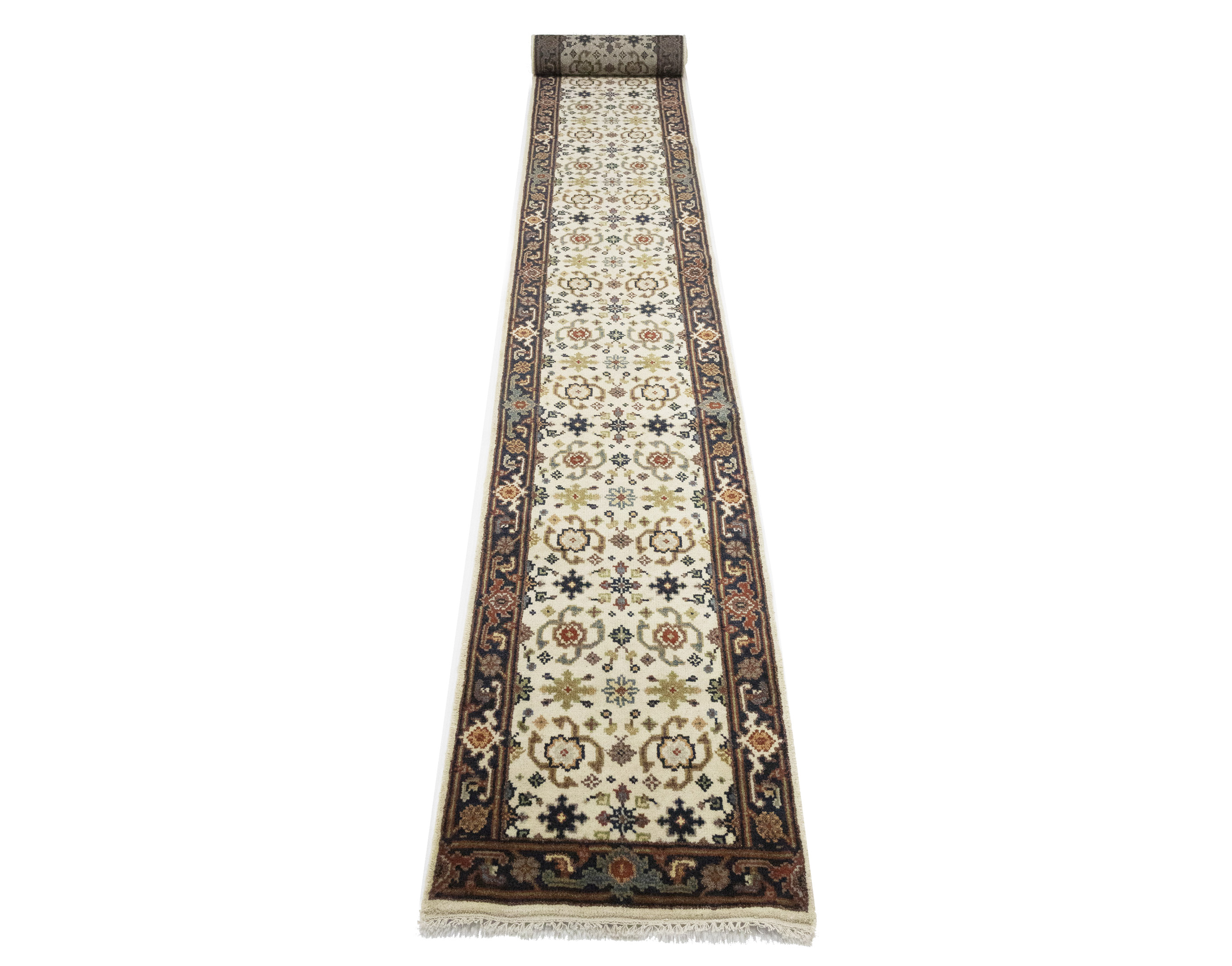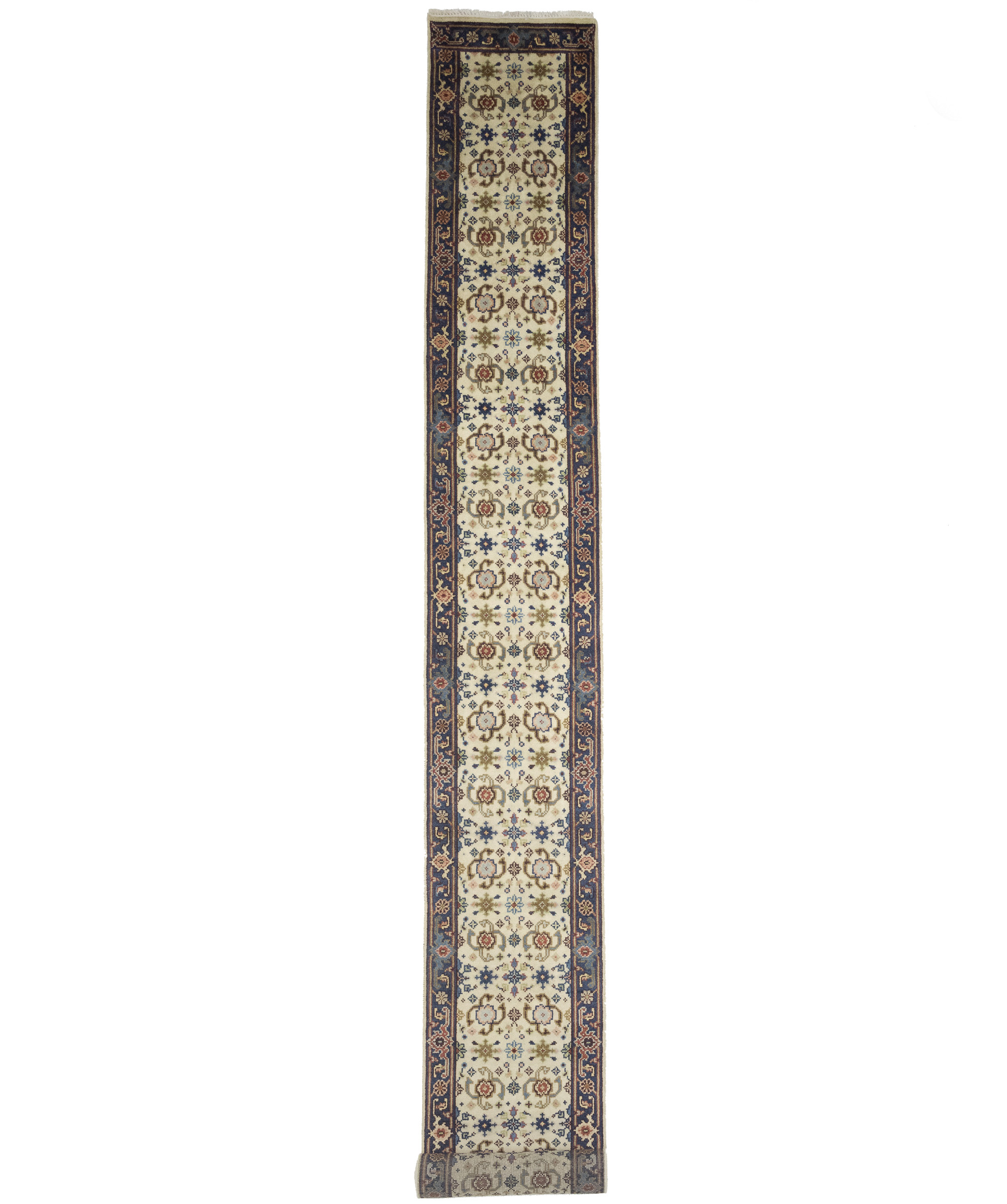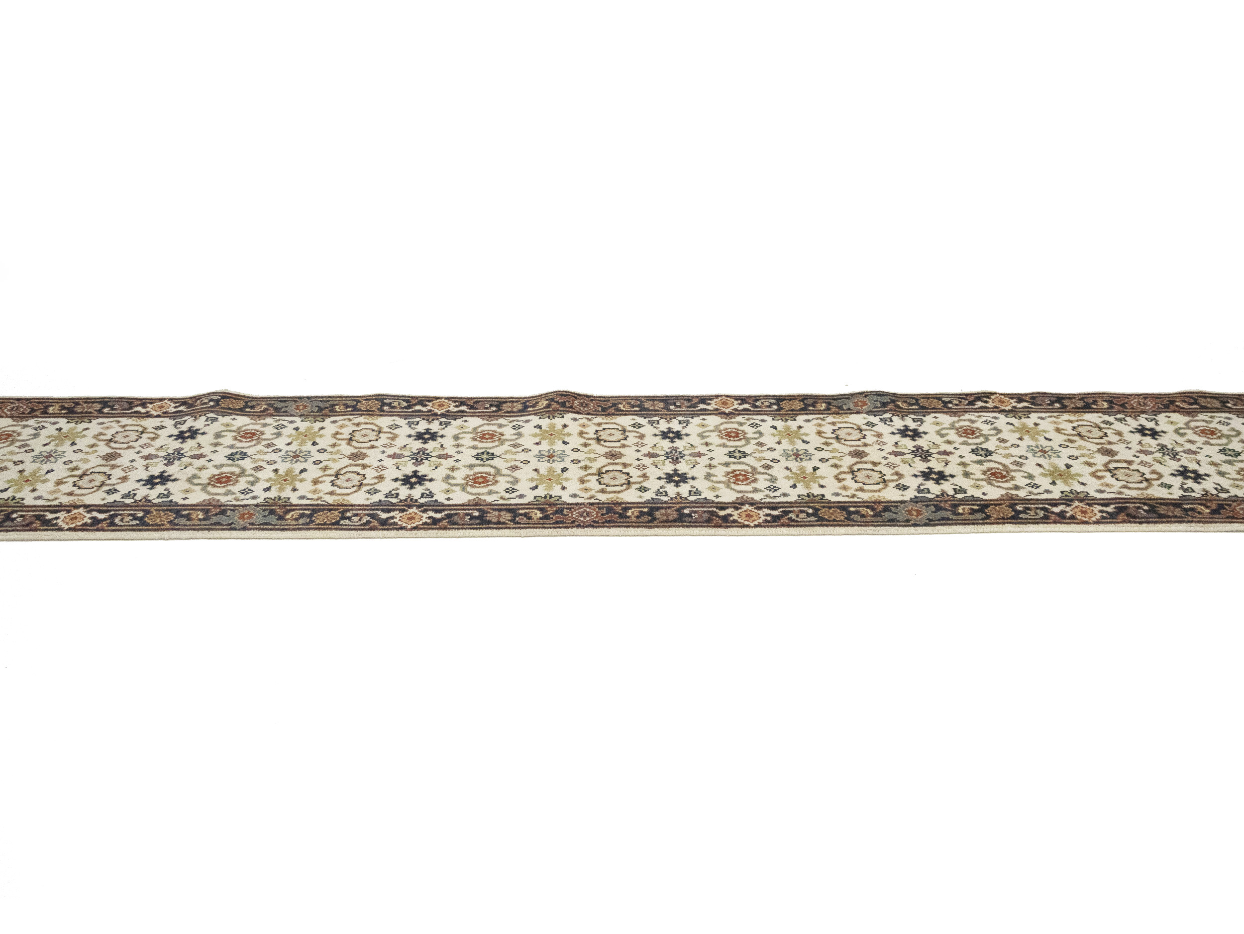 Handmade 2'6X23'4 cream Oriental runner made with vegetable dyes (fine wool pile and cotton foundation), superior knot count, and alluring ancient designs. This Oriental runner never will go out of style and would be among your most valuable treasures.
