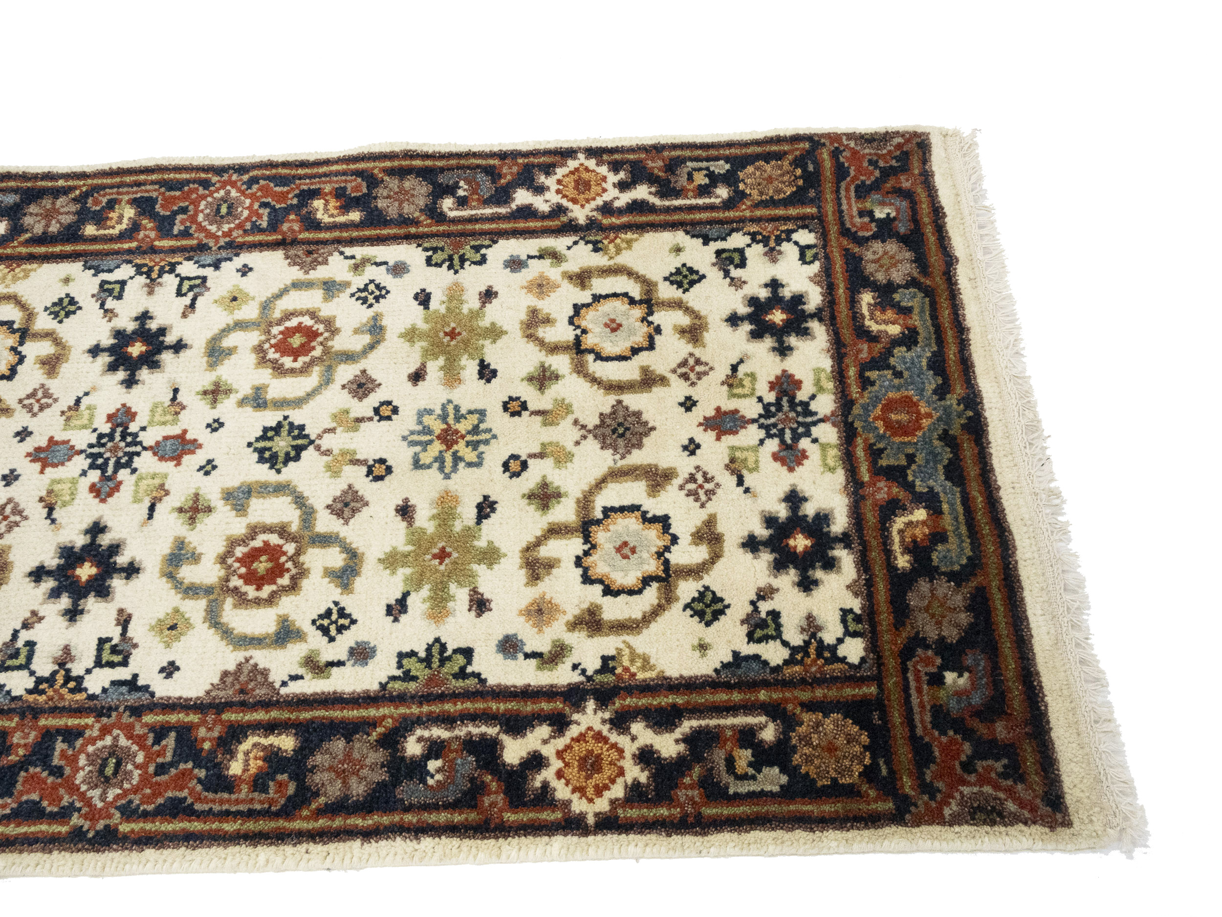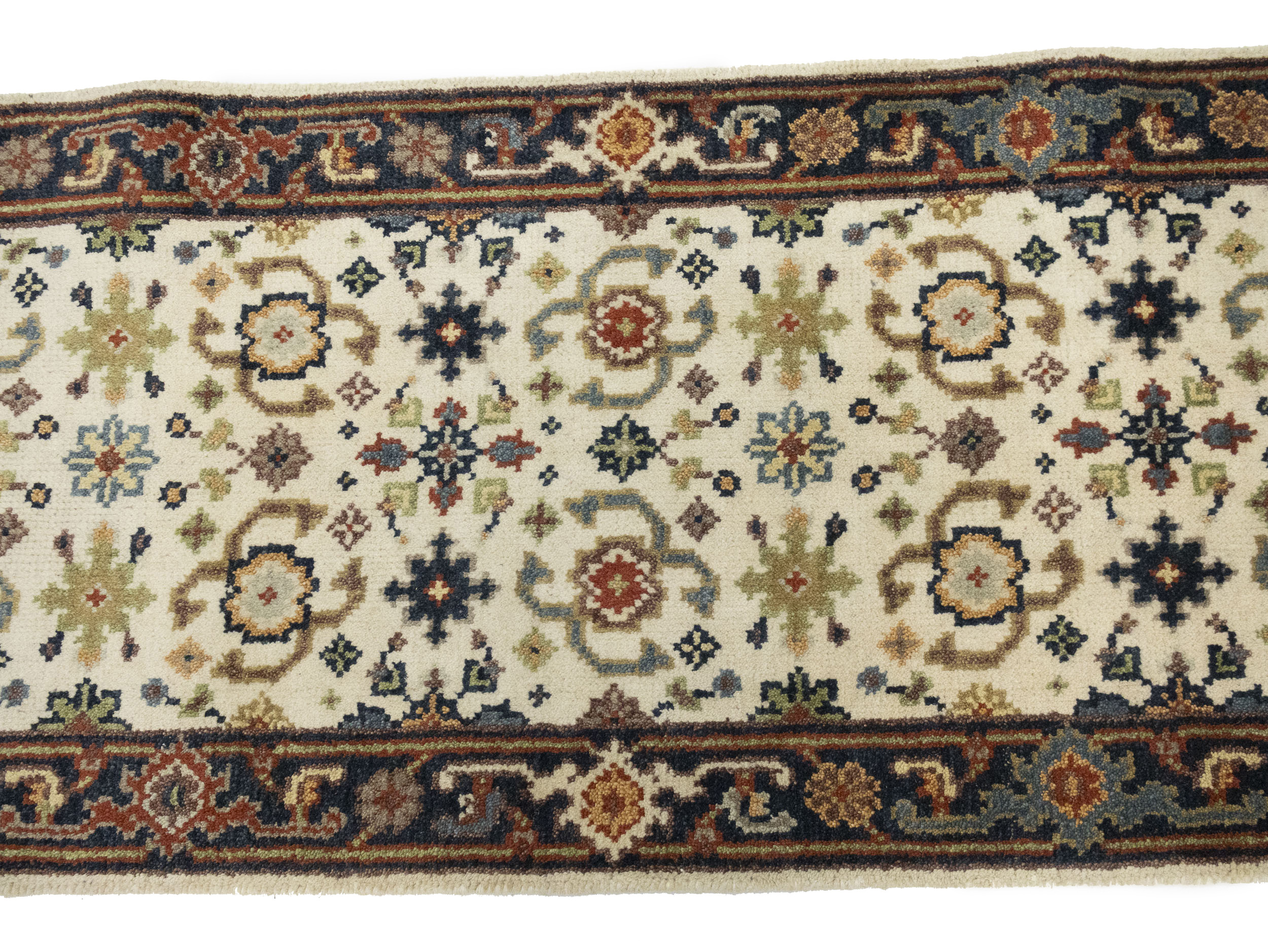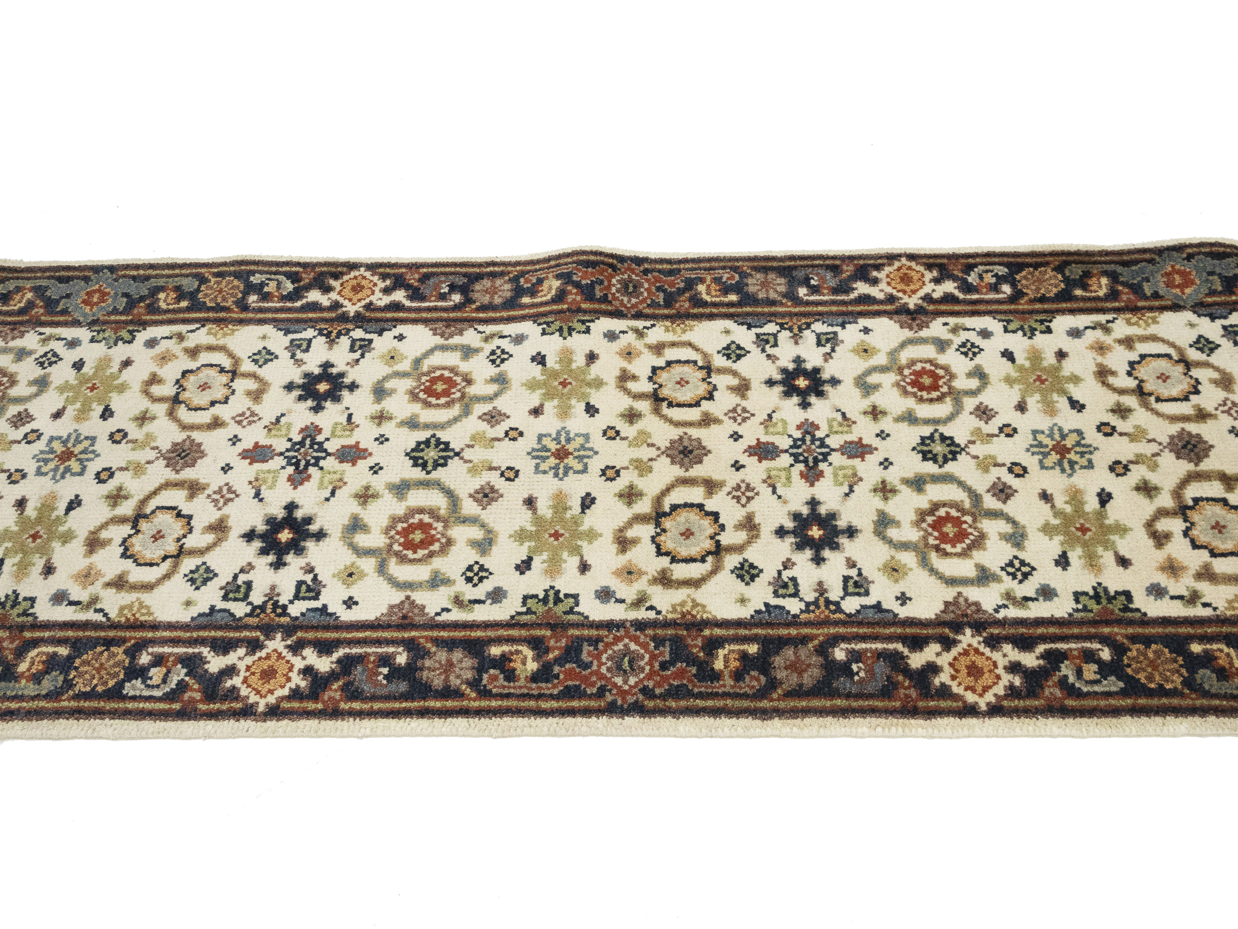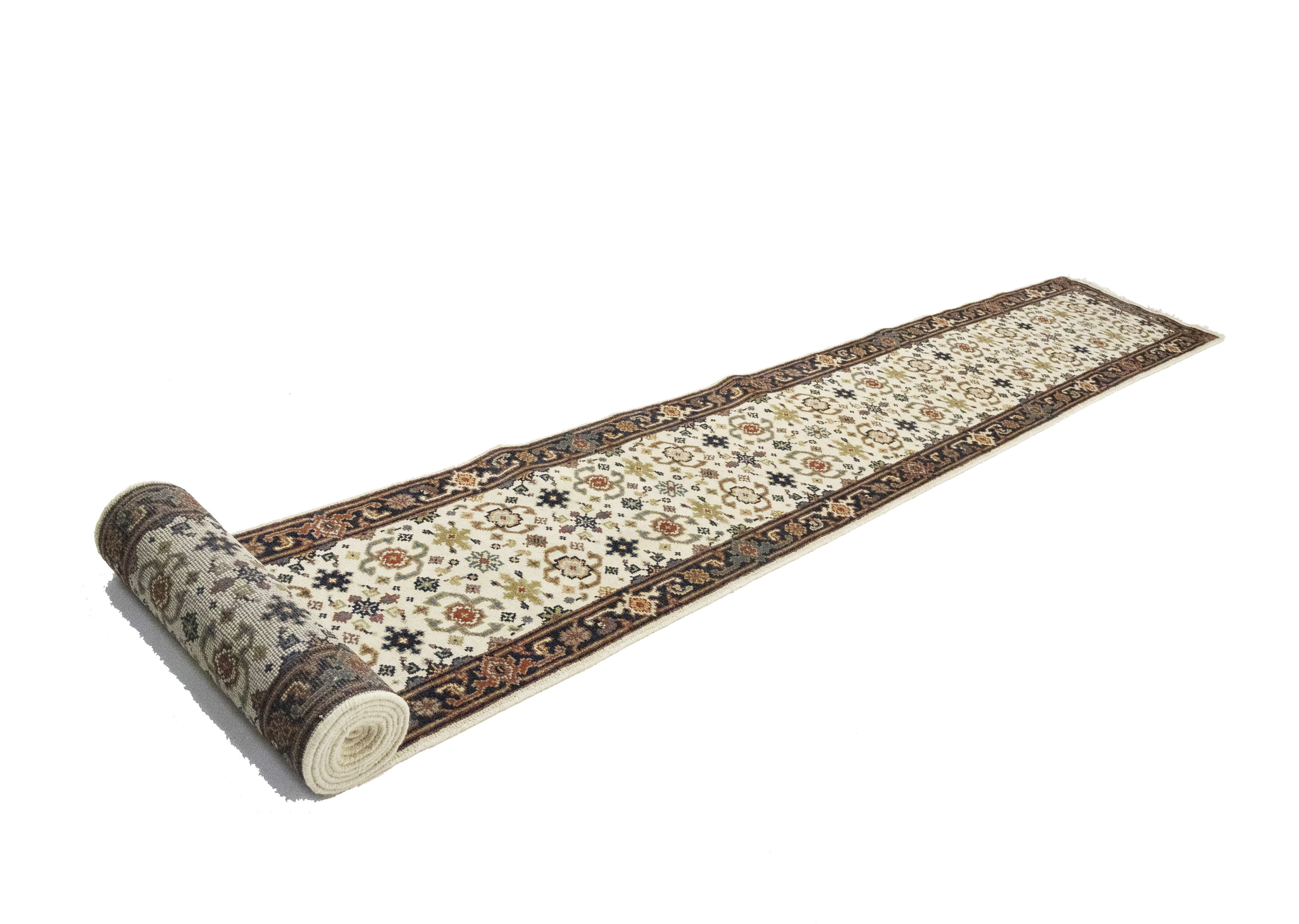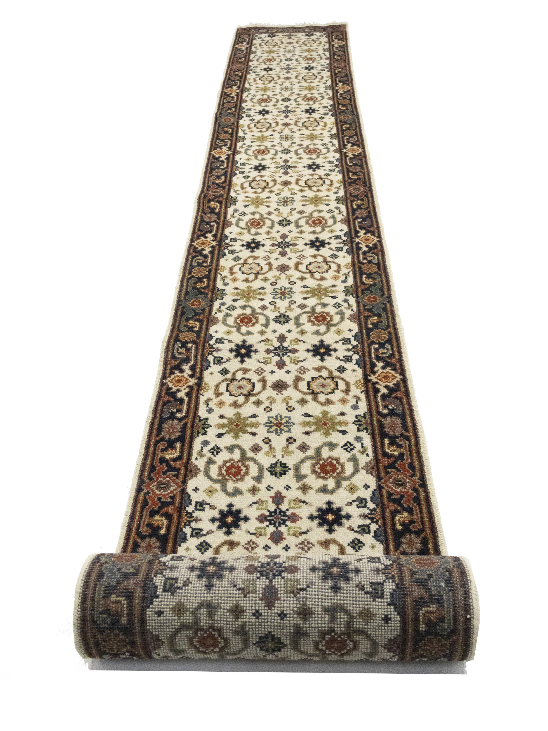 Handmade 2'6X23'4 cream Oriental runner made with vegetable dyes (fine wool pile and cotton foundation), superior knot count, and alluring ancient designs. This Oriental runner never will go out of style and would be among your most valuable treasures.