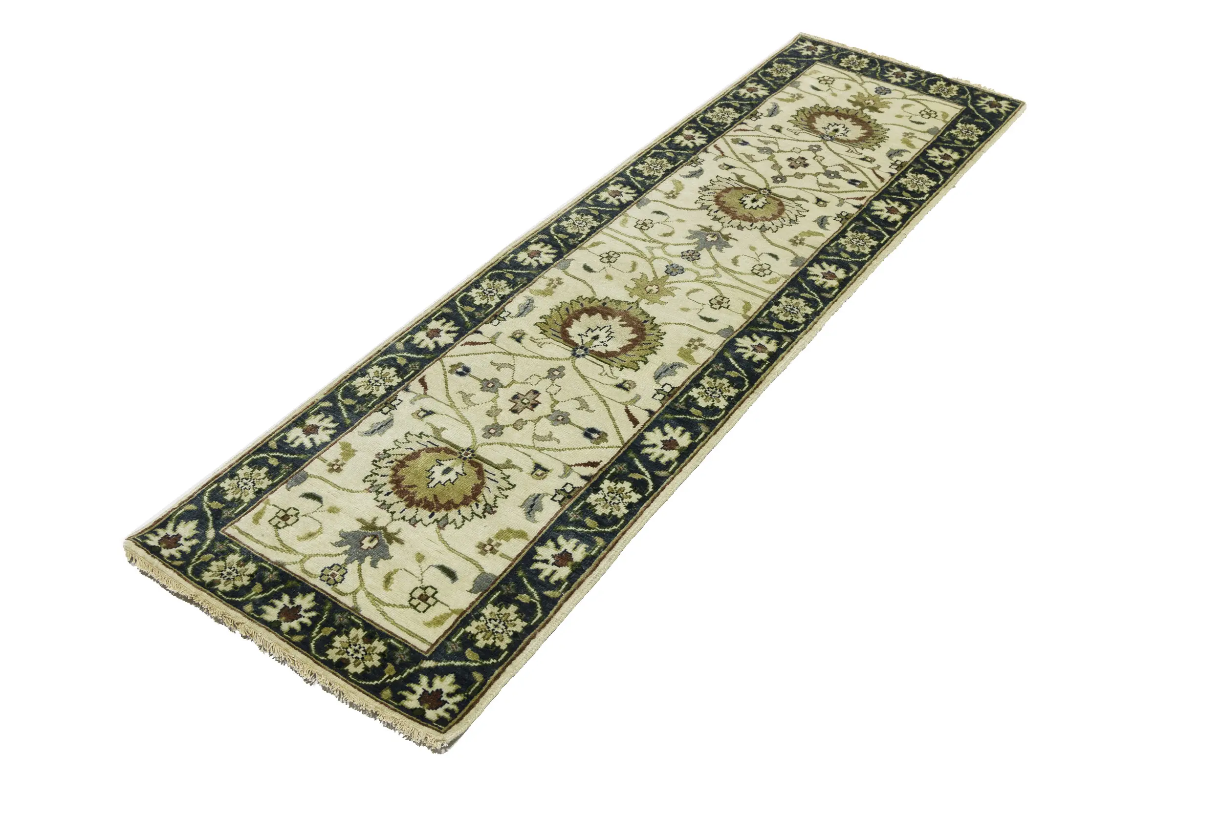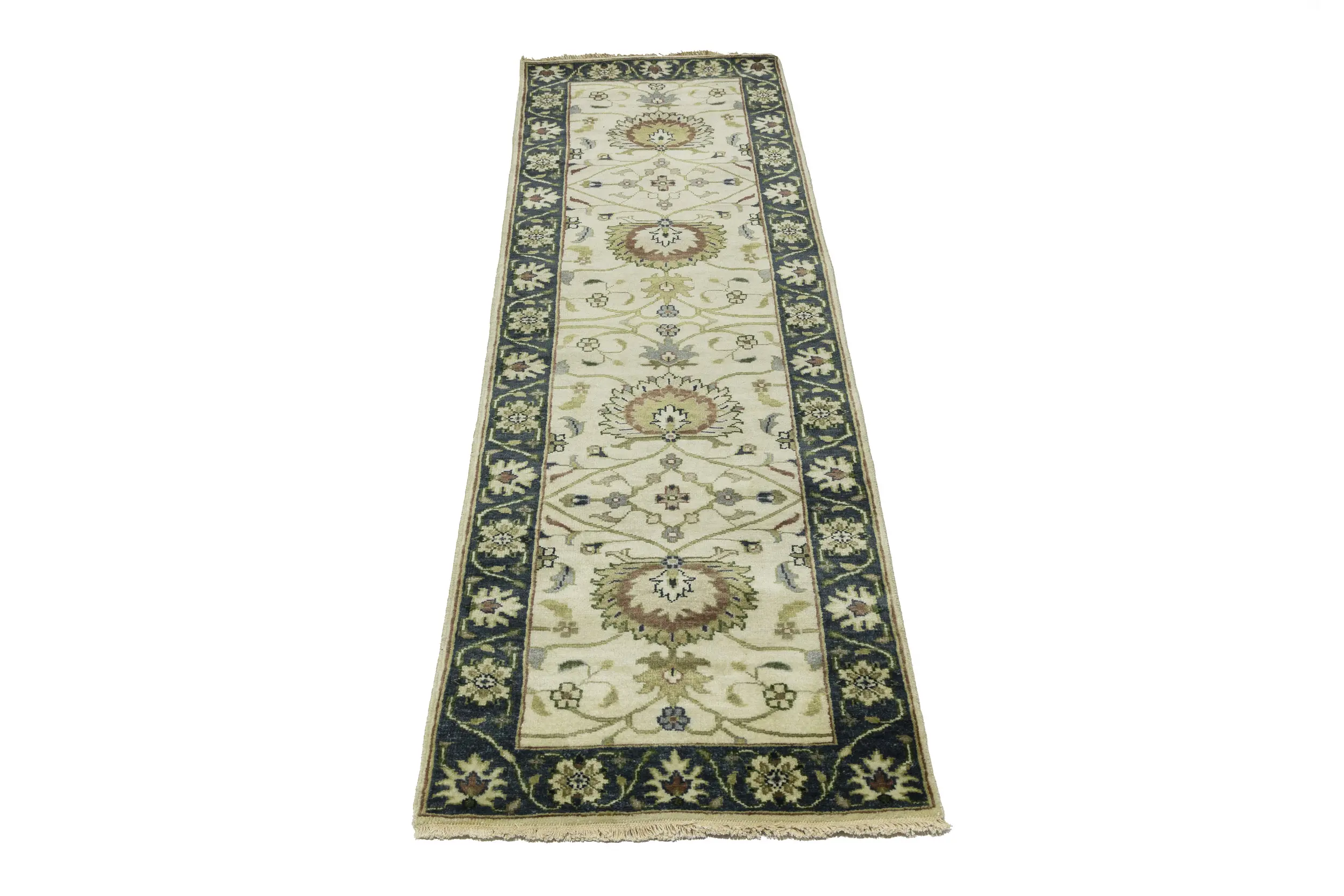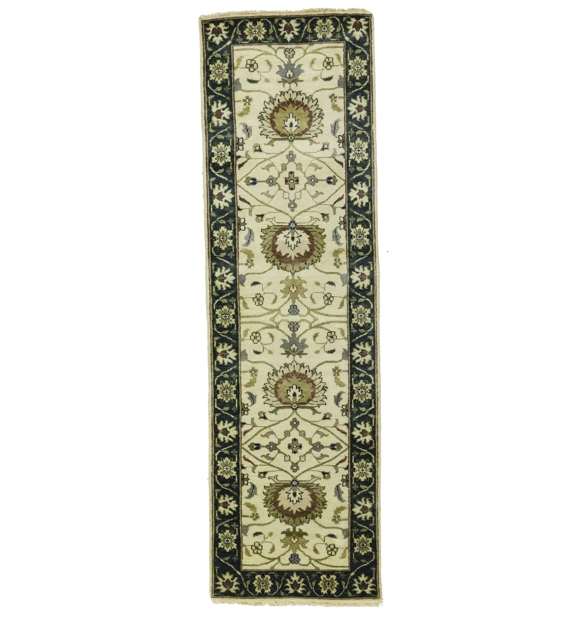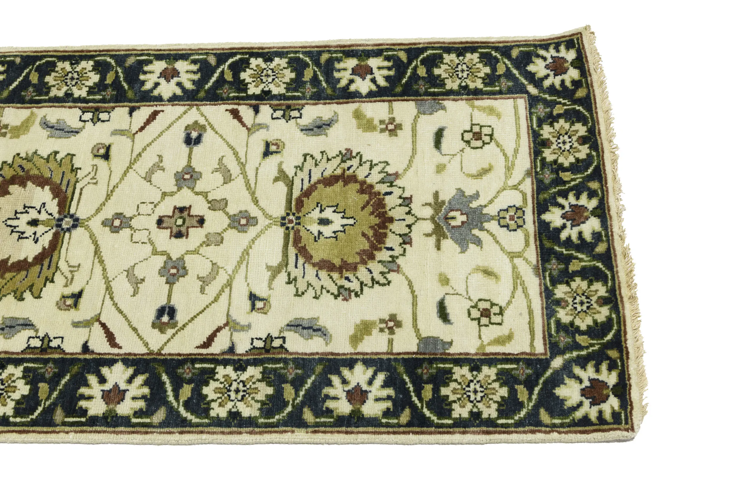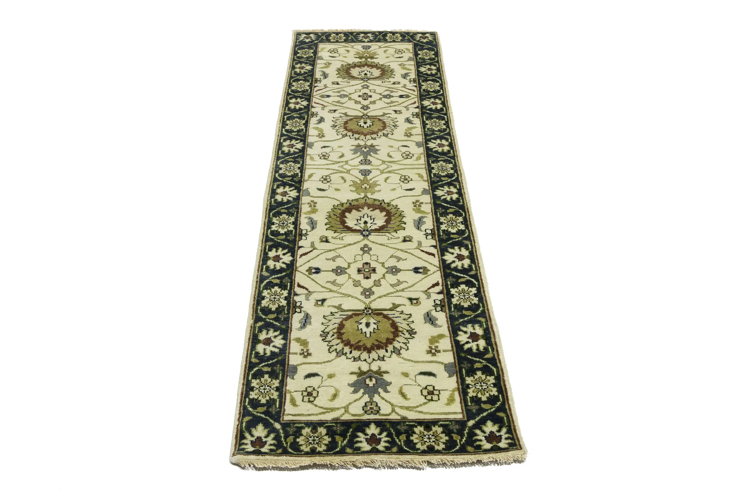 This genuine 2'5X8 cream new Oriental runner was made by the hands of gifted weavers inspired by a variety of spectacular artistic designs, to recreate the aged look of the original piece with a richness of color and ornately patterned background field. What set this vintage style Oriental area runner from the others are the material and dye used (wool pile and cotton foundation), knot count, ancient designs, fantastic grades, and its regional historical connection: it has deep roots, from the story of the people who produced it to the meaning of the symbols and colors displayed across its canvas that have been praised for centuries. This Indian home décor carpet will be completely cozy and inviting that never will go out of style! Also, this Oriental runner would be among your most valuable treasures, it is a great investment that accrues value over time, and it will last for generations because was woven with high-quality, all-natural wool. Environmentally friendly, opulent yet affordable; this rug will give you a thorough amount of character to help define your living space with elegance and warmth that will capture the eyes and attention of your audience (homeowners, designers, decorators, family and friends).