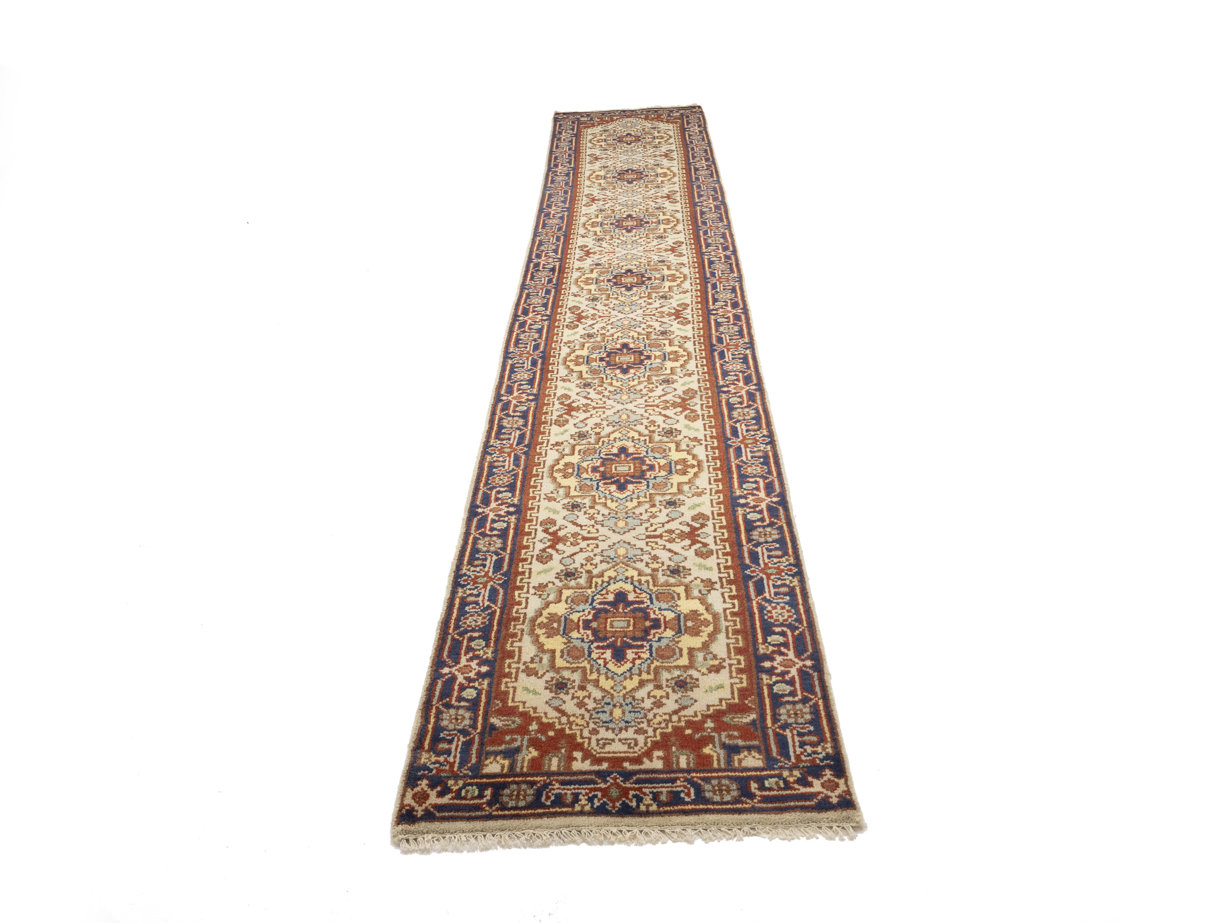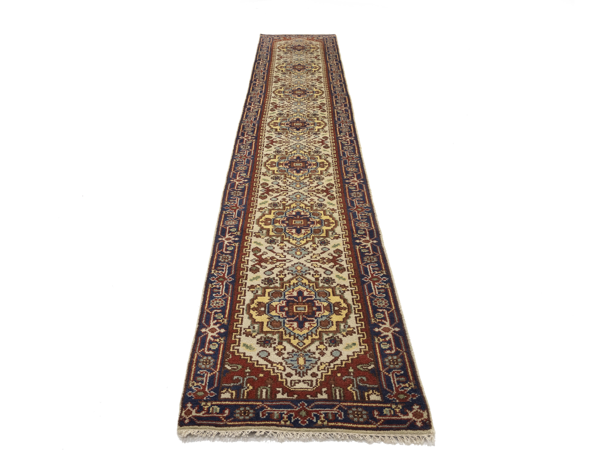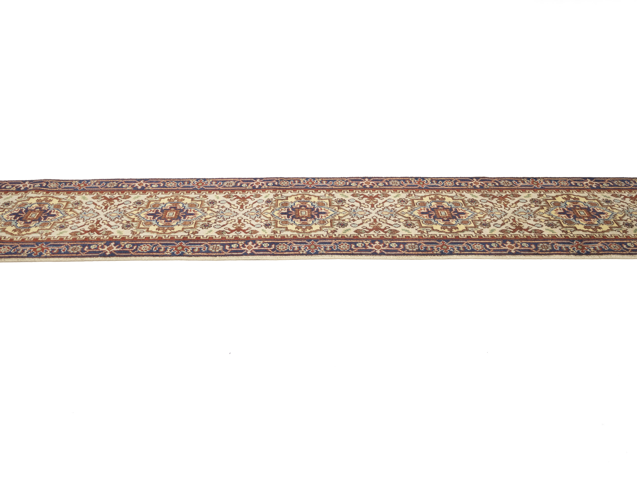 Handmade 3X16 cream Oriental runner made with vegetable dyes (fine wool pile and cotton foundation), superior knot count, and appealing ancient designs. This Oriental runner never will go out of style and would be among your most valuable treasures.