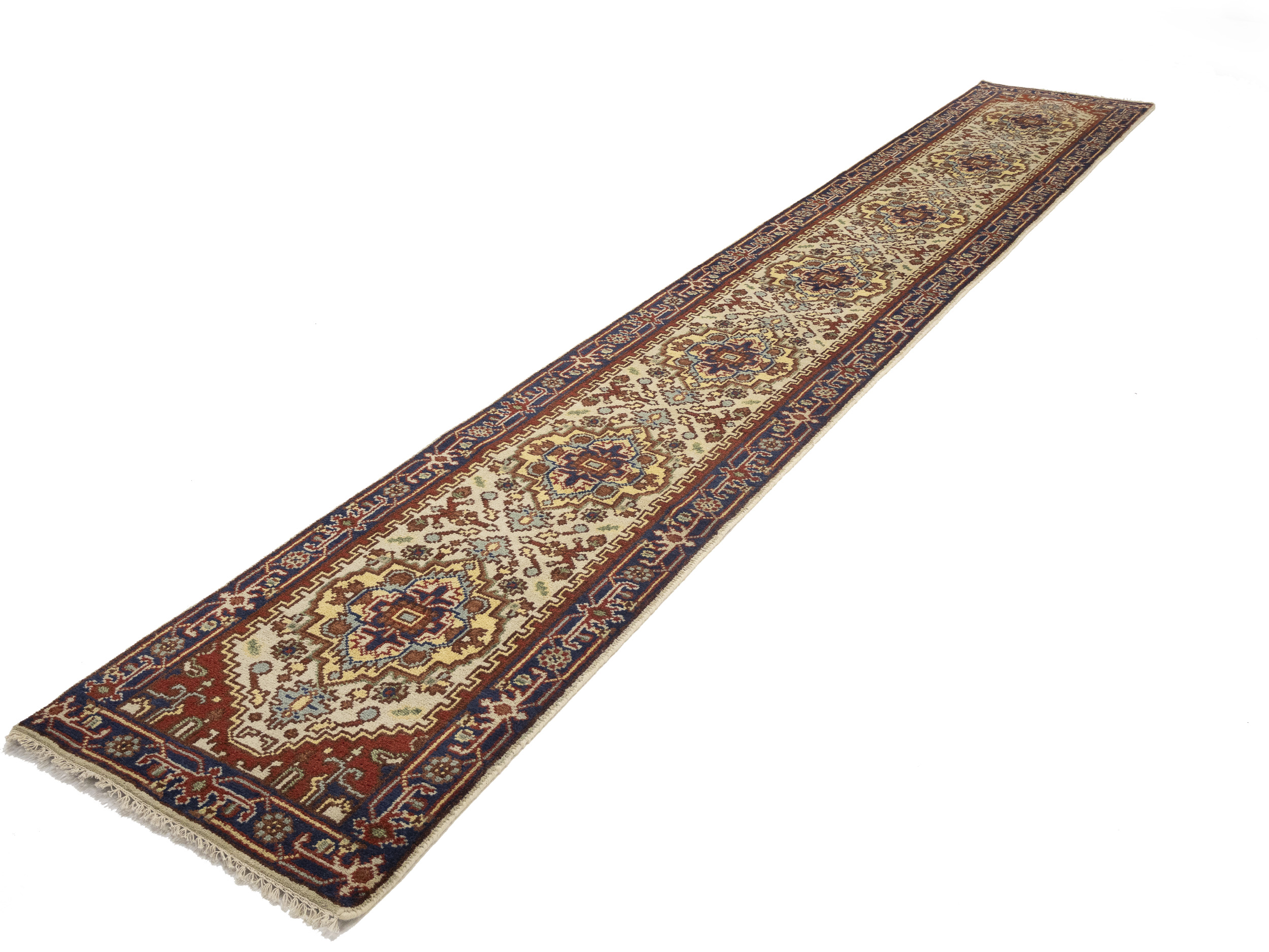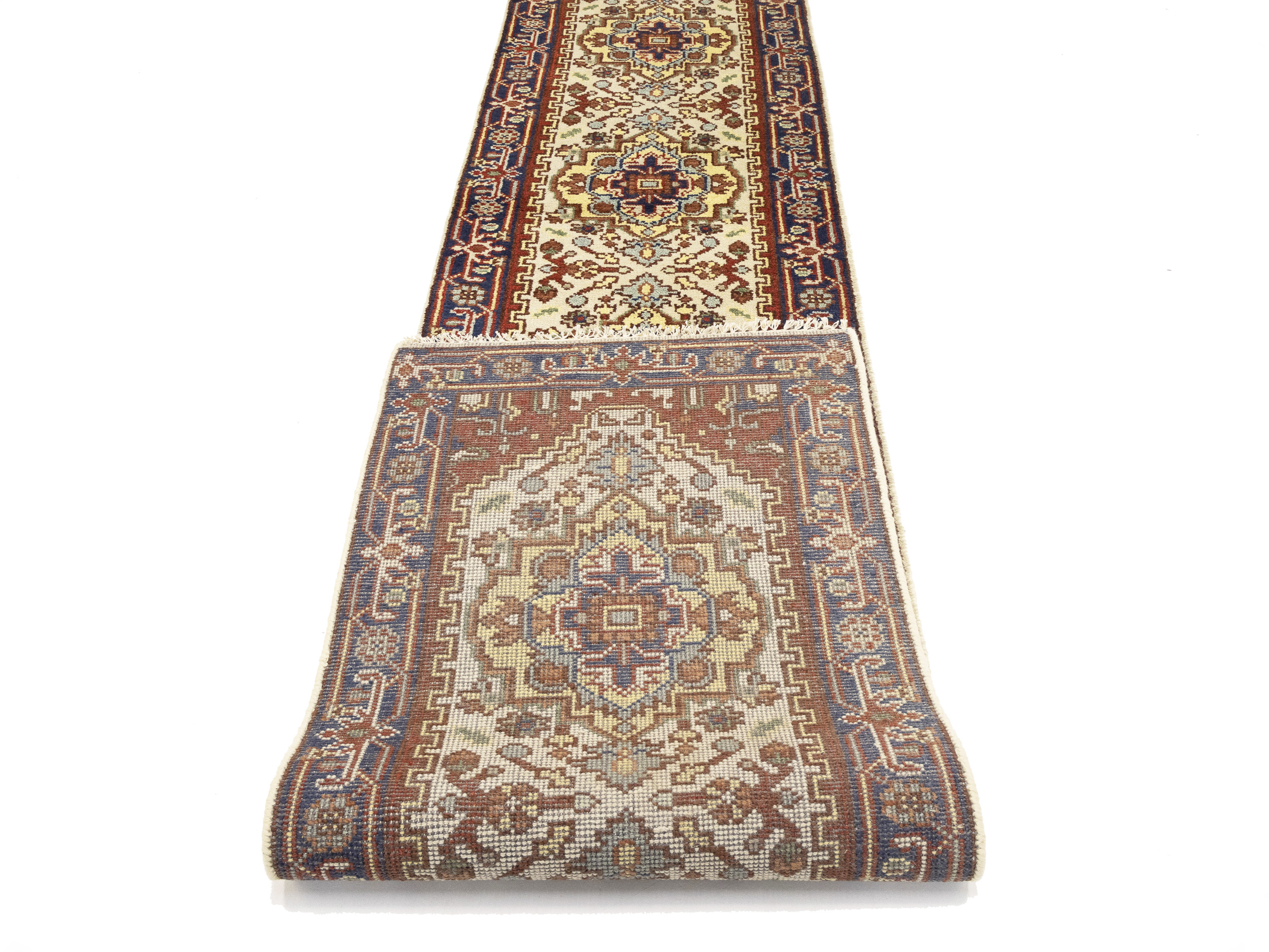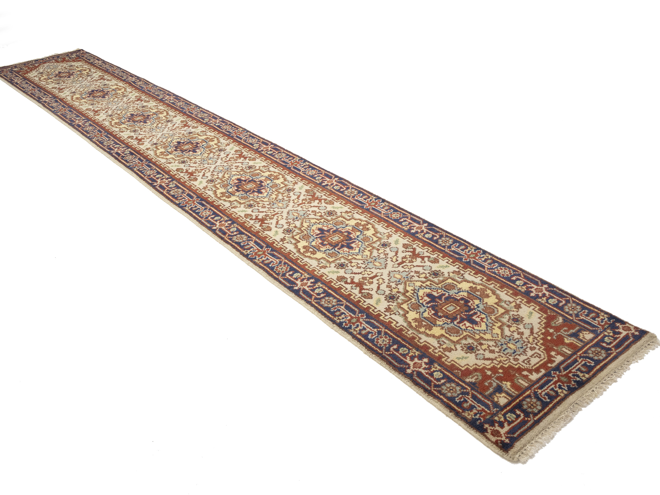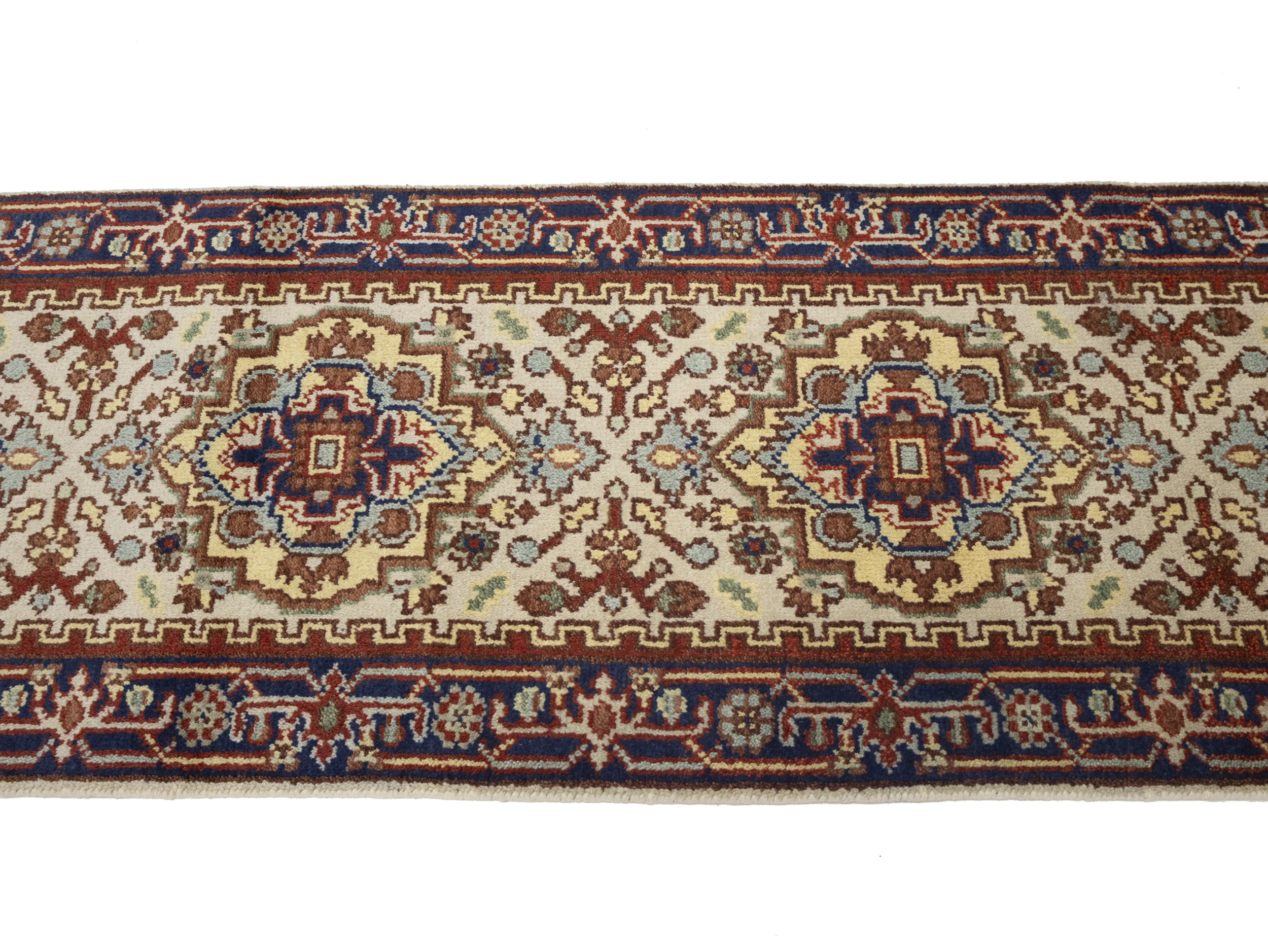 Handmade 3X16 cream Oriental runner made with vegetable dyes (fine wool pile and cotton foundation), superior knot count, and appealing ancient designs. This Oriental runner never will go out of style and would be among your most valuable treasures.