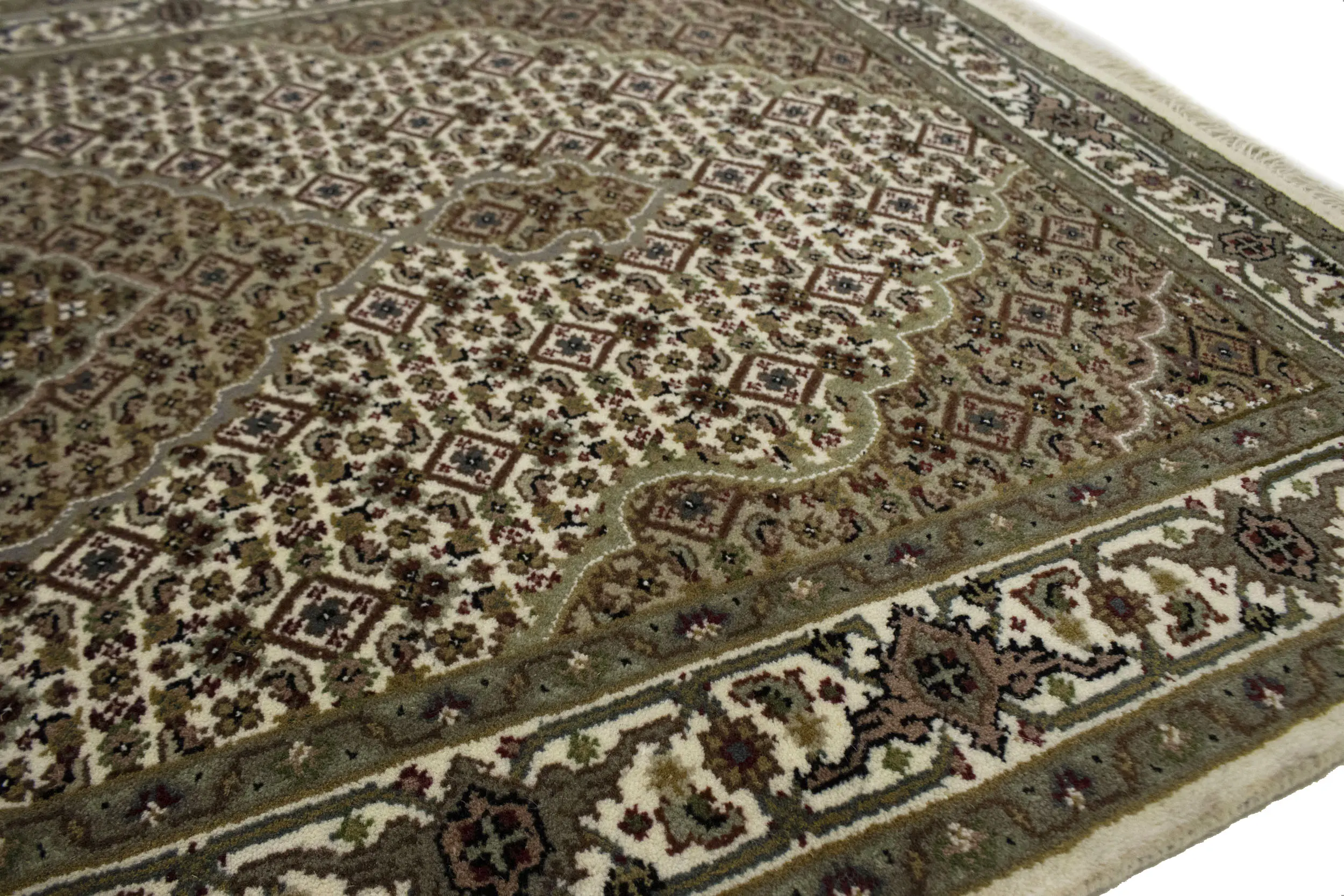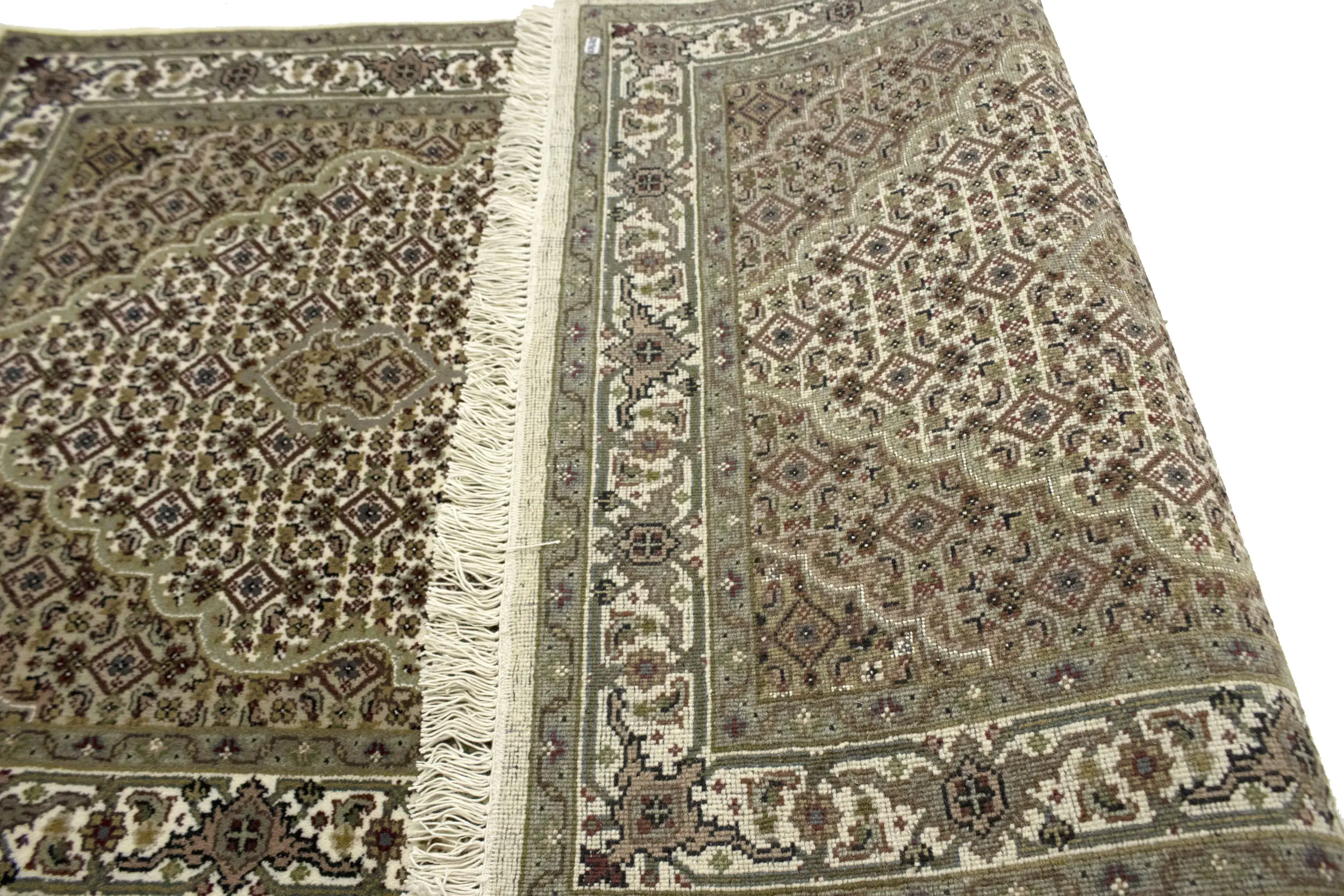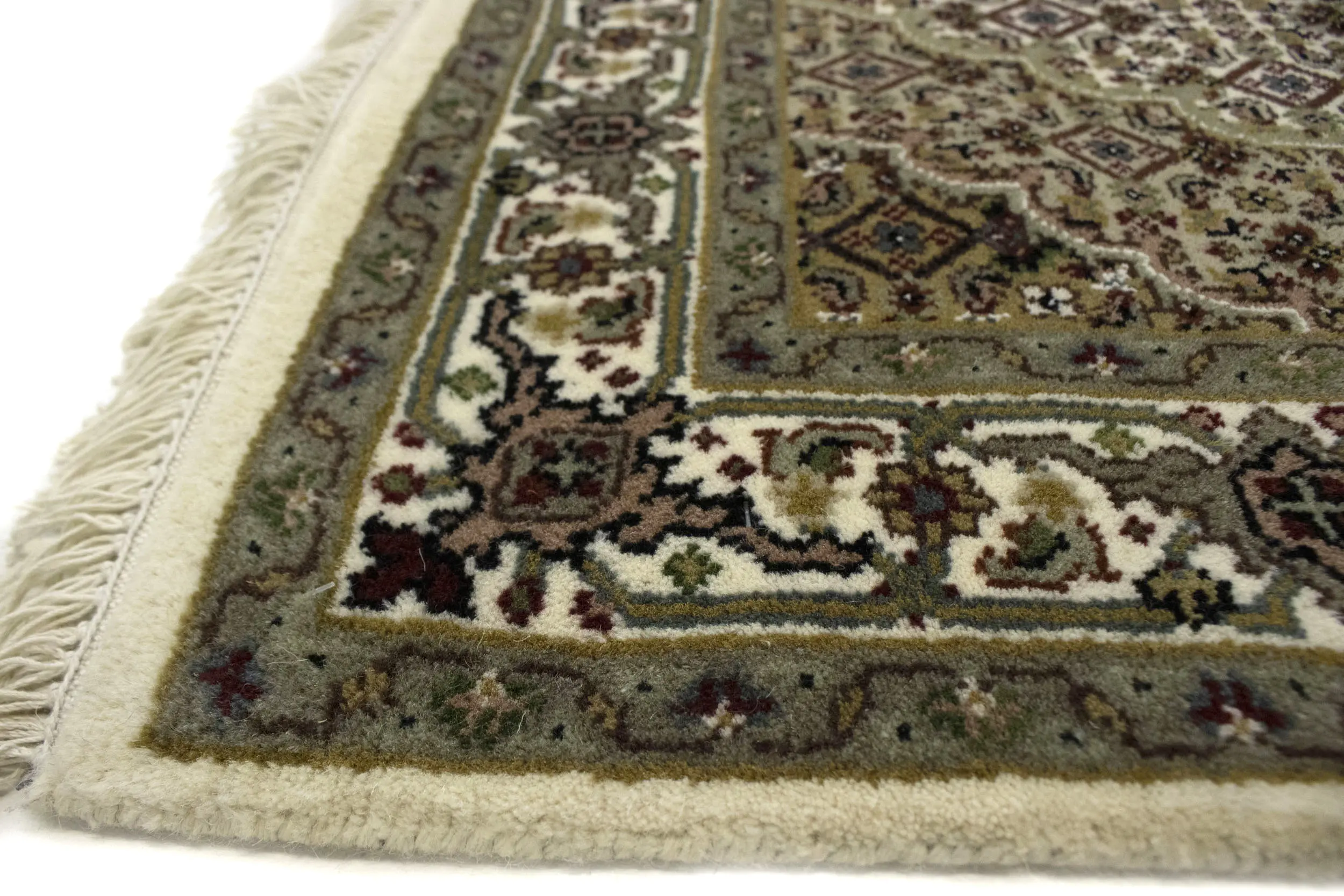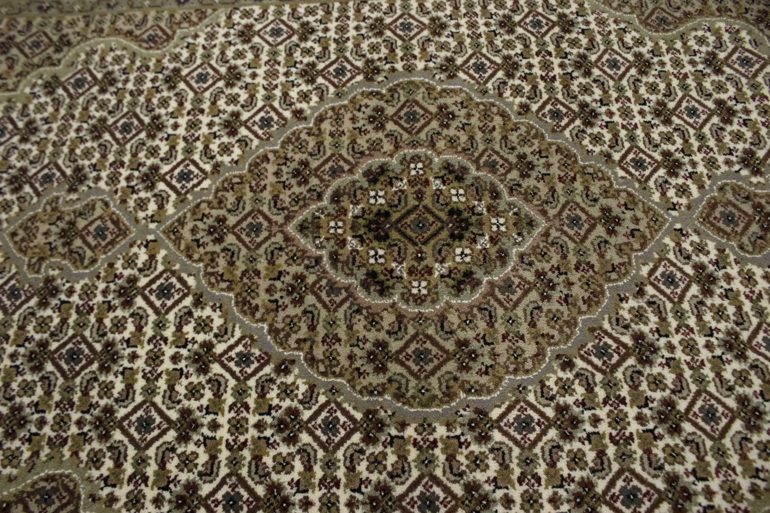 This authentic 3X5 cream new Oriental rug was crafted by the hands of skilled weavers enthused by a variety of lovely artistic designs, to recreate the aged look of the unique piece with a richness of color and beautifully elaborated background field. What set this vintage style Oriental area rug from the others are the material and dye used (wool pile and cotton foundation), knot count, ancient designs, fantastic grades, and its regional historical connection: it has deep roots, from the story of the people who produced it to the meaning of the symbols and colors displayed across its canvas that have been praised for centuries. This Indian home décor carpet will be completely cozy and inviting that never will go out of style! Also, this Oriental rug would be among your most valuable treasures, it is a great investment that increase in value over time, and it will last for generations because was woven with high-quality, all-natural wool. Environmentally friendly, opulent yet affordable; this rug/runner will give you a thorough amount of character to help define your living space with sophistication and warmth that will capture the eyes and attention of your audience (homeowners, designers, decorators, family and friends). OT-2443