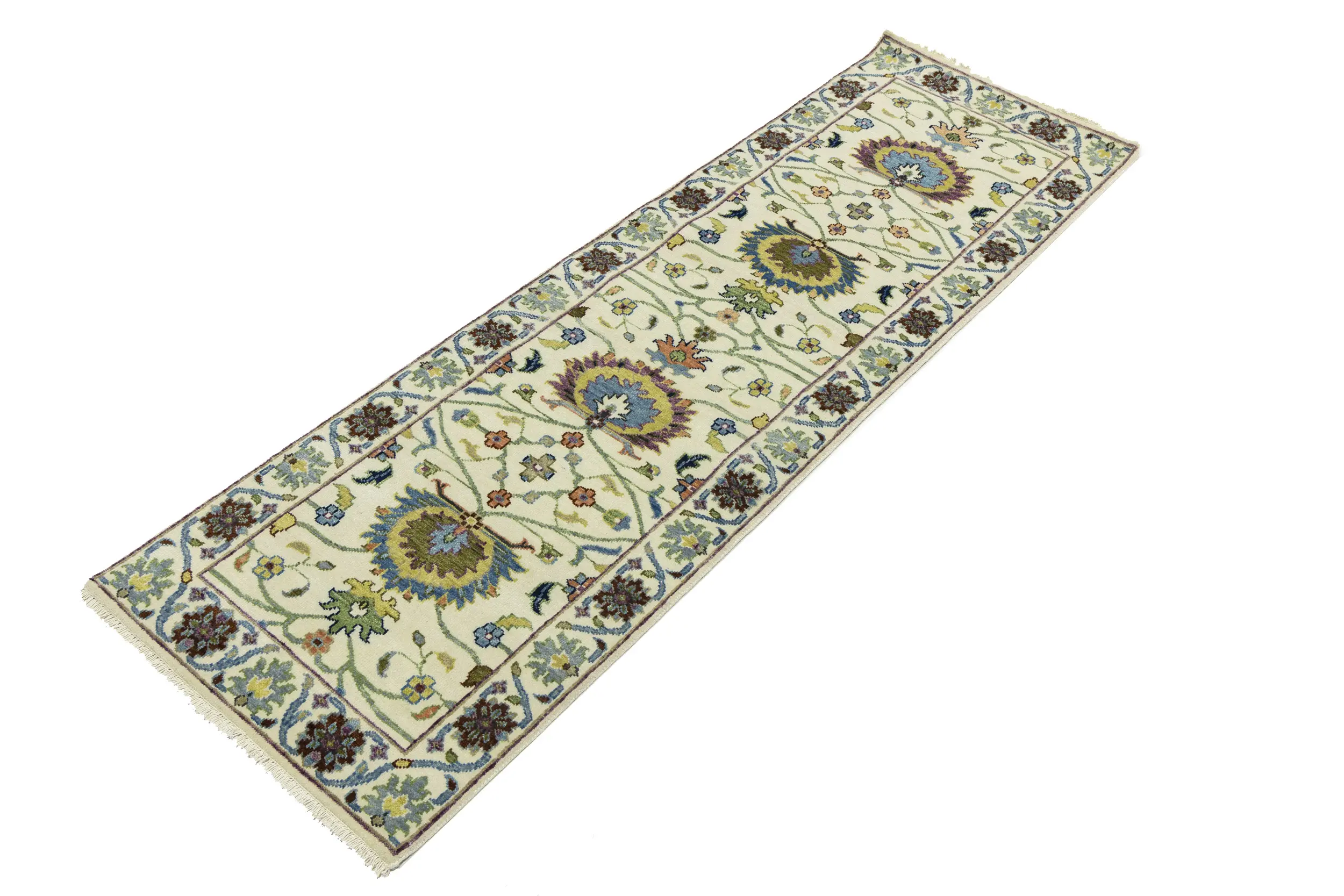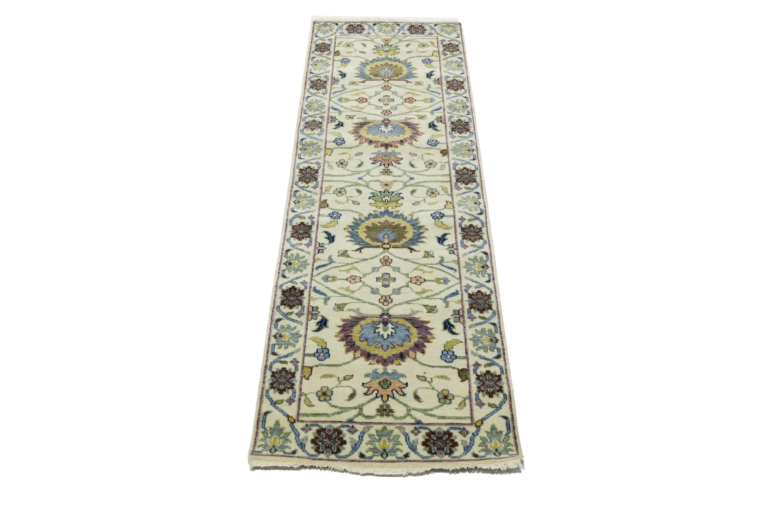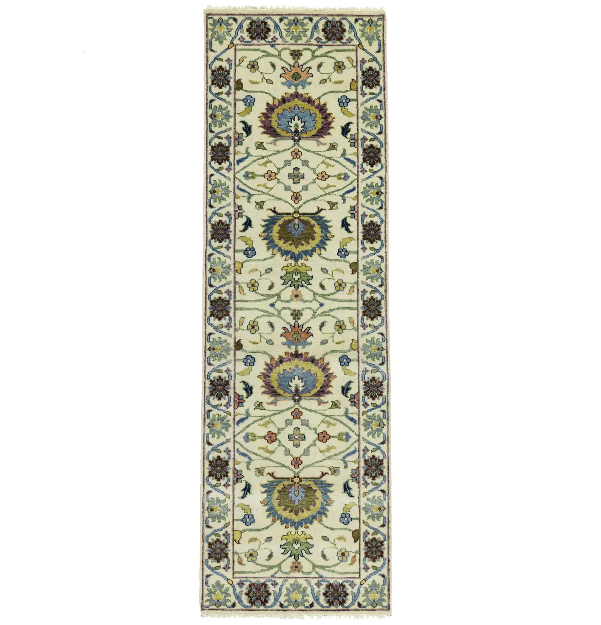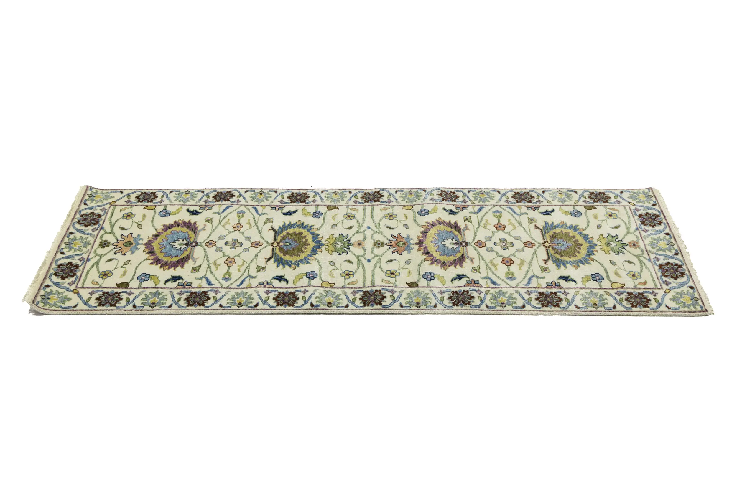 This genuine 3X8 cream new Oriental runner was made by the hands of gifted weavers inspired by a variety of spectacular artistic designs, to recreate the aged look of the original piece with a richness of color and ornately patterned background field. What set this vintage style Oriental area runner from the others are the material and dye used (wool pile and cotton foundation), knot count, ancient designs, fantastic grades, and its regional historical connection: it has deep roots, from the story of the people who produced it to the meaning of the symbols and colors displayed across its canvas that have been praised for centuries. This Indian home décor carpet will be completely cozy and inviting that never will go out of style! Also, this Oriental runner would be among your most valuable treasures, it is a great investment that accrues value over time, and it will last for generations because was woven with high-quality, all-natural wool. Environmentally friendly, opulent yet affordable; this rug will give you a thorough amount of character to help define your living space with elegance and warmth that will capture the eyes and attention of your audience (homeowners, designers, decorators, family and friends).