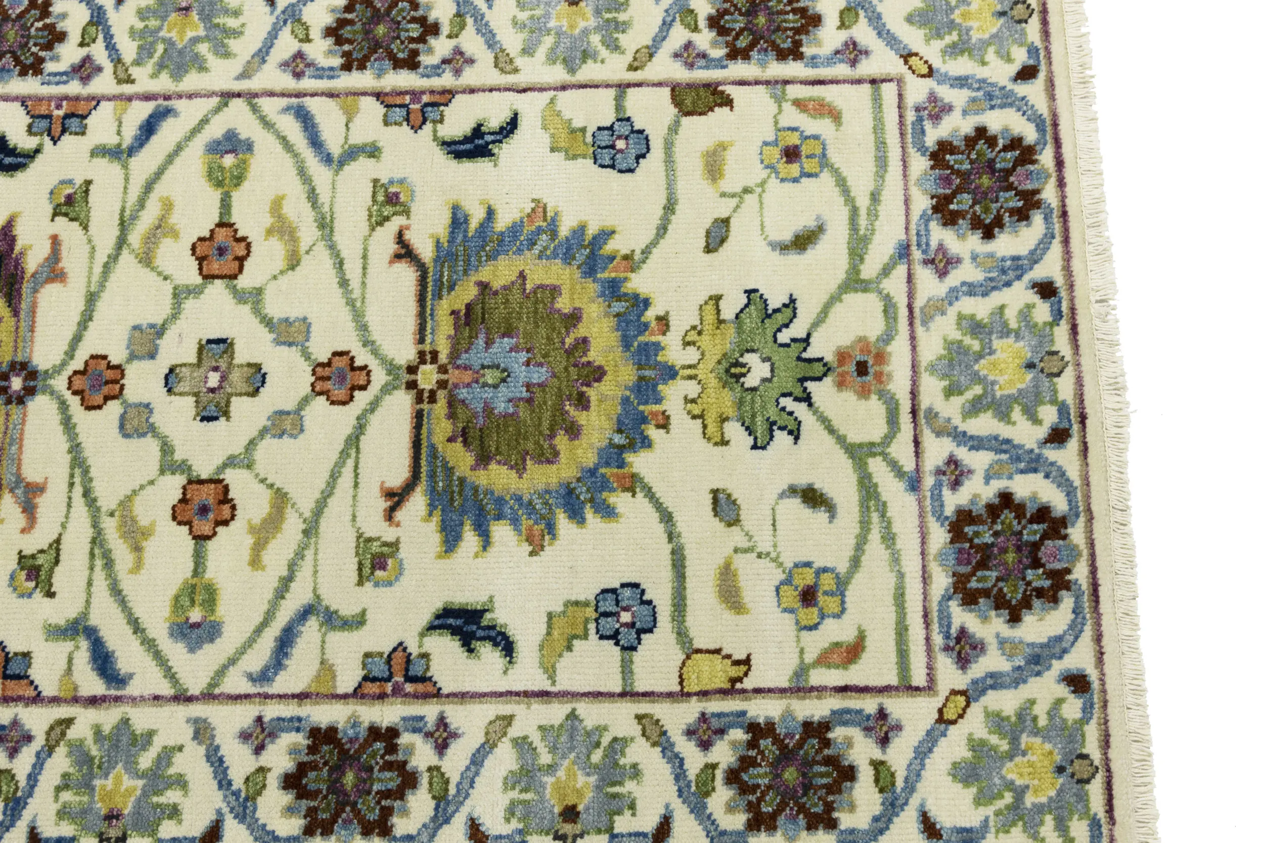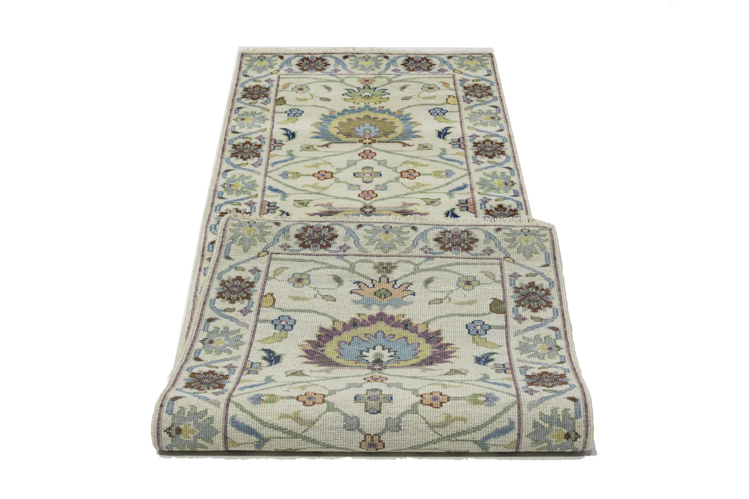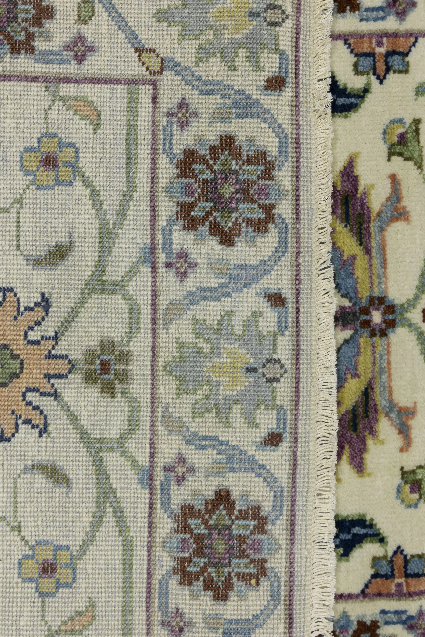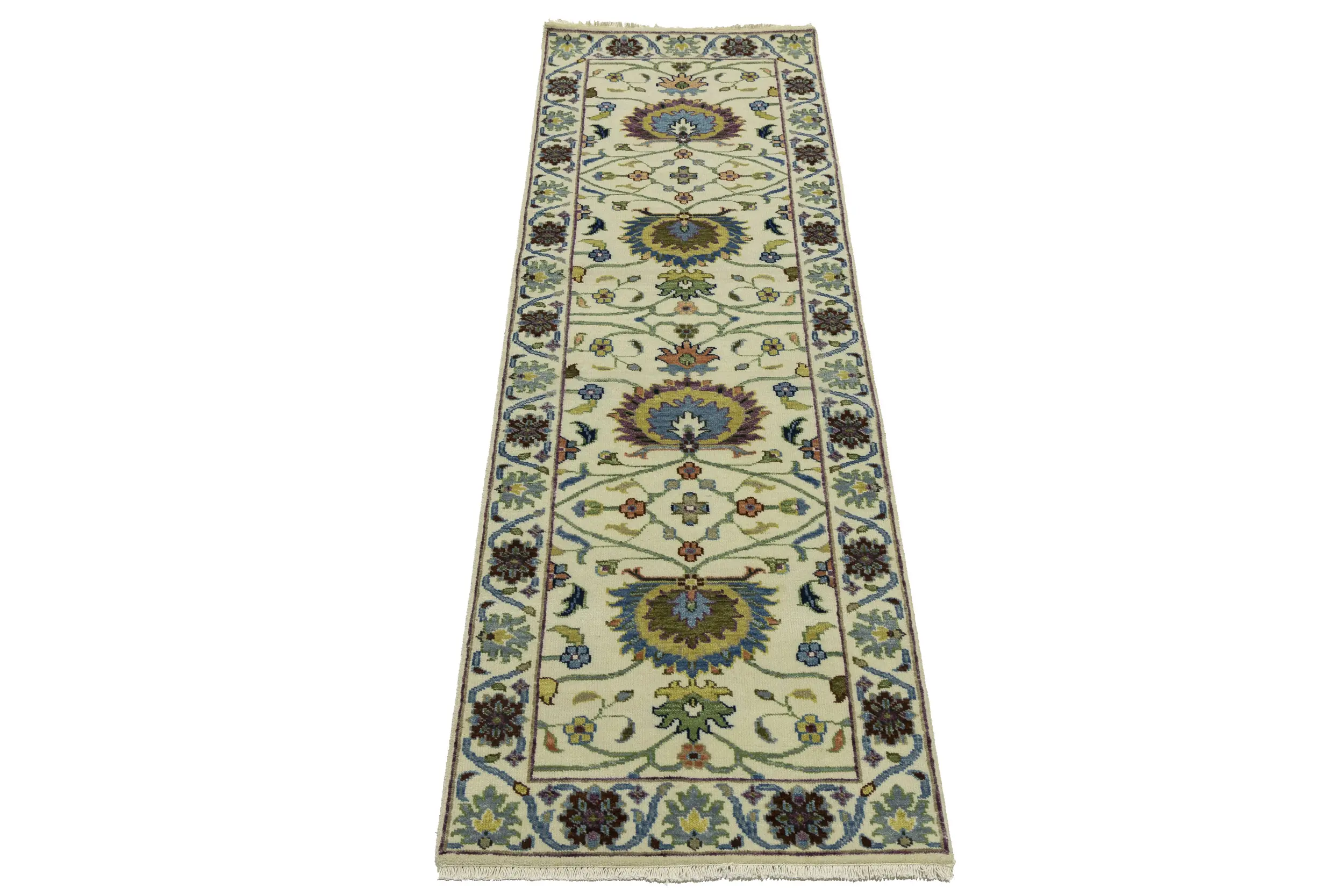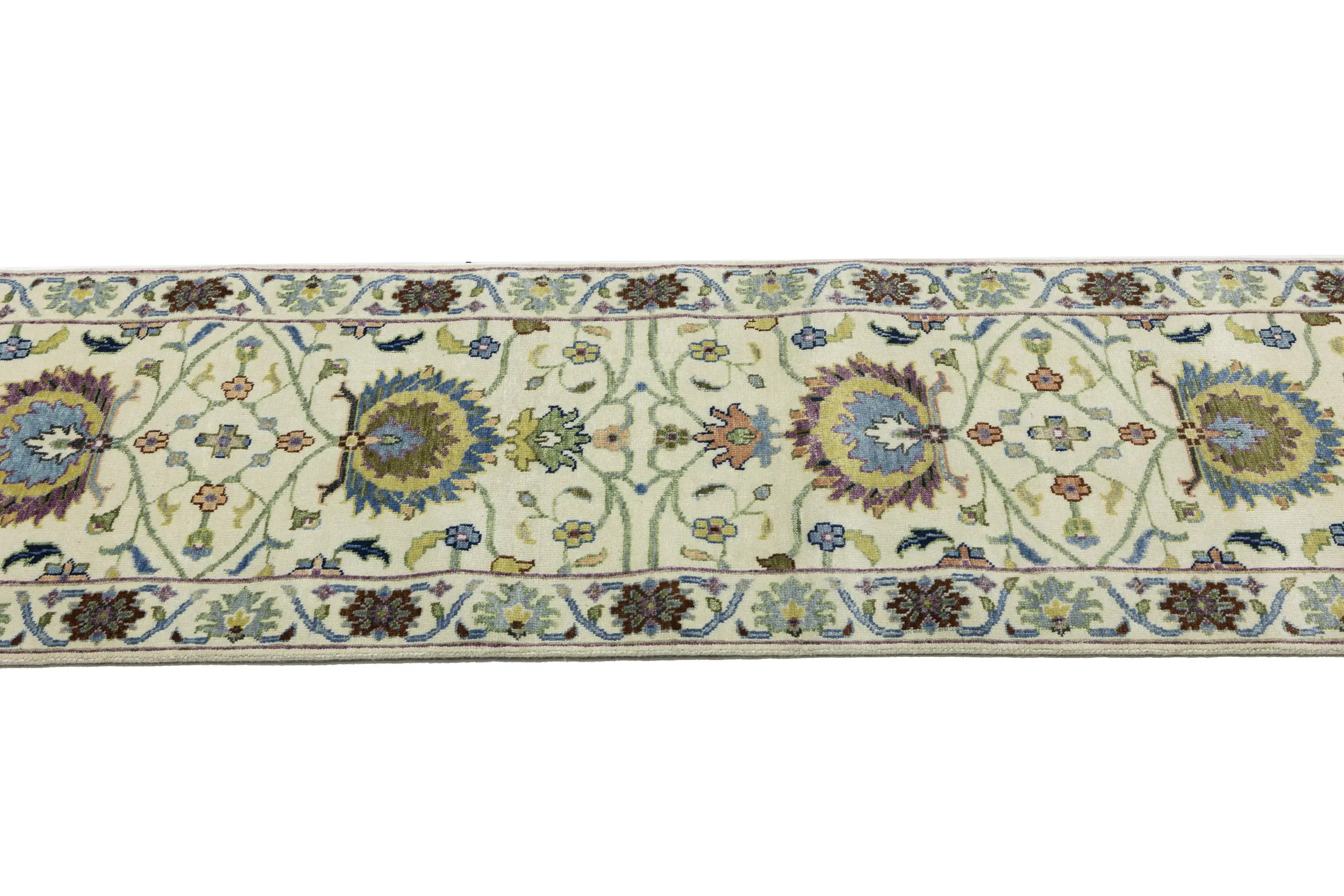 This genuine 3X8 cream new Oriental runner was made by the hands of gifted weavers inspired by a variety of spectacular artistic designs, to recreate the aged look of the original piece with a richness of color and ornately patterned background field. What set this vintage style Oriental area runner from the others are the material and dye used (wool pile and cotton foundation), knot count, ancient designs, fantastic grades, and its regional historical connection: it has deep roots, from the story of the people who produced it to the meaning of the symbols and colors displayed across its canvas that have been praised for centuries. This Indian home décor carpet will be completely cozy and inviting that never will go out of style! Also, this Oriental runner would be among your most valuable treasures, it is a great investment that accrues value over time, and it will last for generations because was woven with high-quality, all-natural wool. Environmentally friendly, opulent yet affordable; this rug will give you a thorough amount of character to help define your living space with elegance and warmth that will capture the eyes and attention of your audience (homeowners, designers, decorators, family and friends).