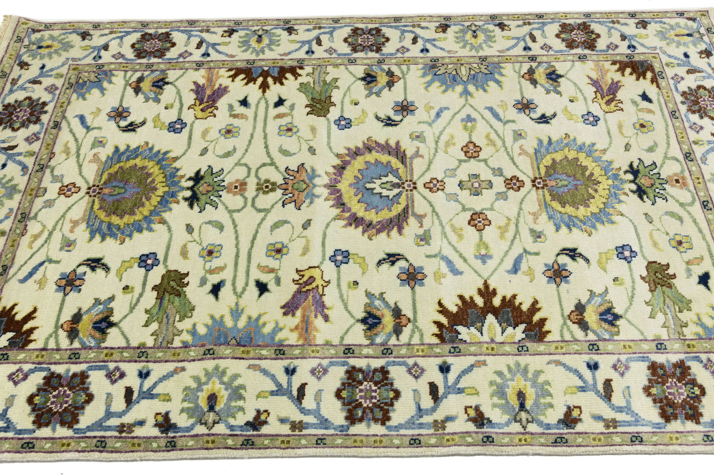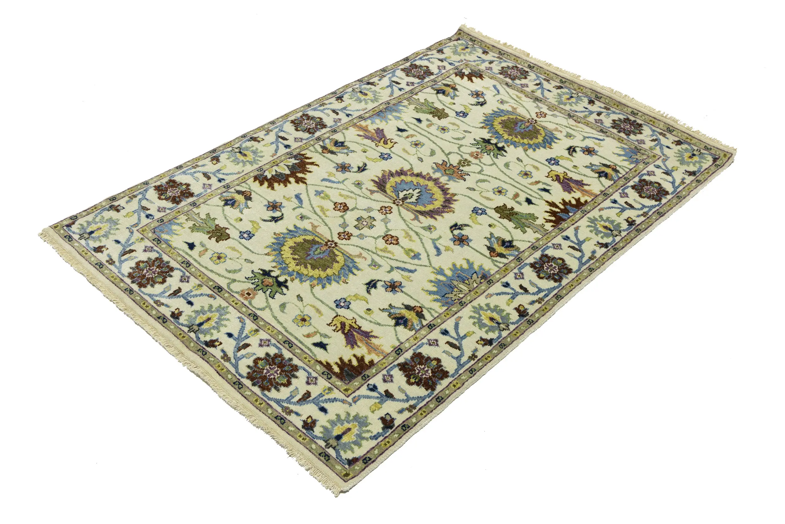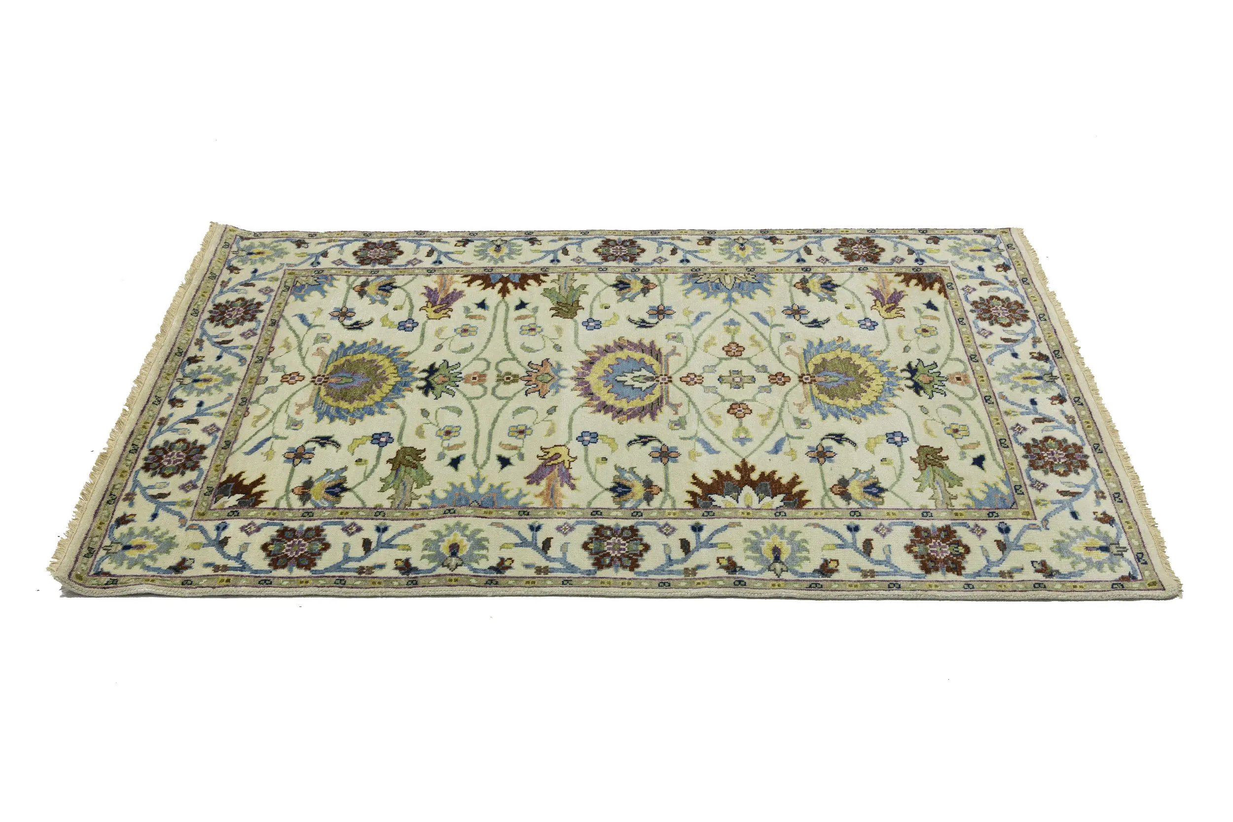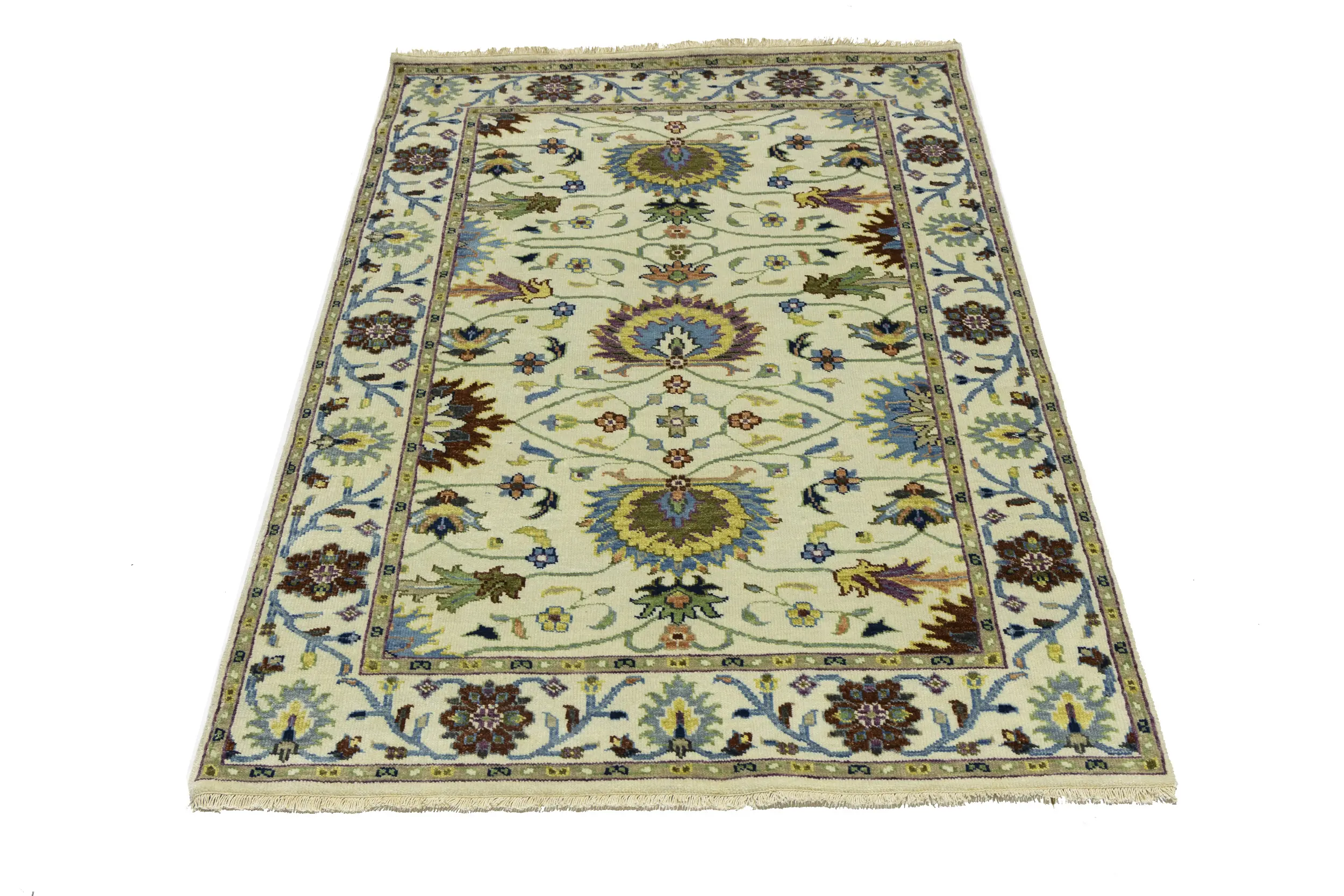 This genuine 4x6 cream new Oriental rug was made by the hands of gifted weavers inspired by a variety of spectacular artistic designs, to recreate the aged look of the original piece with a richness of color and ornately patterned background field. What set this vintage style Oriental area rug from the others are the material and dye used (wool pile and cotton foundation), knot count, ancient designs, fantastic grades, and its regional historical connection: it has deep roots, from the story of the people who produced it to the meaning of the symbols and colors displayed across its canvas that have been praised for centuries. This Indian home décor carpet will be completely cozy and inviting that never will go out of style! Also, this Oriental rug would be among your most valuable treasures, it is a great investment that accrues value over time, and it will last for generations because was woven with high-quality, all-natural wool. Environmentally friendly, opulent yet affordable; this rug will give you a thorough amount of character to help define your living space with elegance and warmth that will capture the eyes and attention of your audience (homeowners, designers, decorators, family and friends). OT-11338