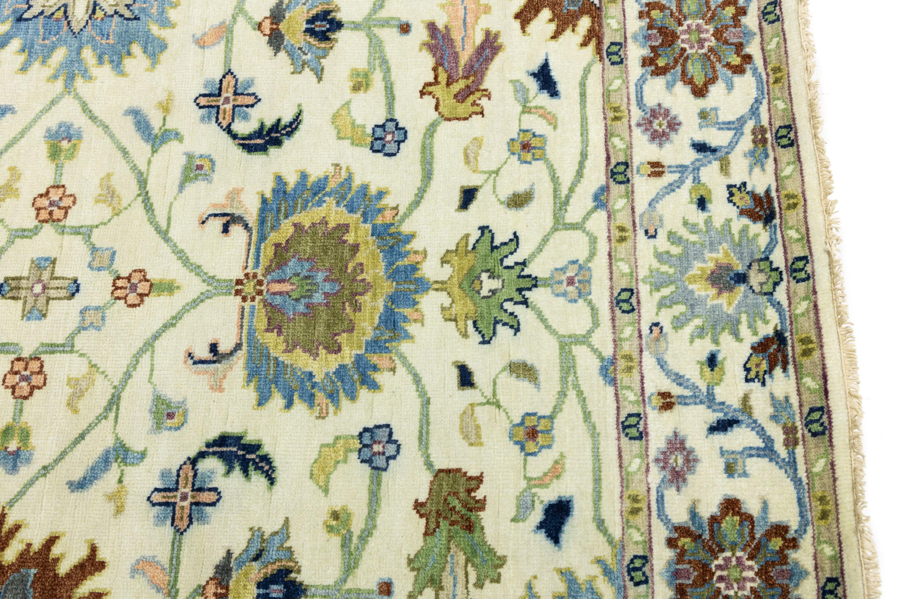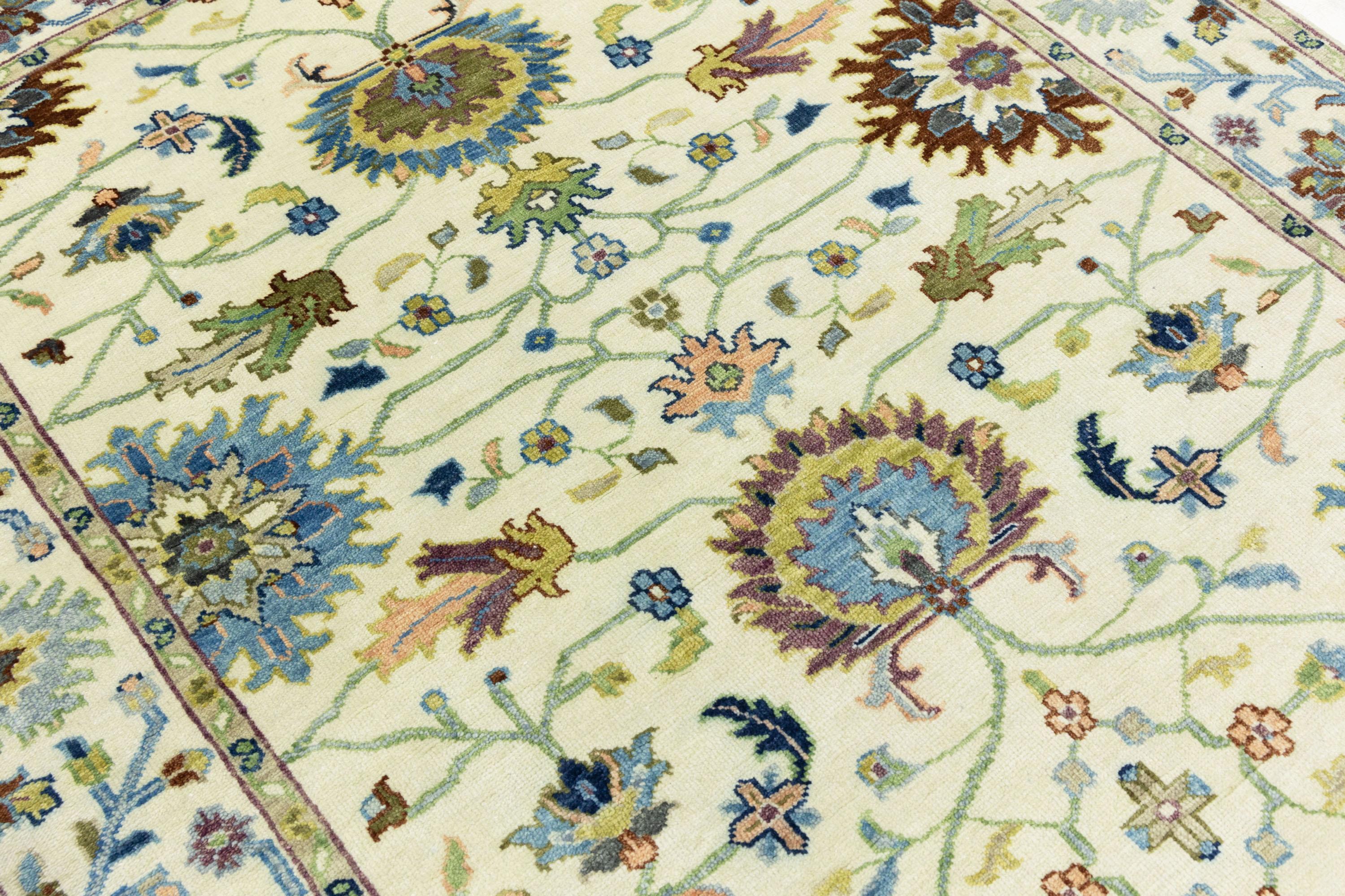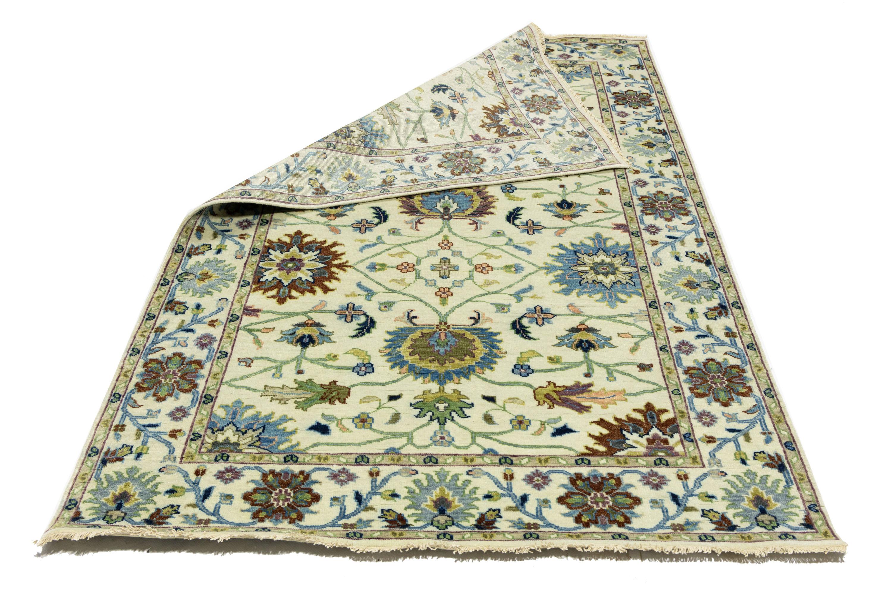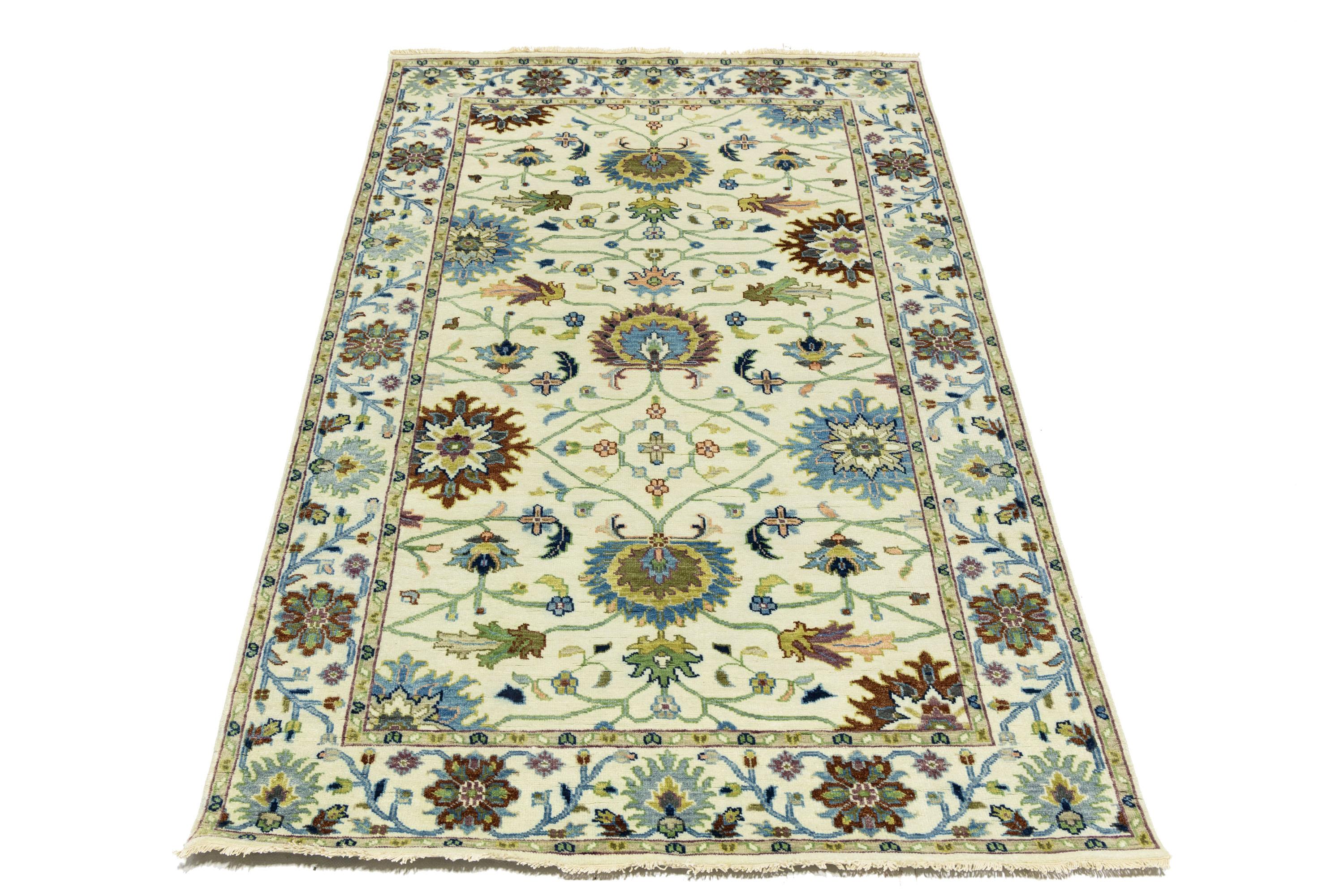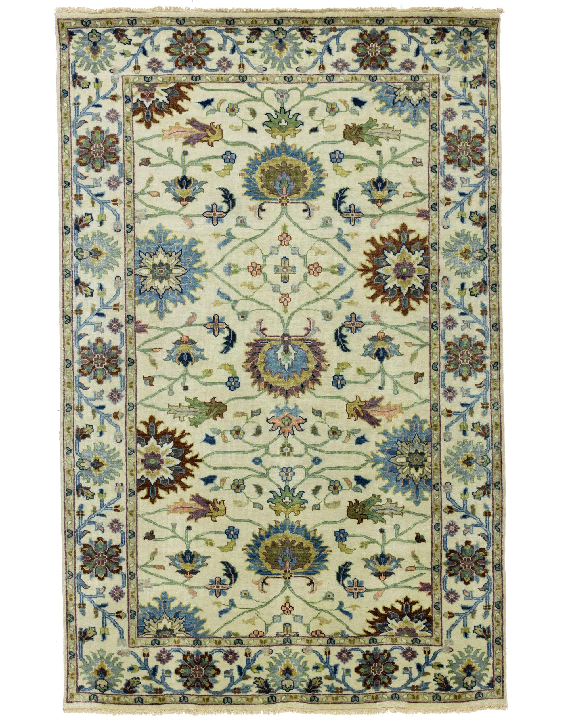 This genuine 5x8 cream new Oriental rug was made by the hands of gifted weavers inspired by a variety of spectacular artistic designs, to recreate the aged look of the original piece with a richness of color and ornately patterned background field. What set this vintage style Oriental area rug from the others are the material and dye used (wool pile and cotton foundation), knot count, ancient designs, fantastic grades, and its regional historical connection: it has deep roots, from the story of the people who produced it to the meaning of the symbols and colors displayed across its canvas that have been praised for centuries. This Indian home décor carpet will be completely cozy and inviting that never will go out of style! Also, this Oriental rug would be among your most valuable treasures, it is a great investment that accrues value over time, and it will last for generations because was woven with high-quality, all-natural wool. Environmentally friendly, opulent yet affordable; this rug will give you a thorough amount of character to help define your living space with elegance and warmth that will capture the eyes and attention of your audience (homeowners, designers, decorators, family and friends). OT-11956