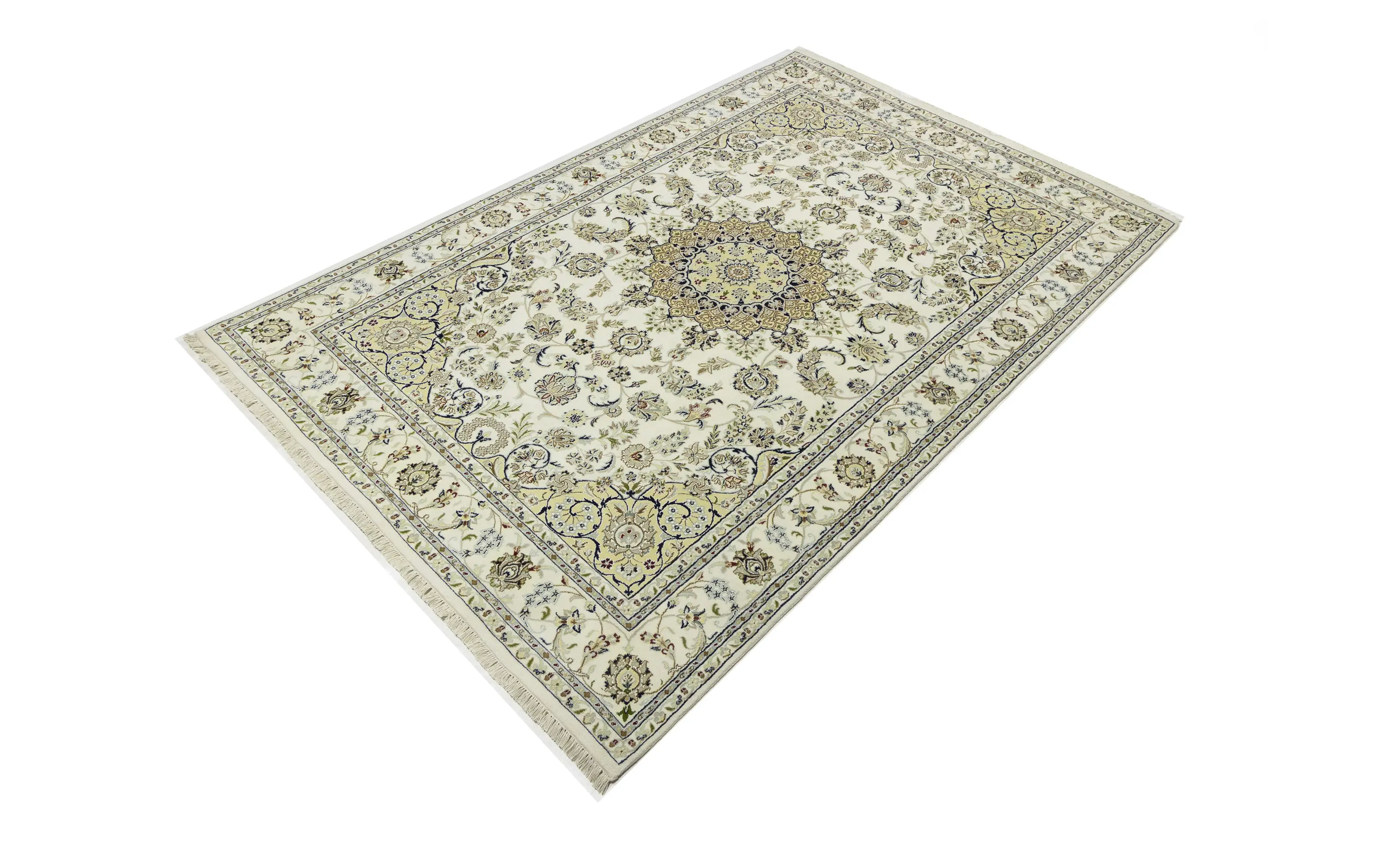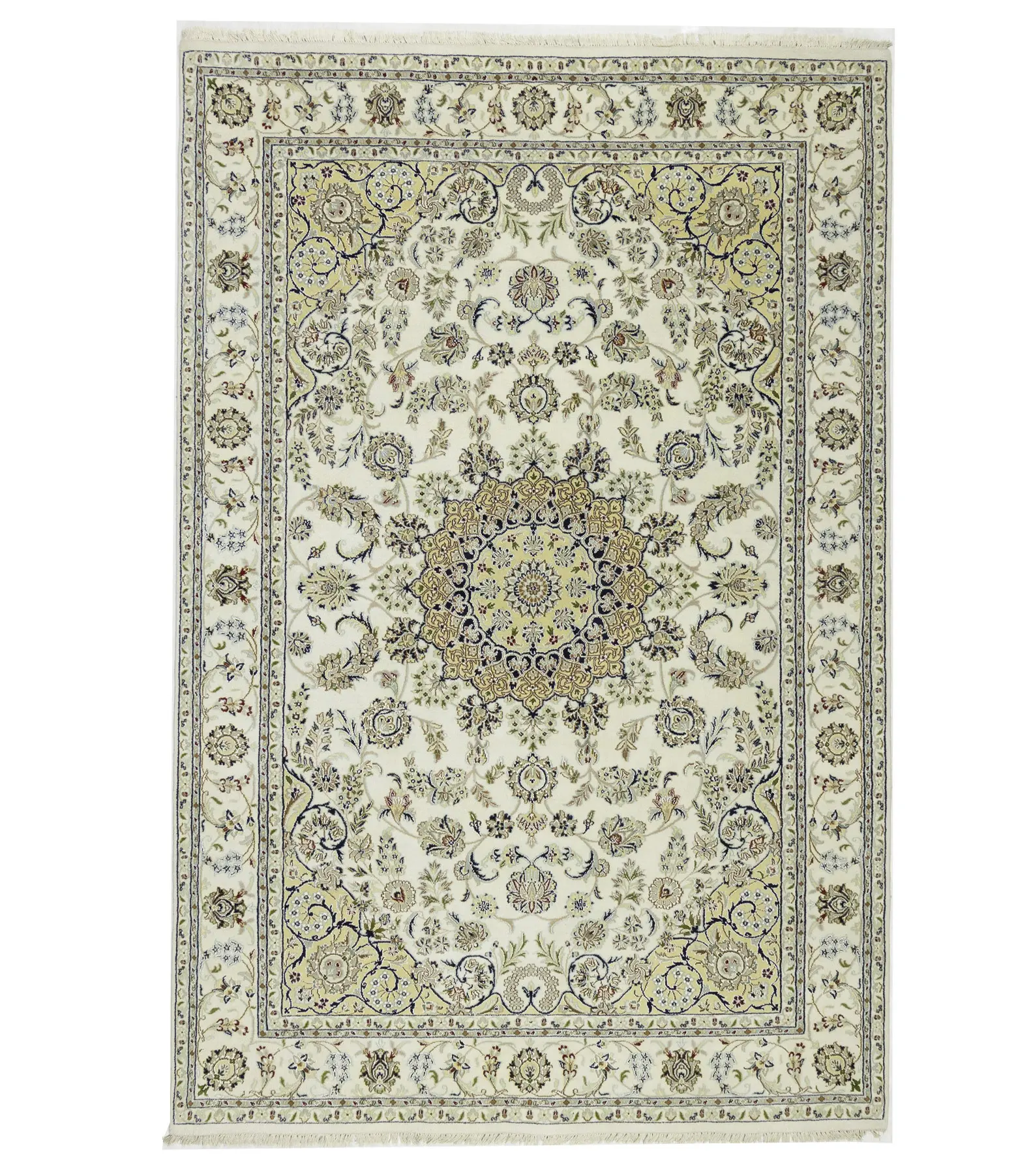 Handmade 6'7X10 cream Oriental rug made with vegetable dyes (fine wool pile and cotton foundation), exceptional knot count, and appealing ancient designs. This Oriental rug never will go out of style and would be among your most valuable treasures.