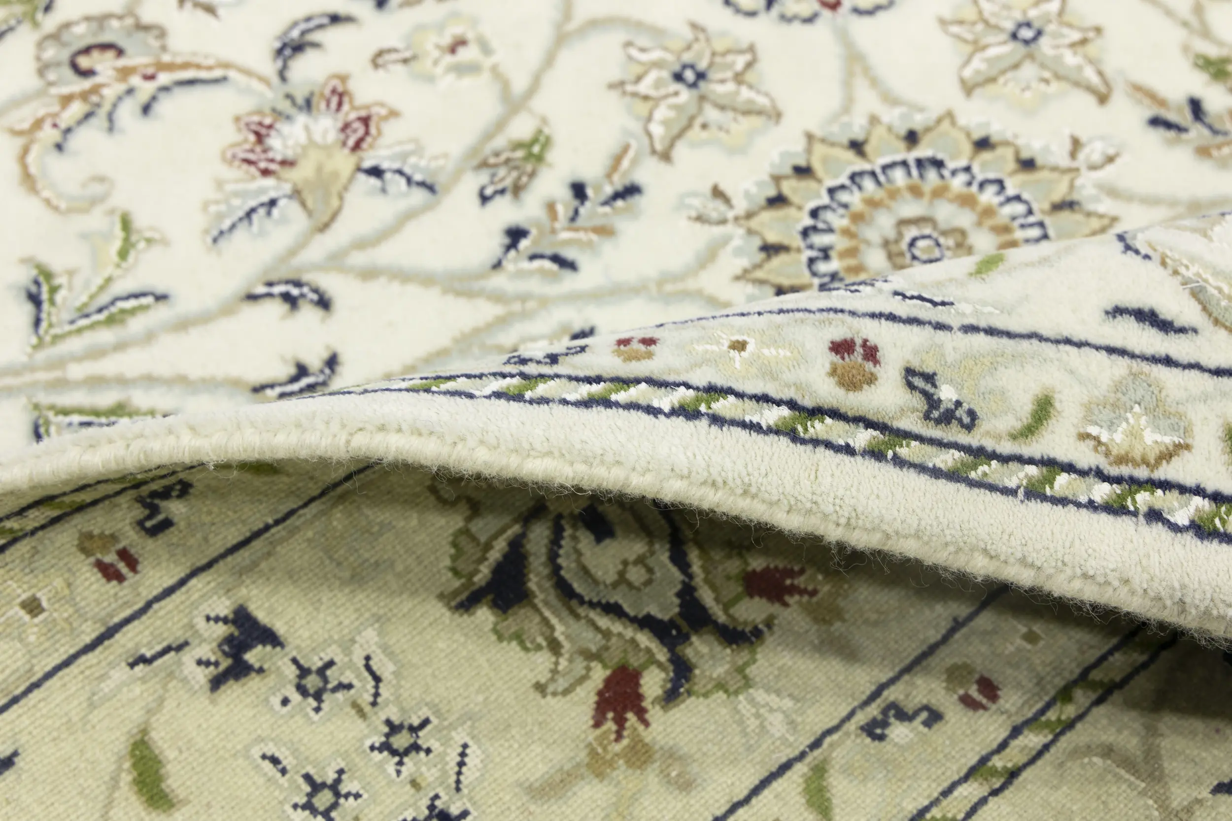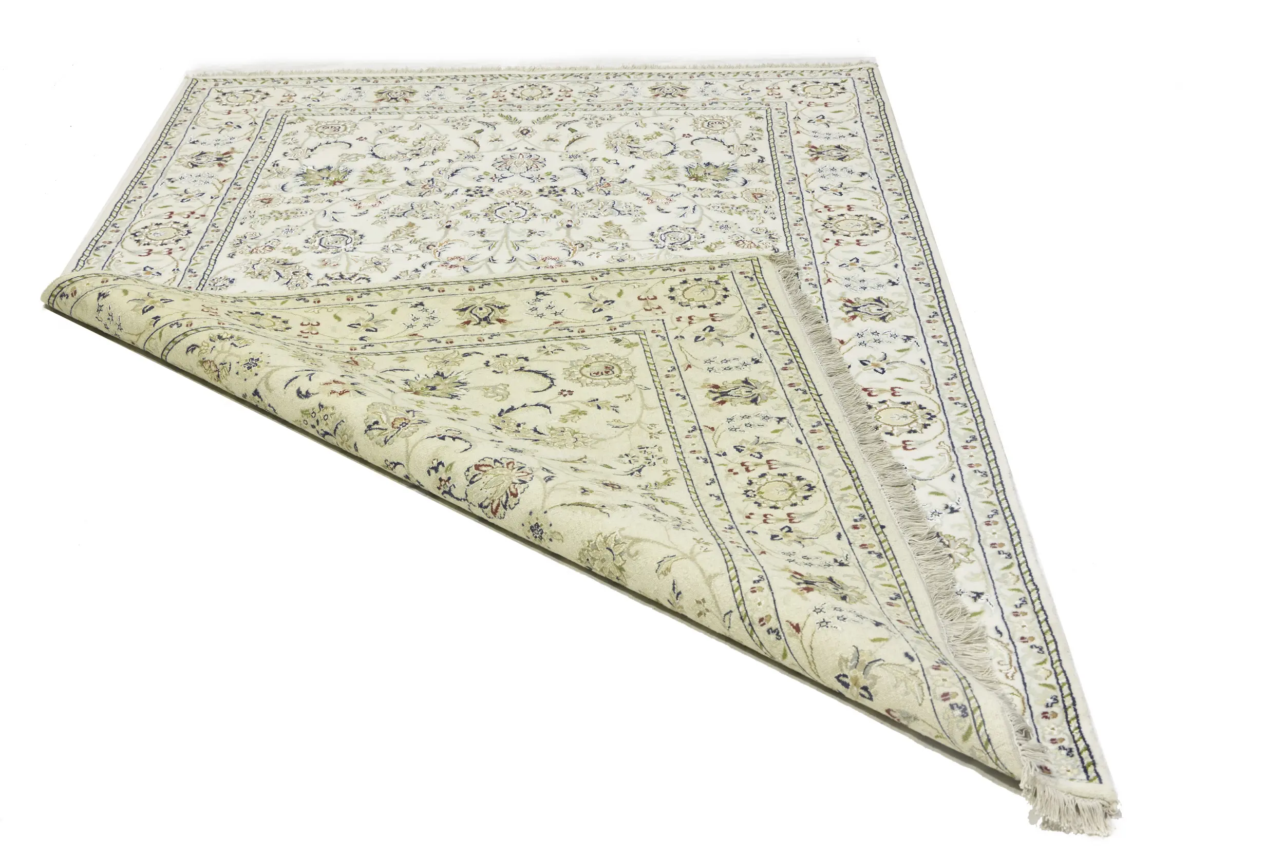 Handmade 6X9 cream Oriental rug made with vegetable dyes (fine wool pile and cotton foundation), exceptional knot count, and appealing ancient designs. This Oriental rug never will go out of style and would be among your most valuable treasures.