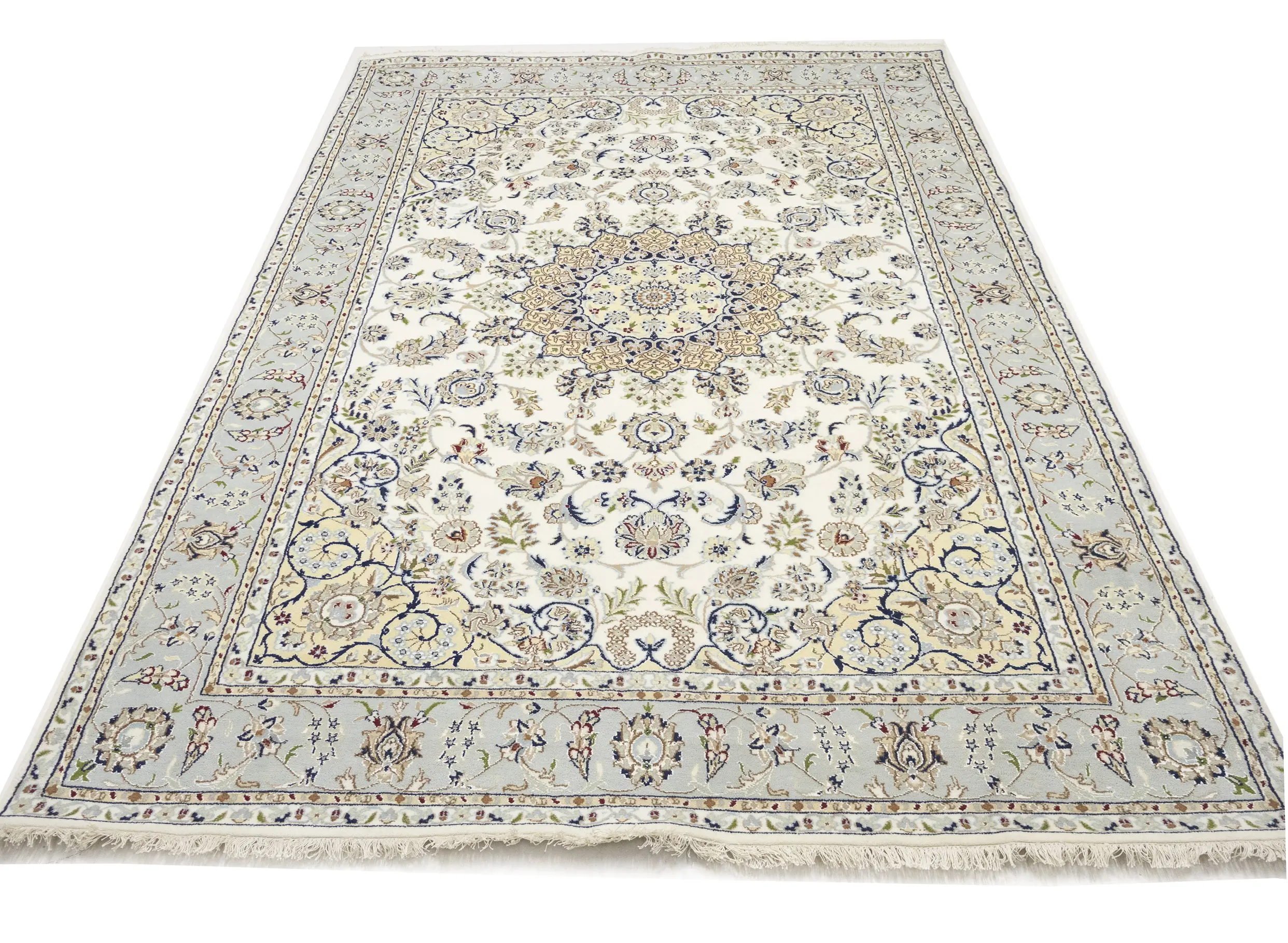 Handmade 7X10 cream Oriental rug made with vegetable dyes (fine wool pile and cotton foundation), exceptional knot count, and appealing ancient designs. This Oriental rug never will go out of style and would be among your most valuable treasures.