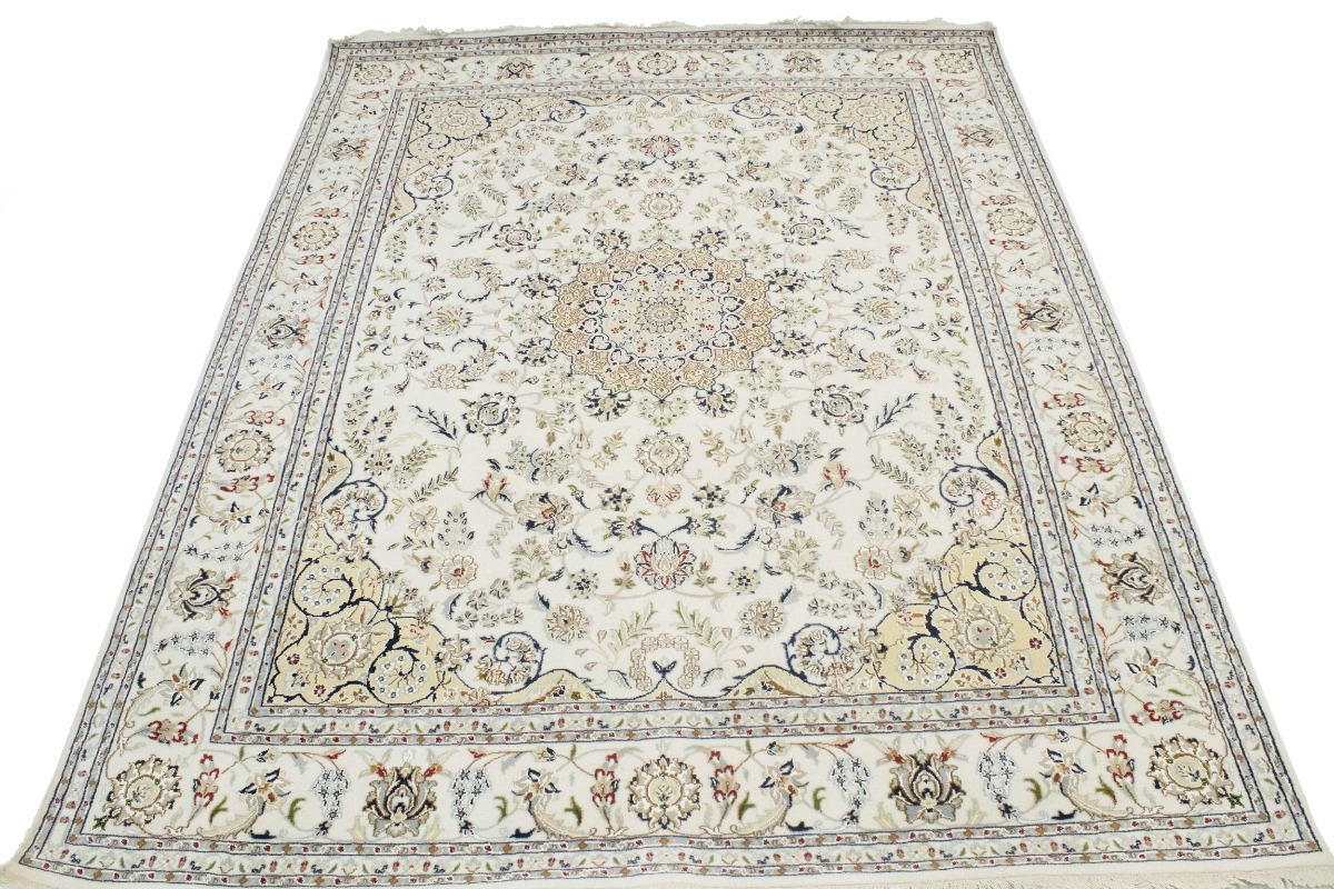Handmade 8X10 cream Oriental rug made with vegetable dyes (fine wool pile and cotton foundation), superior knot count, and alluring ancient designs. This Oriental rug never will go out of style and would be among your most valuable treasures.
