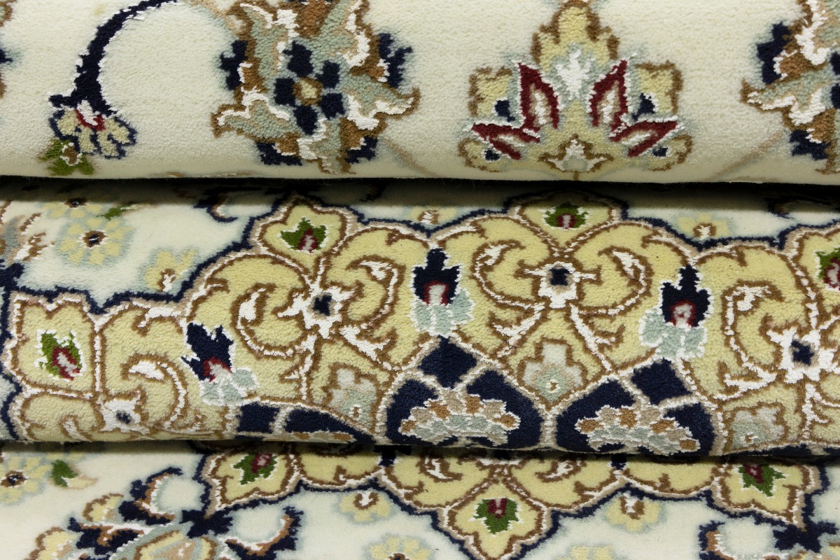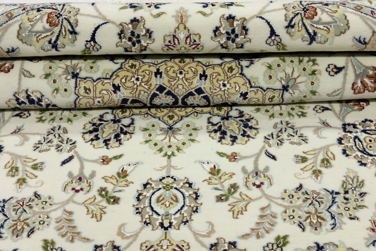 Handmade 9X9 cream oriental rug made with vegetable dyes (fine wool pile and cotton foundation), exceptional knot count, and appealing ancient designs. This Oriental rug never will go out of style and would be among your most valuable treasures.