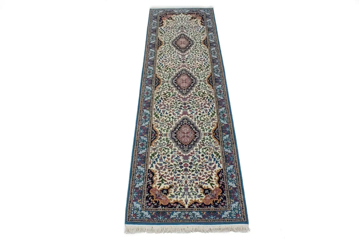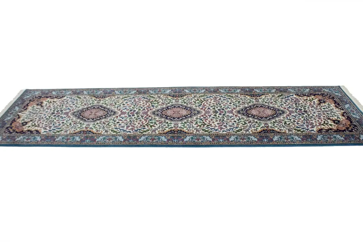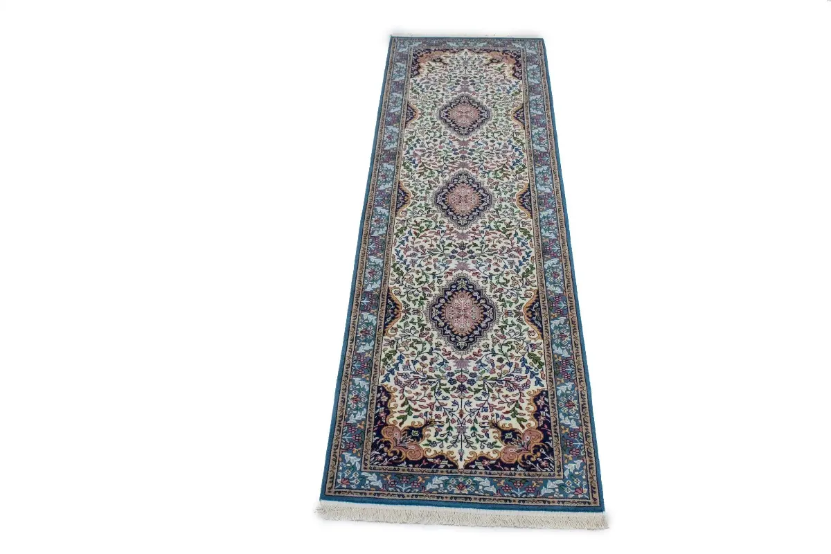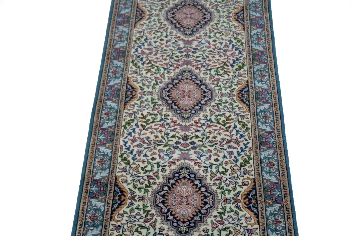 Hand Knotted 3X10 cream runner made with vegetable dyes (fine wool pile and cotton foundation), superior knot count, and appealing ancient designs. This Oriental runner never will go out of style and would be among your most valuable treasures.