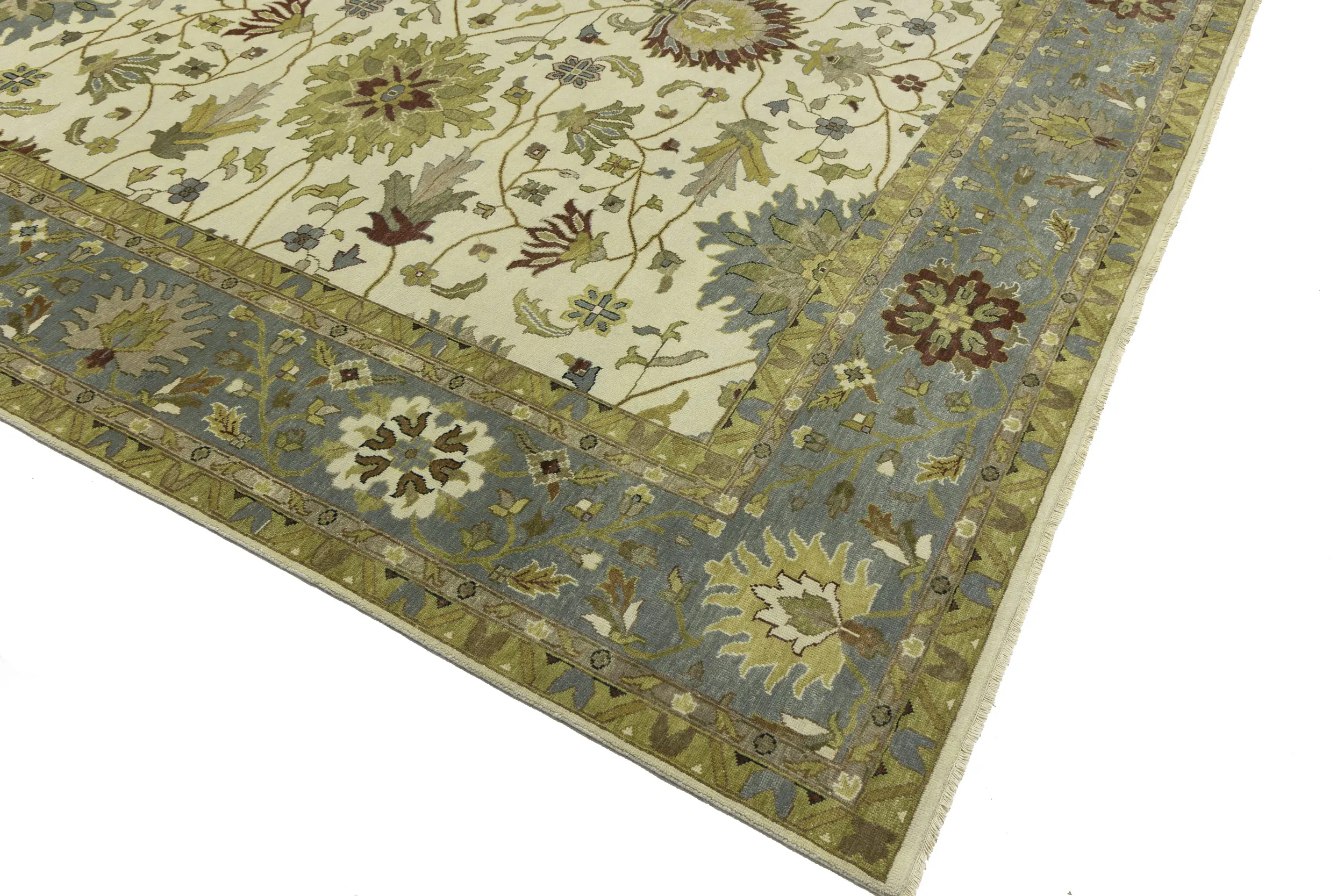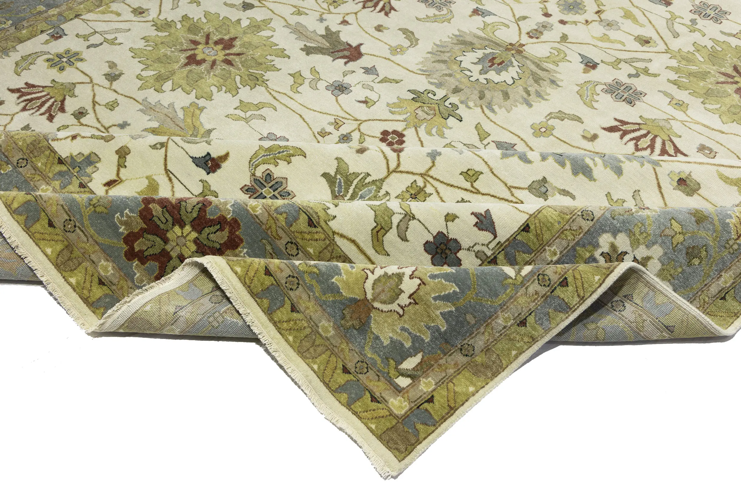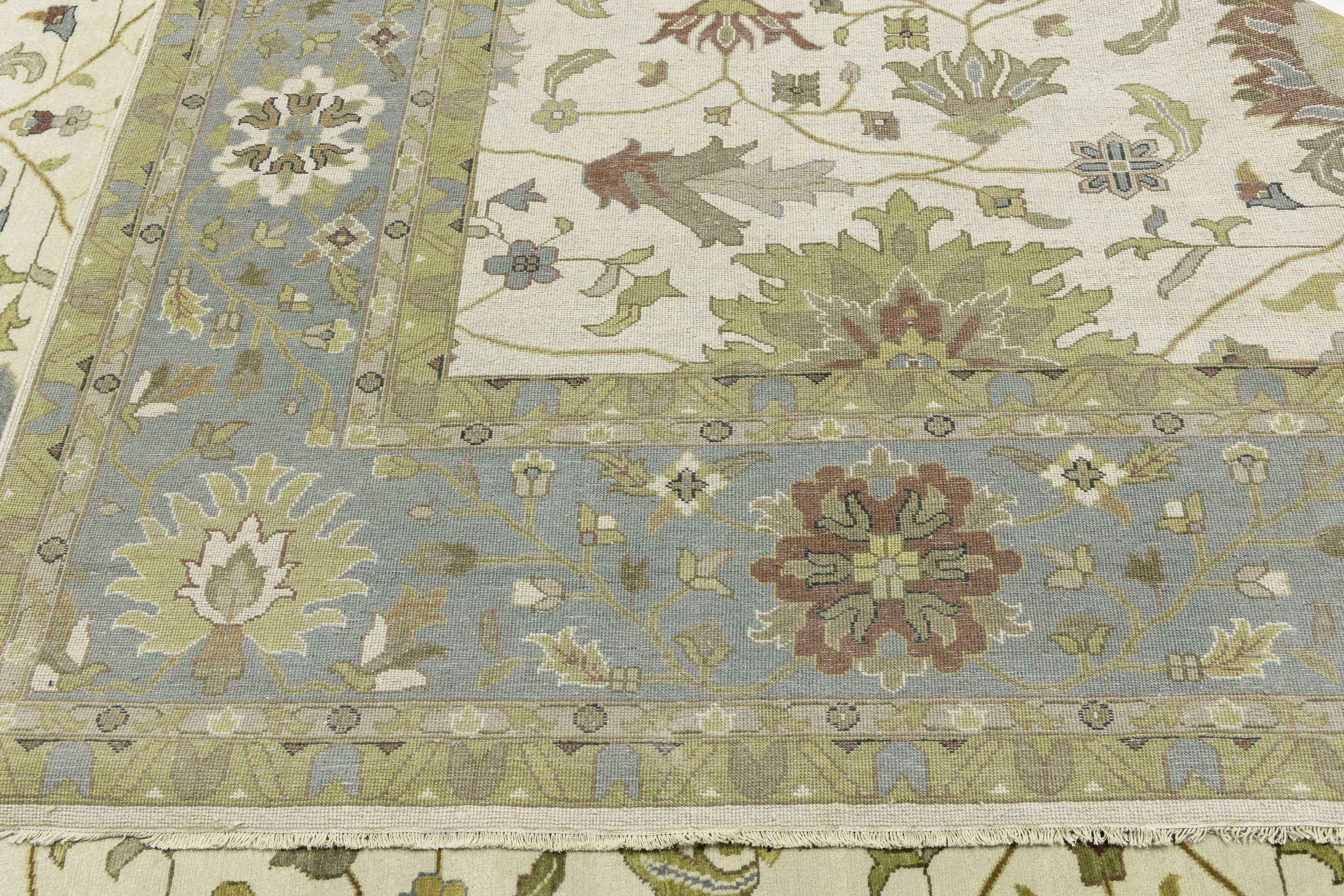 This authentic 12X15 cream new Oriental rug was crafted by the hands of skilled weavers enthused by a variety of lovely artistic designs, to recreate the aged look of the unique piece with a richness of color and beautifully elaborated background field. What set this vintage style Oriental area rug from the others are the material and dye used (wool pile and cotton foundation), knot count, ancient designs, fantastic grades, and its regional historical connection: it has deep roots, from the story of the people who produced it to the meaning of the symbols and colors displayed across its canvas that have been praised for centuries. This Indian home décor carpet will be completely cozy and inviting that never will go out of style! Also, this Oriental rug would be among your most valuable treasures, it is a great investment that increase in value over time, and it will last for generations because was woven with high-quality, all-natural wool. Environmentally friendly, opulent yet affordable; this rug/runner will give you a thorough amount of character to help define your living space with sophistication and warmth that will capture the eyes and attention of your audience (homeowners, designers, decorators, family and friends).
