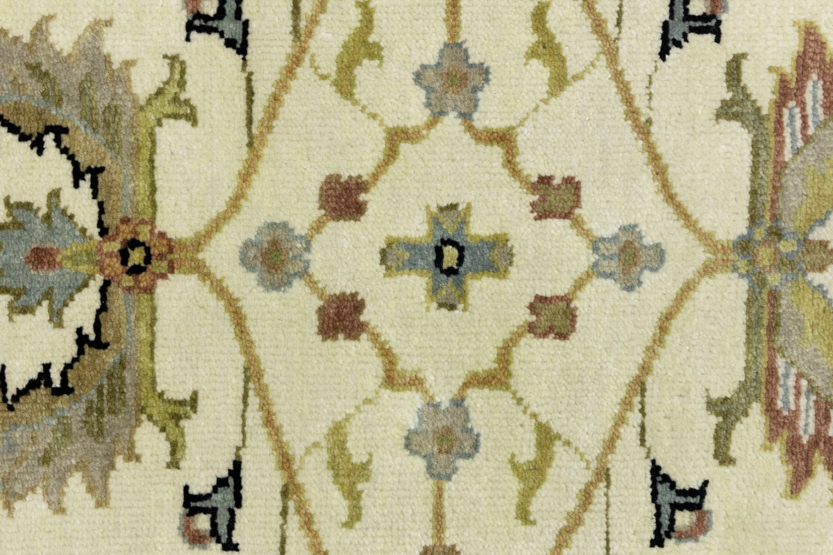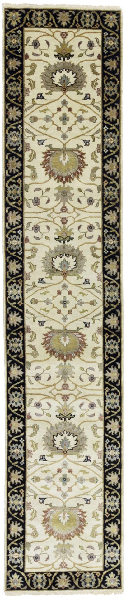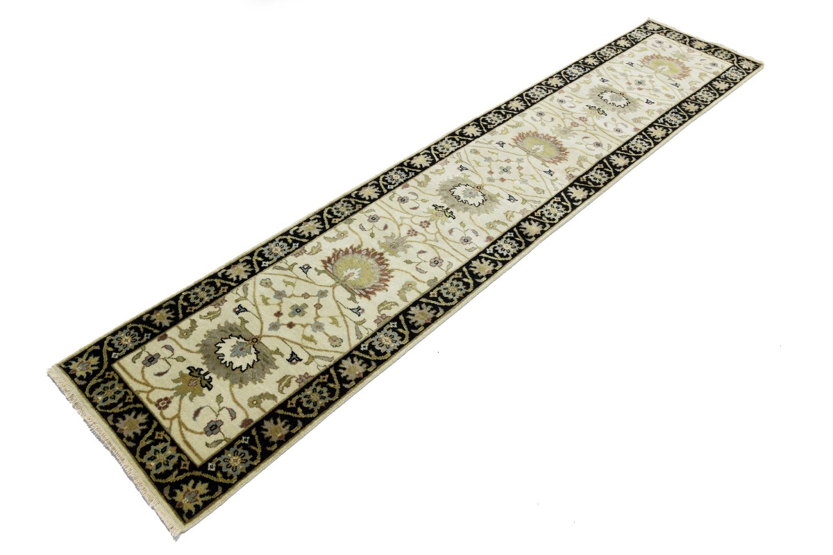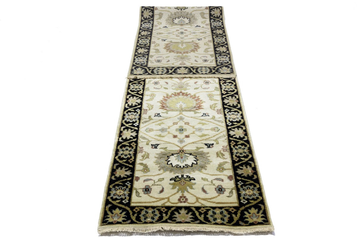This authentic 2'5X12 cream new Oriental runner was crafted by the hands of skilled weavers enthused by a variety of lovely artistic designs, to recreate the aged look of the unique piece with a richness of color and beautifully elaborated background field. What set this vintage style Oriental area runner from the others are the material and dye used (wool pile and cotton foundation), knot count, ancient designs, fantastic grades, and its regional historical connection: it has deep roots, from the story of the people who produced it to the meaning of the symbols and colors displayed across its canvas that have been praised for centuries. This Indian home décor carpet will be completely cozy and inviting that never will go out of style! Also, this Oriental rug would be among your most valuable treasures, it is a great investment that increase in value over time, and it will last for generations because was woven with high-quality, all-natural wool. Environmentally friendly, opulent yet affordable; this runner will give you a thorough amount of character to help define your living space with sophistication and warmth that will capture the eyes and attention of your audience (homeowners, designers, decorators, family and friends). OT-9053