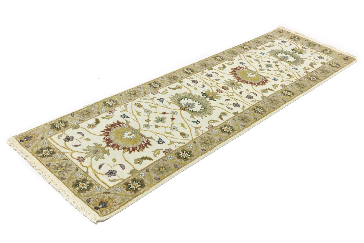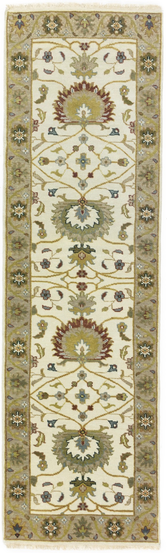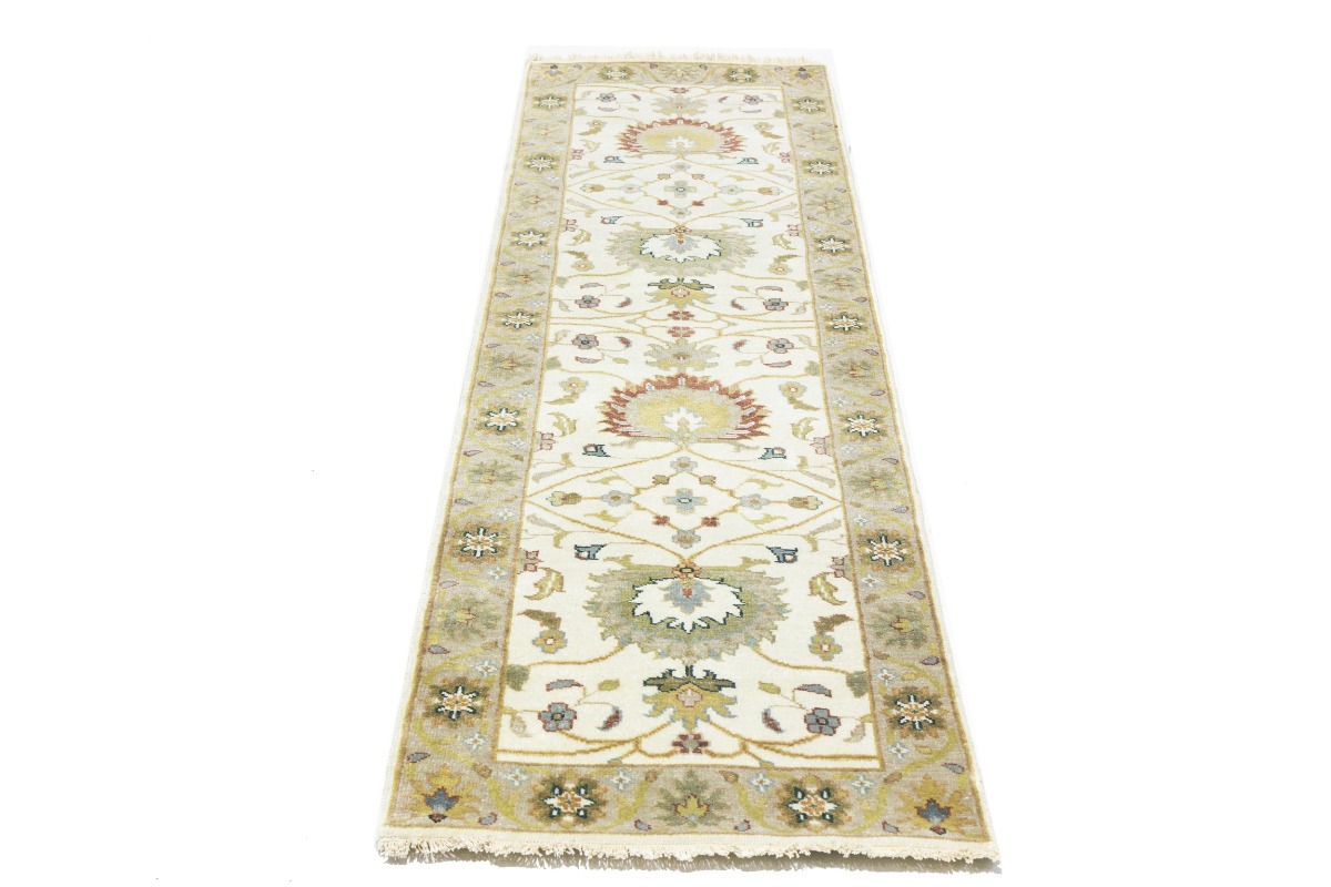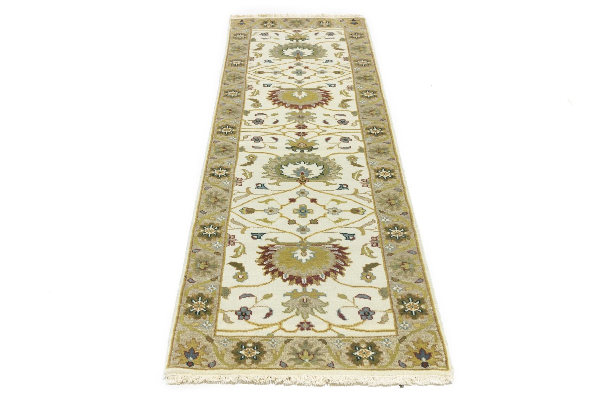 Handmade 2'5X8 cream oriental runner made with vegetable dyes (fine wool pile and cotton foundation), superior knot count, and appealing ancient designs. This Oriental runner never will go out of style and would be among your most valuable treasures.