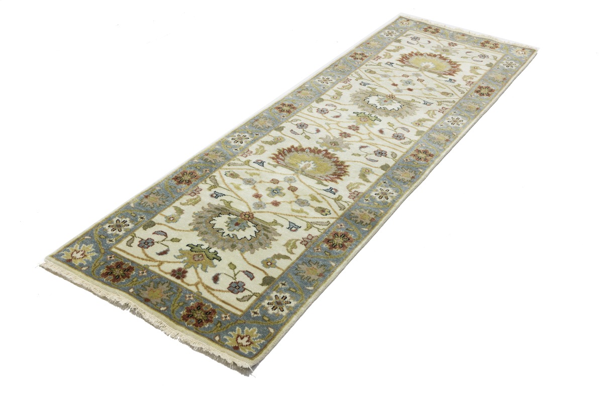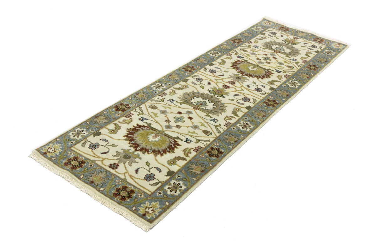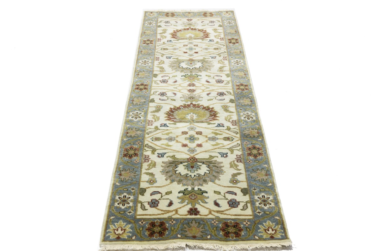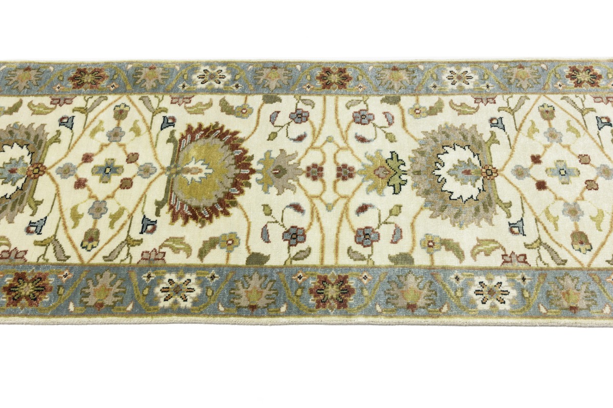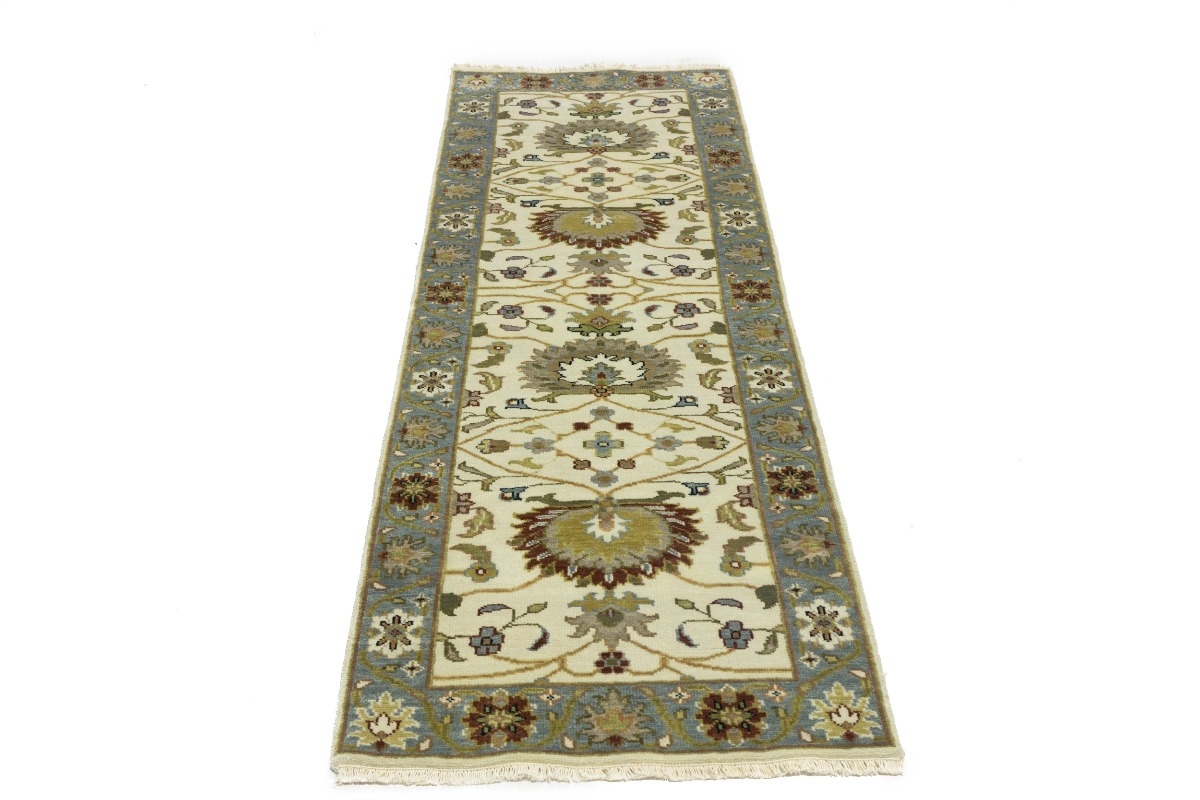Hand Knotted 2'5X8 cream oriental runner made with natural dyes (fine wool pile and cotton foundation), superior knot count, and appealing ancient designs. This Oriental runner never will go out of style and would be among your most valuable treasures.