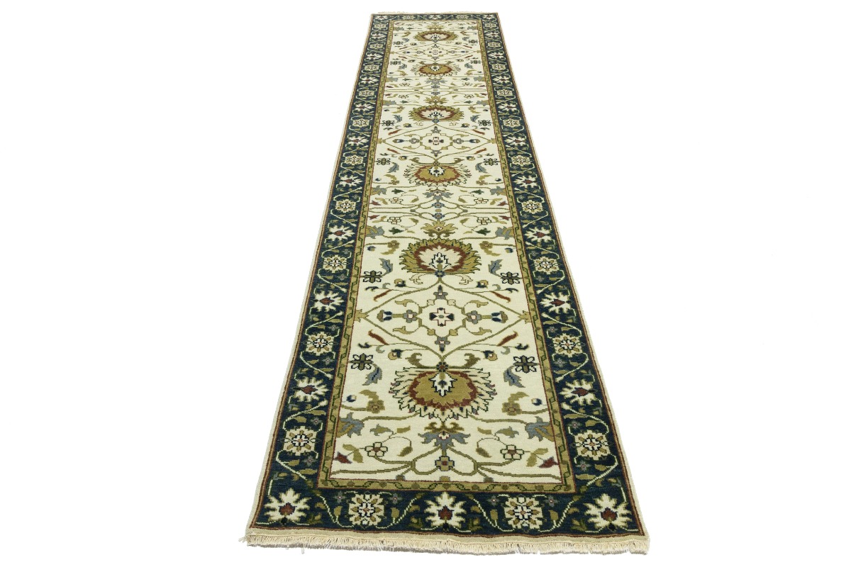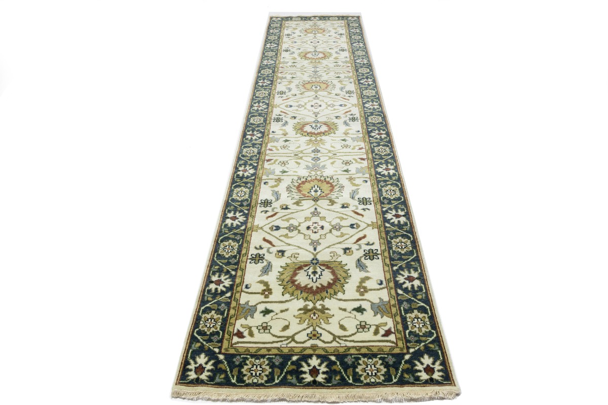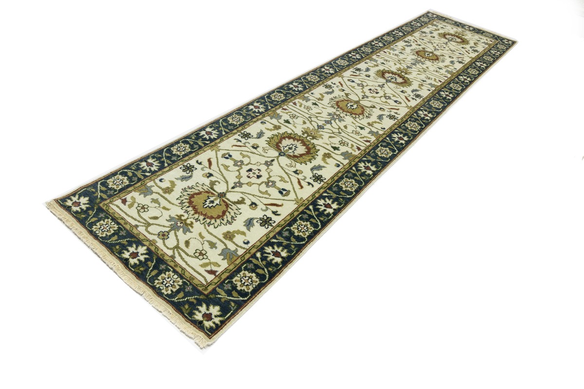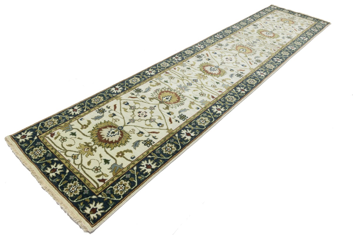 This authentic 3X13 cream new Oriental runner was crafted by the hands of skilled weavers enthused by a variety of lovely artistic designs, to recreate the aged look of the unique piece with a richness of color and beautifully elaborated background field. What set this vintage style Oriental area runner from the others are the material and dye used (wool pile and cotton foundation), knot count, ancient designs, fantastic grades, and its regional historical connection: it has deep roots, from the story of the people who produced it to the meaning of the symbols and colors displayed across its canvas that have been praised for centuries. This Indian home décor carpet will be completely cozy and inviting that never will go out of style! Also, this Oriental rug would be among your most valuable treasures, it is a great investment that increase in value over time, and it will last for generations because was woven with high-quality, all-natural wool. Environmentally friendly, opulent yet affordable; this runner will give you a thorough amount of character to help define your living space with sophistication and warmth that will capture the eyes and attention of your audience (homeowners, designers, decorators, family and friends). OT-8320