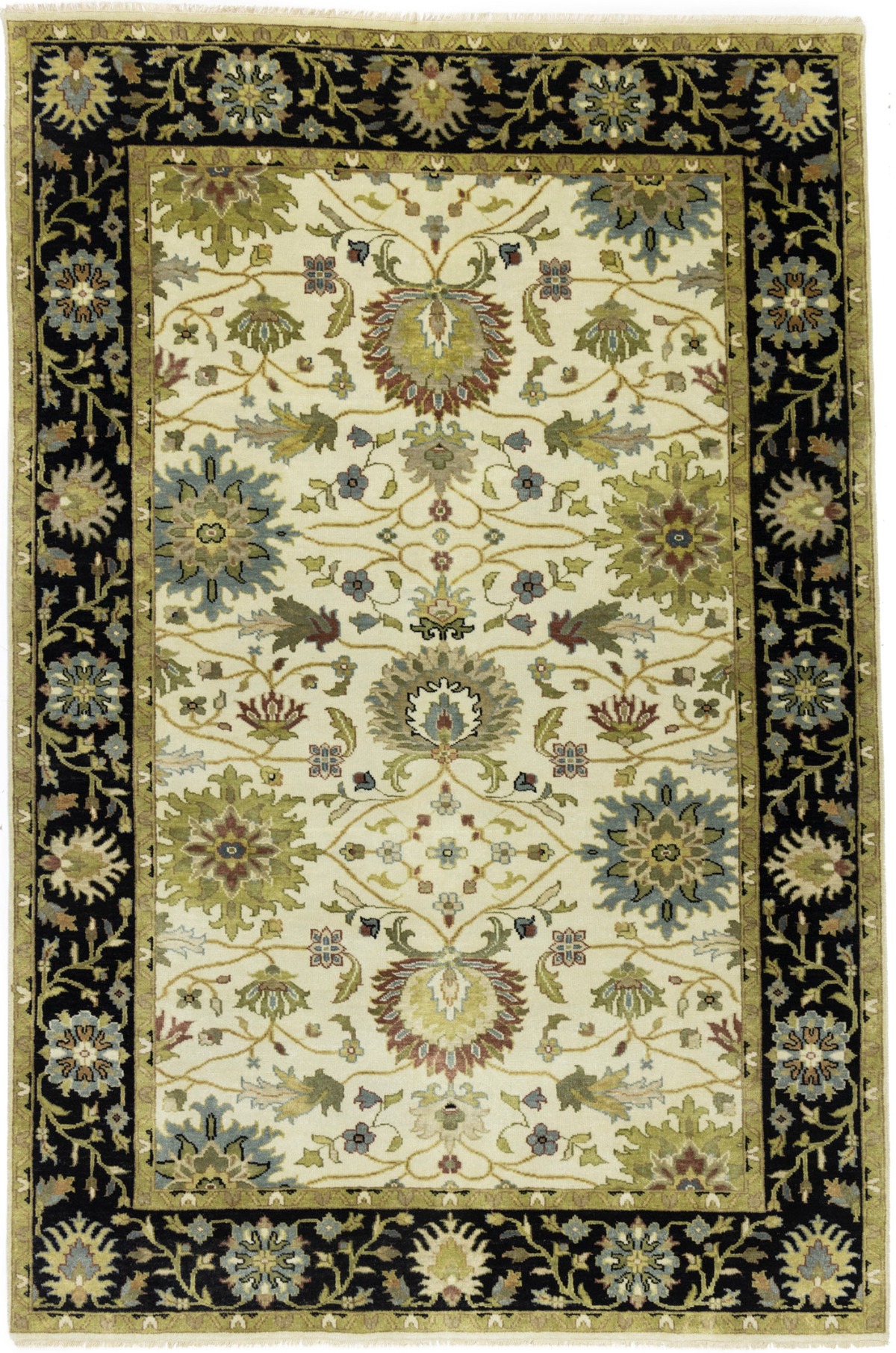 Hand Knotted 6X9 cream Oriental rug made with vegetable dyes (fine wool pile and cotton foundation), superior knot count, and appealing ancient designs. This Oriental rug never will go out of style and would be among your most valuable treasures.